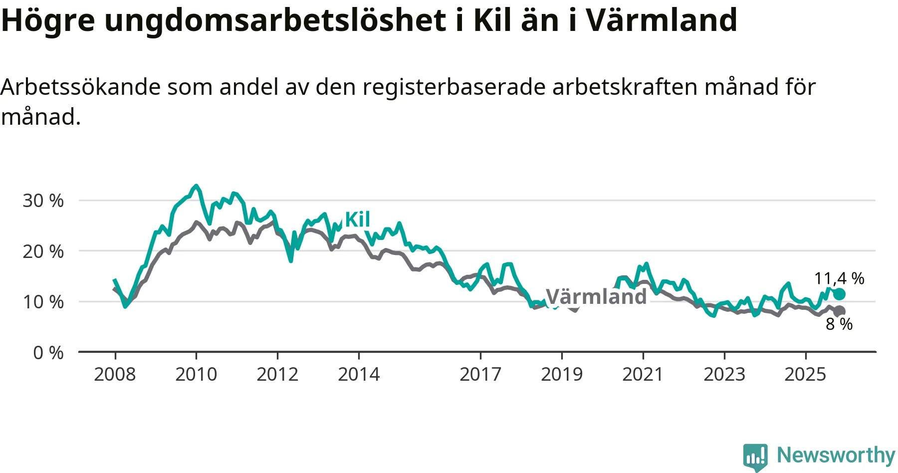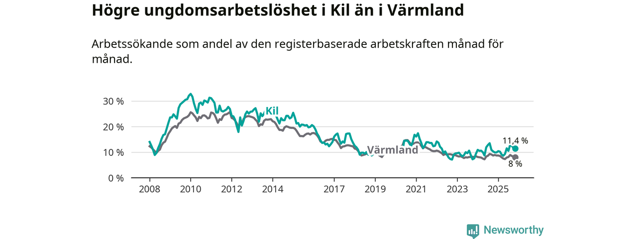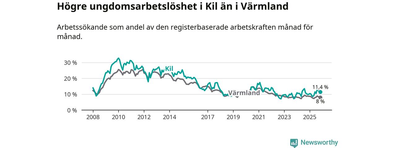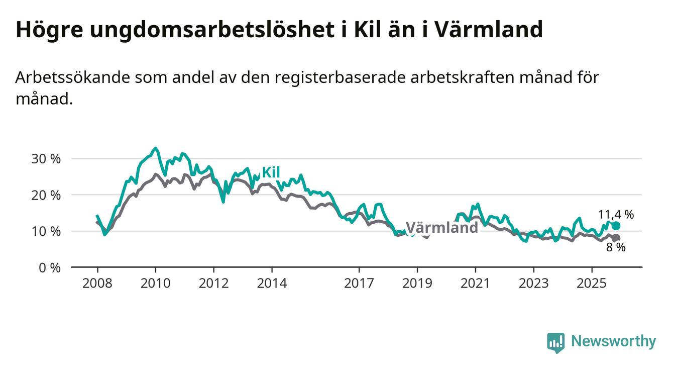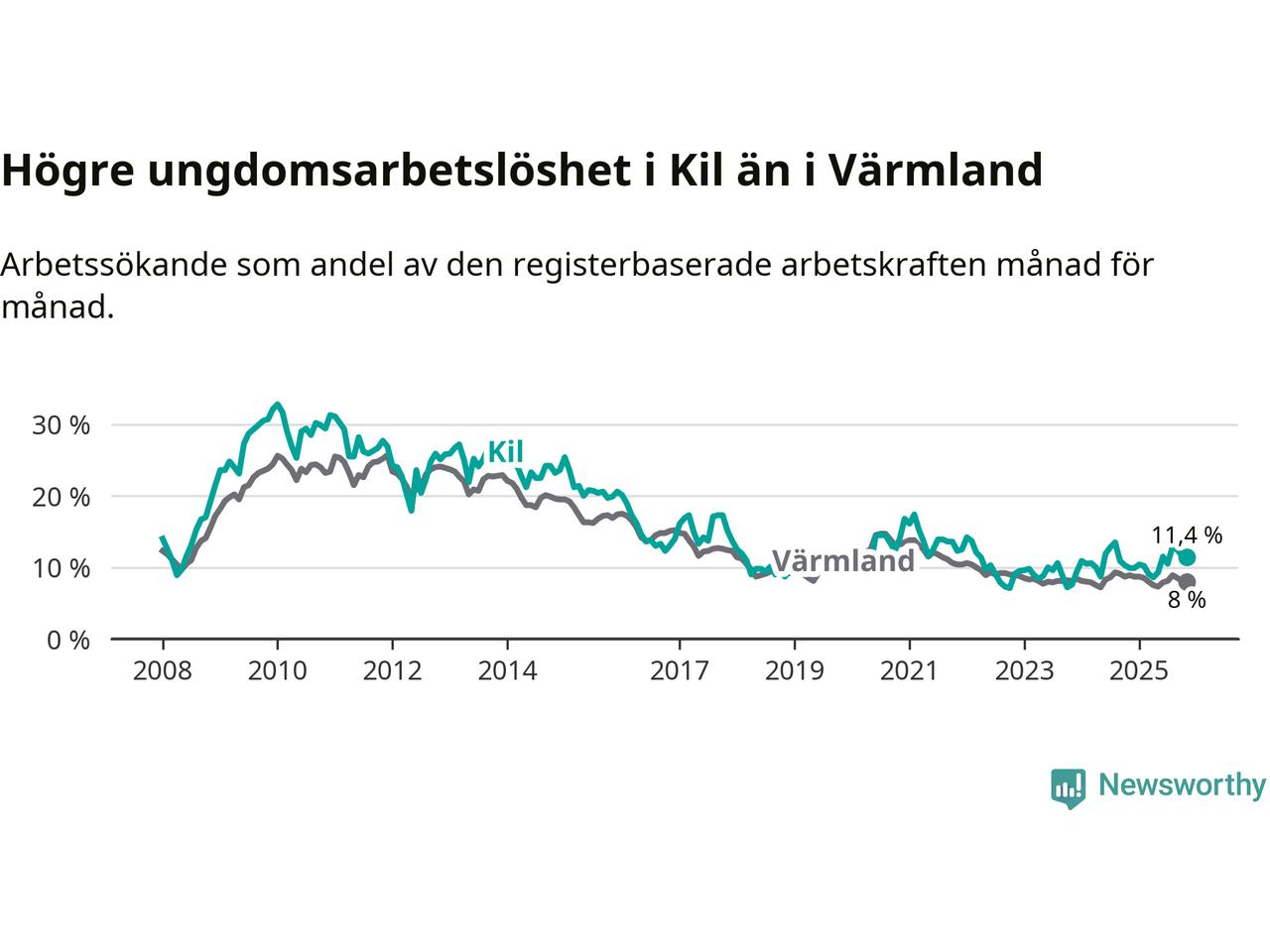 Medan Kil har lägre total arbetslöshet än Värmland, ligger ungdomsarbetslösheten 3,4 procentenheter högre i Kil.