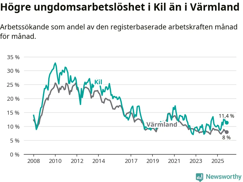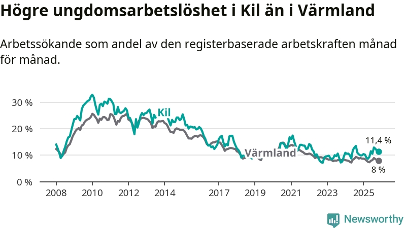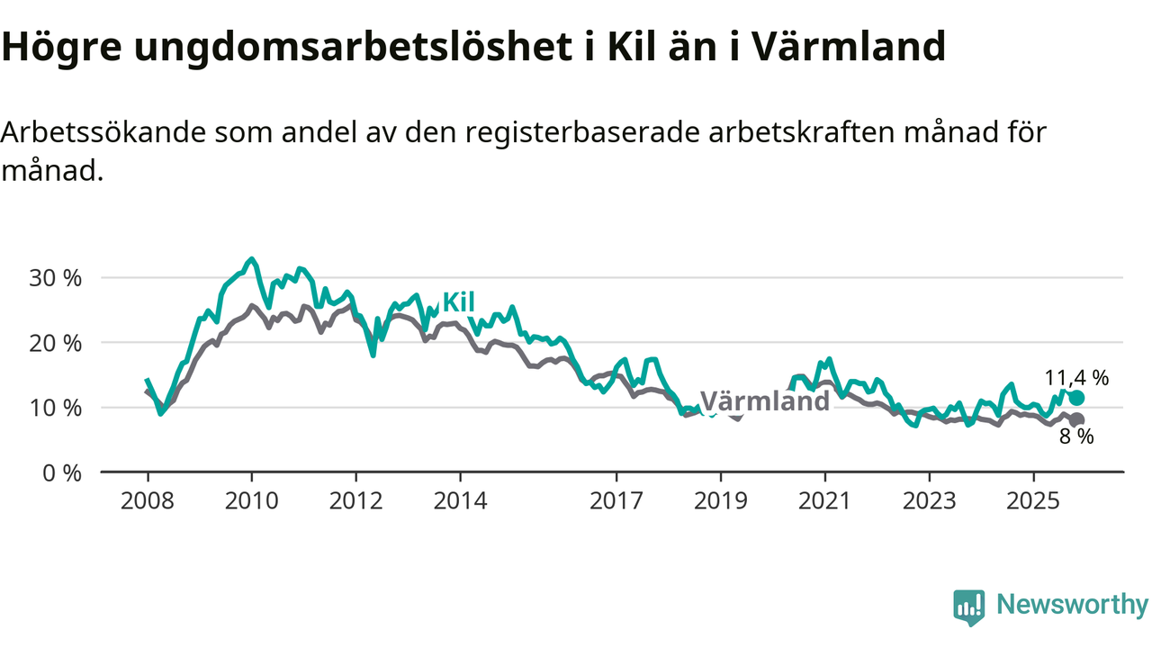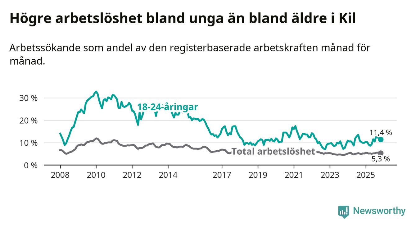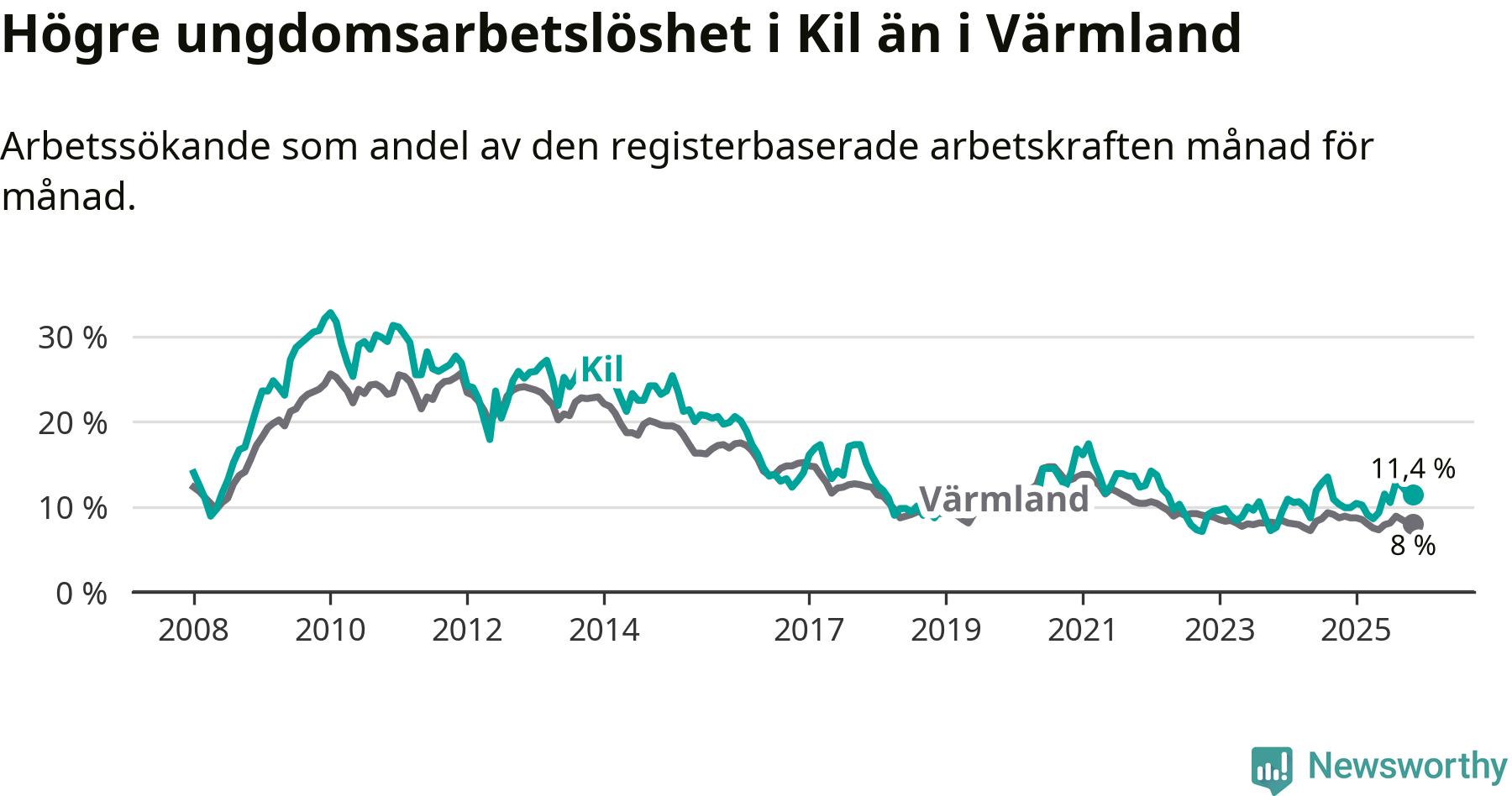 Medan Kil har lägre total arbetslöshet än Värmland, ligger ungdomsarbetslösheten 3,4 procentenheter högre i Kil.