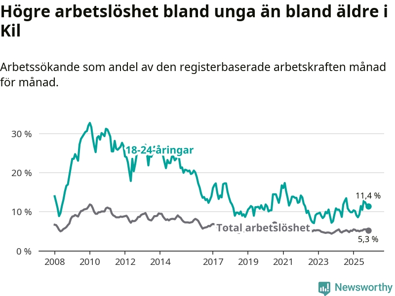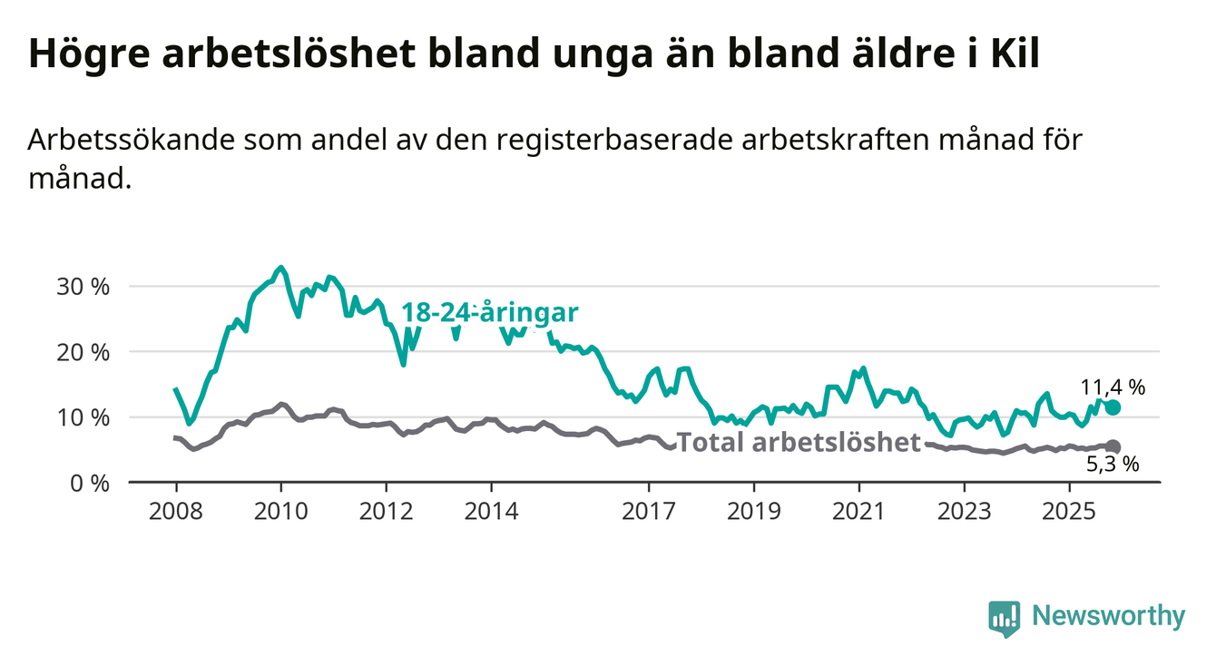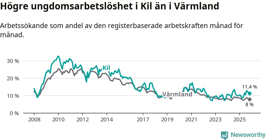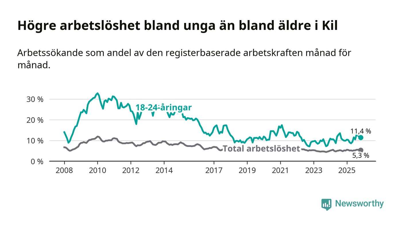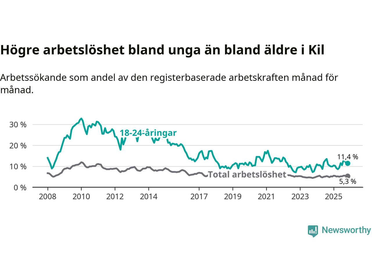 Medan Kil har lägre total arbetslöshet än Värmland, ligger ungdomsarbetslösheten 3,4 procentenheter högre i Kil.