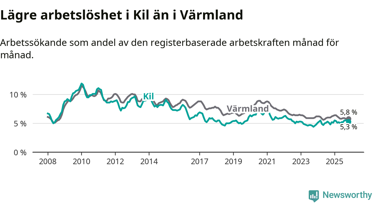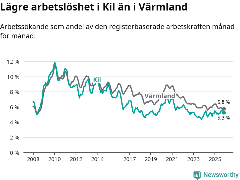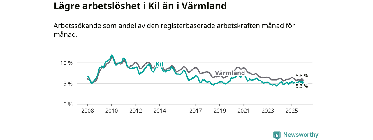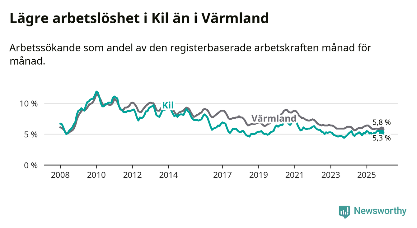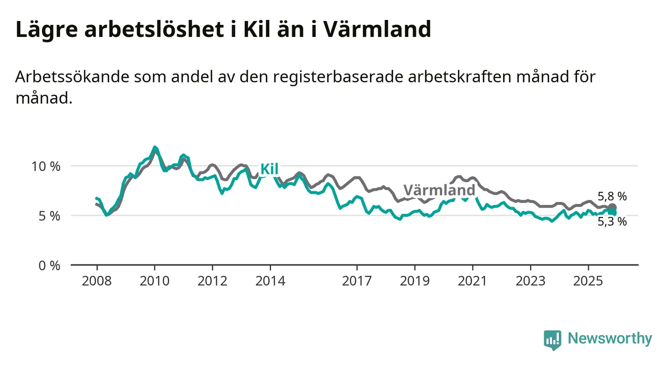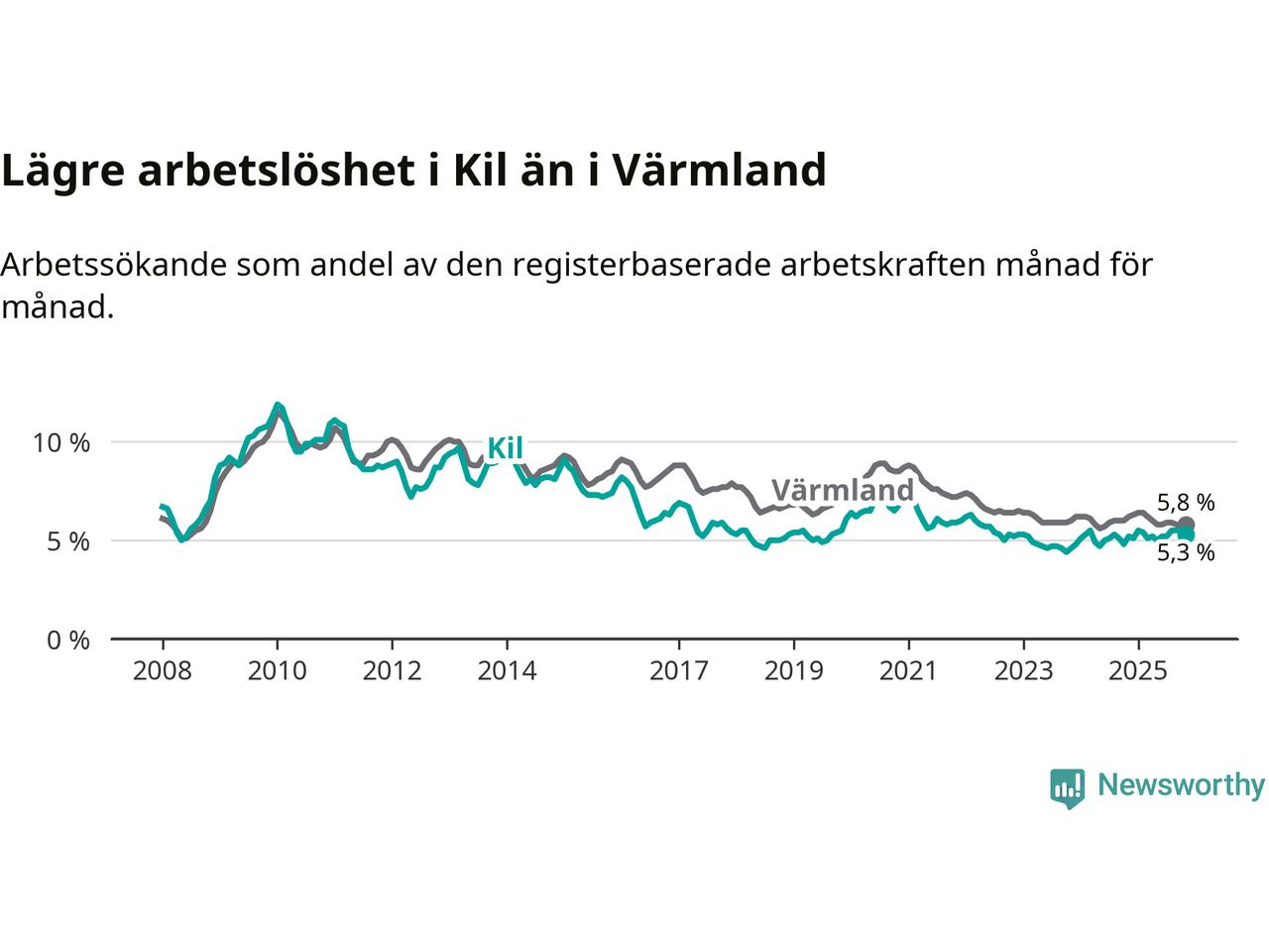 Kil går därmed mot strömmen i förhållande till andra kommuner i Värmlands län. I de flesta andra kommuner i länet går arbetslösheten nedåt. Störst är minskningen i Storfors, där arbetslösheten sjunker med 1,9 procentenheter. I tabellen längre ner ser du utvecklingen i samtliga kommuner i länet.