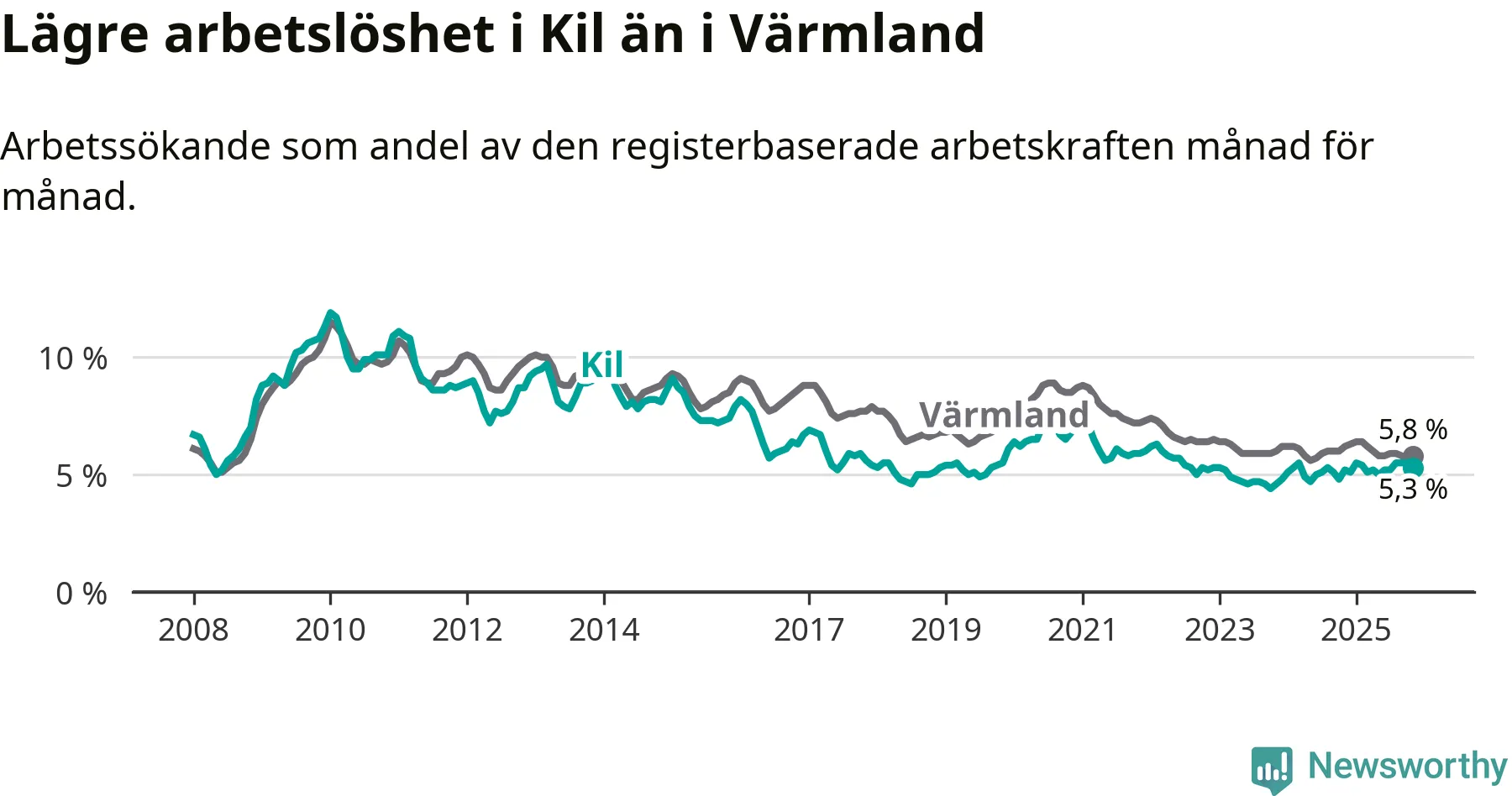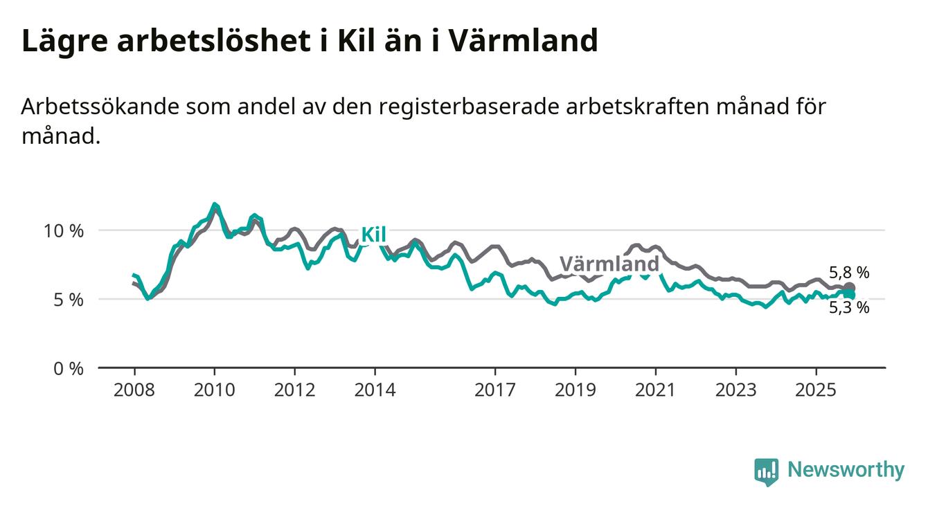 Även om arbetslösheten i Kil alltså ökar, så ligger den fortfarande under snittet i hela Värmlands län (5,3 procent i kommunen, jämfört med 5,8 procent i hela länet). Torsby har den lägsta arbetslösheten i länet (3,5 procent), medan Filipstad har den högsta (8,5 procent). För att Kil skulle komma ner i samma arbetslöshetsnivå som Torsby skulle 101 personer behöva sysselsättas.