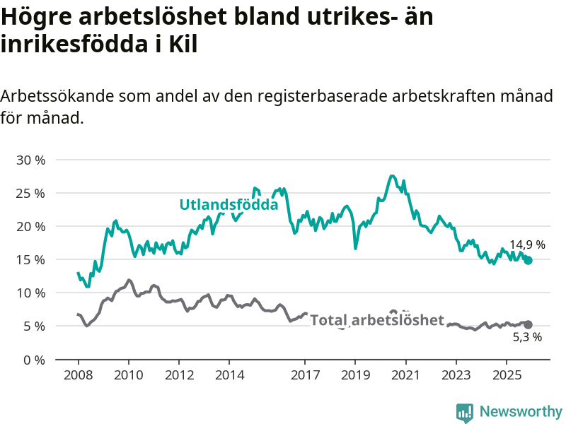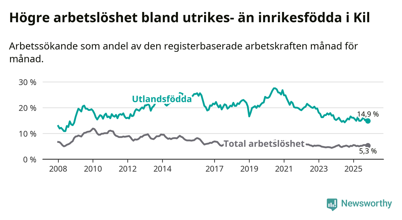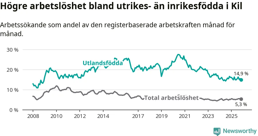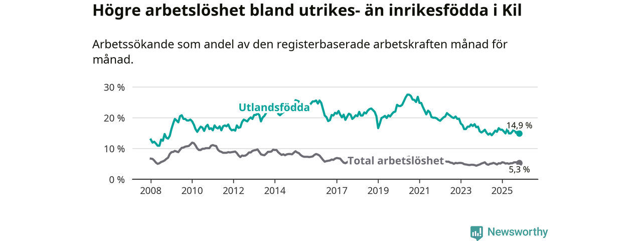 Arbetslösheten bland utlandsfödda var 14,9 procent i Kil under november månad, motsvarande 75 av 503 personer. Det är 1,7 procentenheter färre än vid samma tidpunkt i fjol (−9 om man räknar personer). Den senaste månadens nedgång innebär ett trendbrott. Under de ett föregående månaderna hade arbetslösheten bland utlandsfödda varit högre än motsvarande tidpunkt året innan.