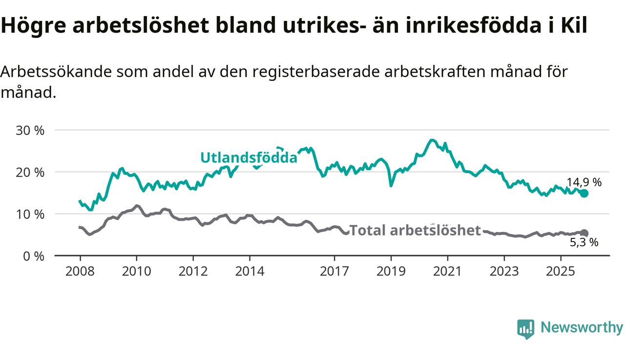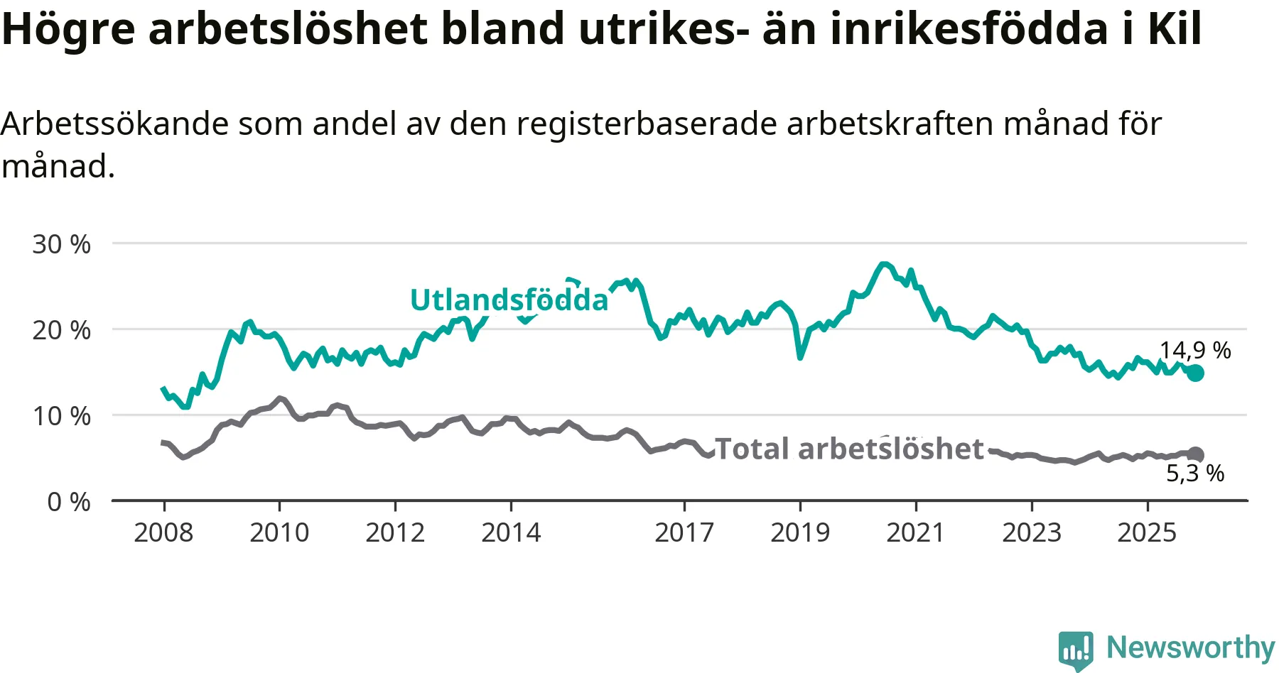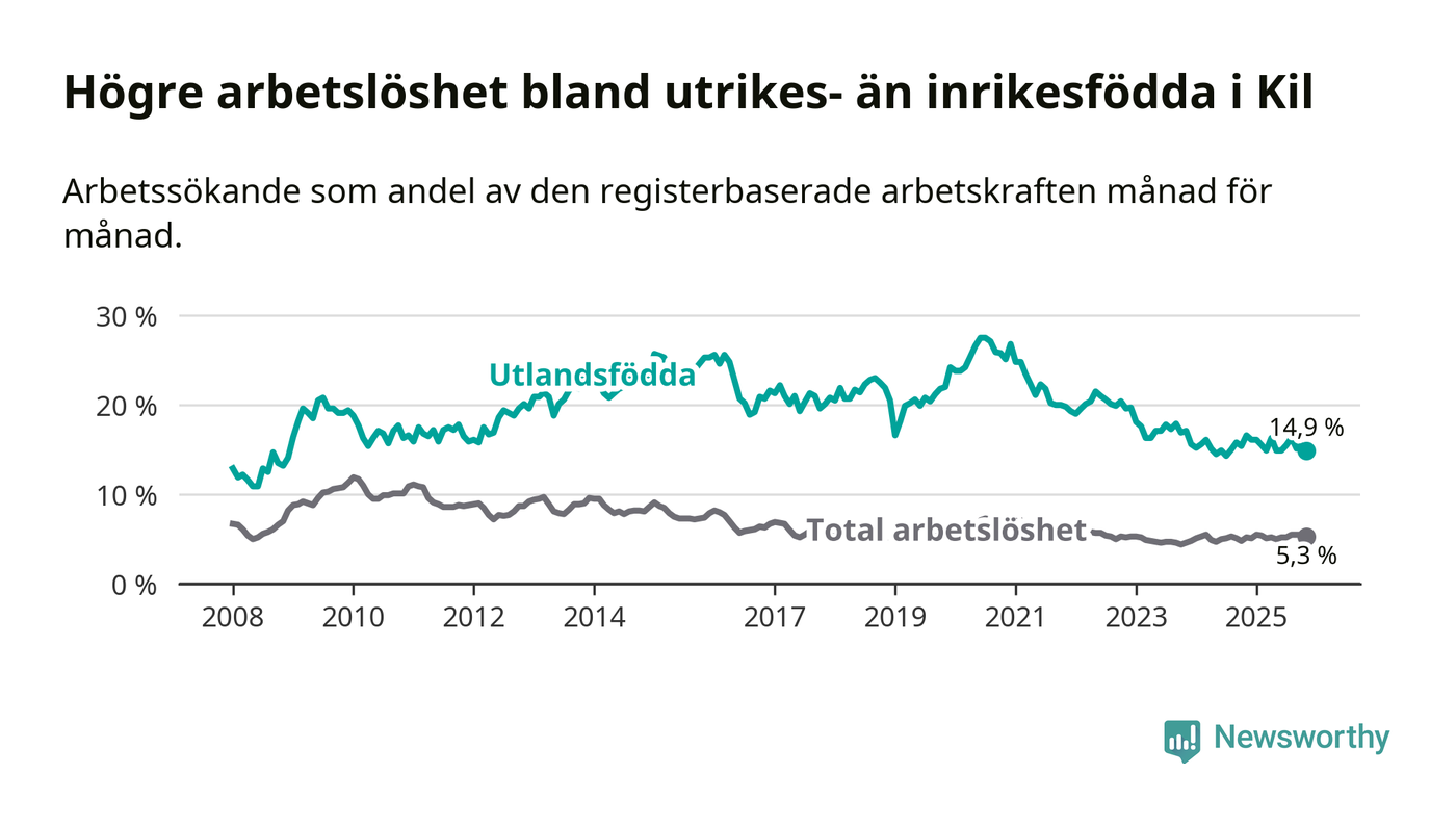 Skillnaden i arbetslöshet mellan utrikesfödda och hela befolkningen är 9,6 procentenheter i Kil. Det är en betydligt mindre skillnad än för ett år sedan (−1,8 procentenheter).