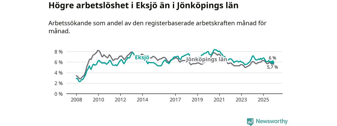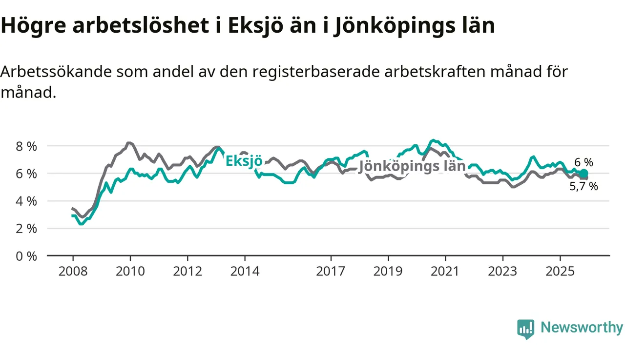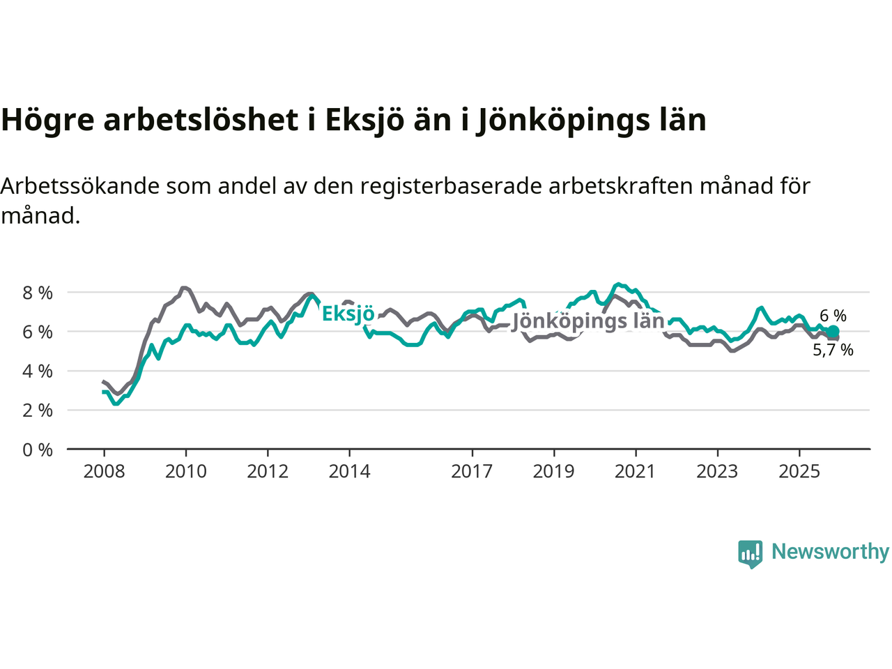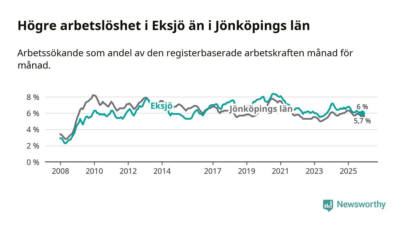 Under november månad rapporterade Eksjö kommun en total arbetslöshet på 6,0 procent. Det är en minskning jämfört med samma tidpunkt i fjol (−0,5 procentenheter). Även i Jönköpings län sjunker arbetslösheten .