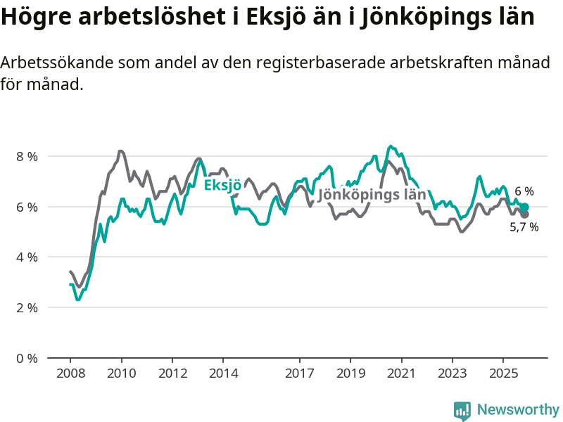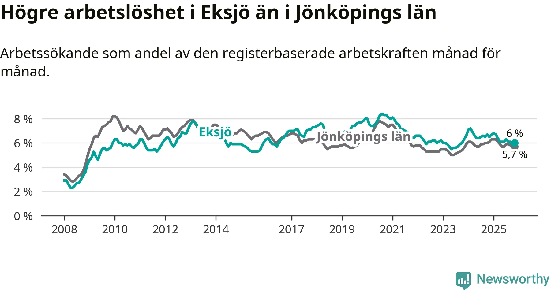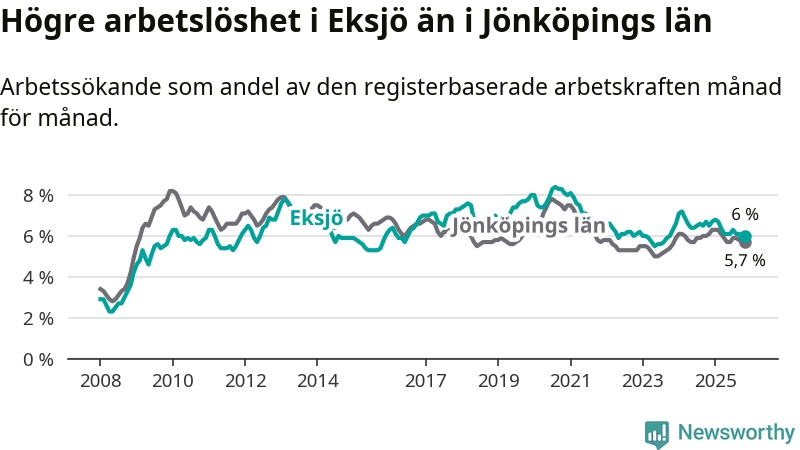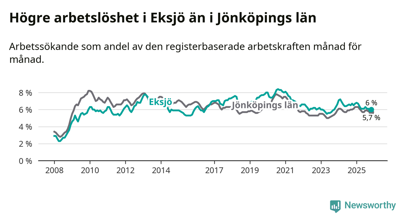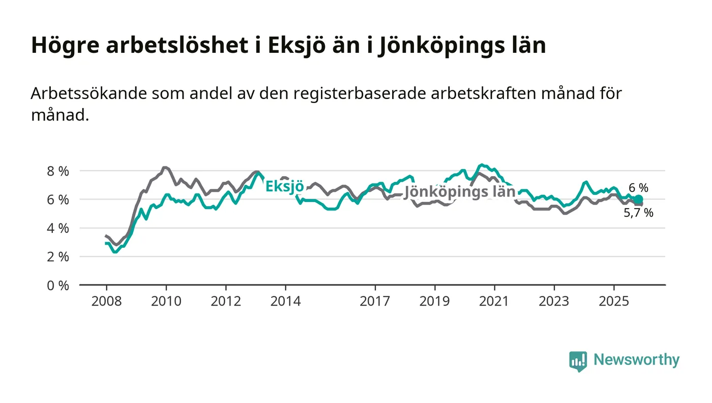 Under november månad rapporterade Eksjö kommun en total arbetslöshet på 6,0 procent. Det är en minskning jämfört med samma tidpunkt i fjol (−0,5 procentenheter). Även i Jönköpings län sjunker arbetslösheten .