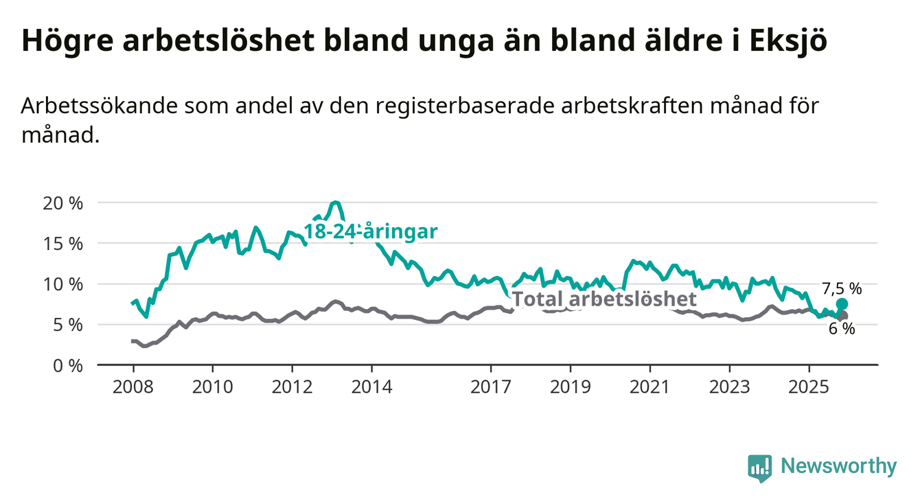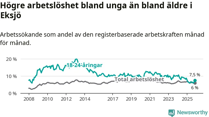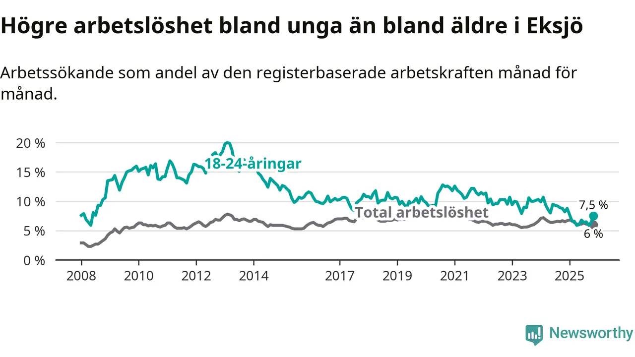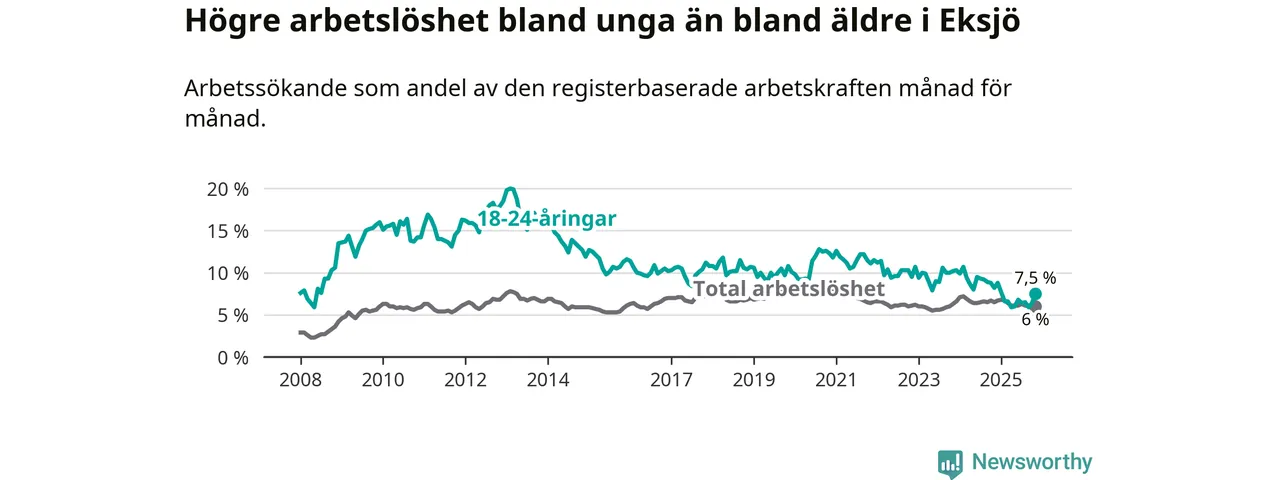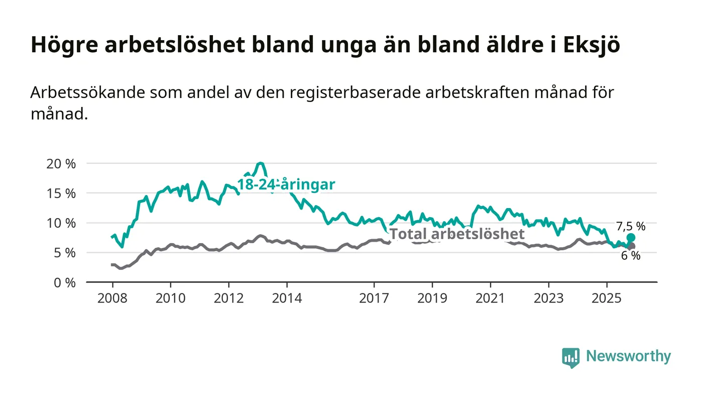 I och med den senaste månadens nedgång har de ungas arbetslöshet i Eksjö sjunkit 16 månader i följd (ner från 9,3 procent i juli 2024 till 7,5 procent nu).