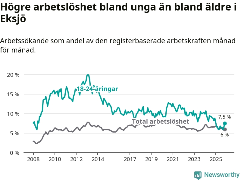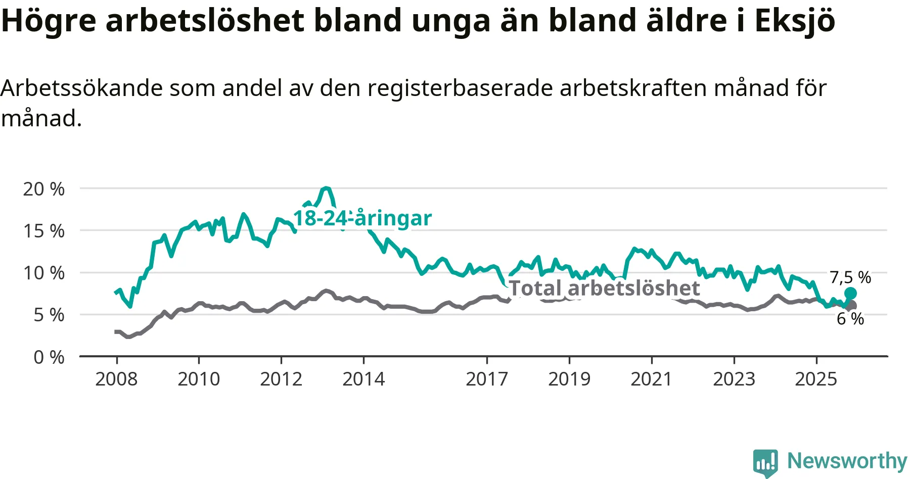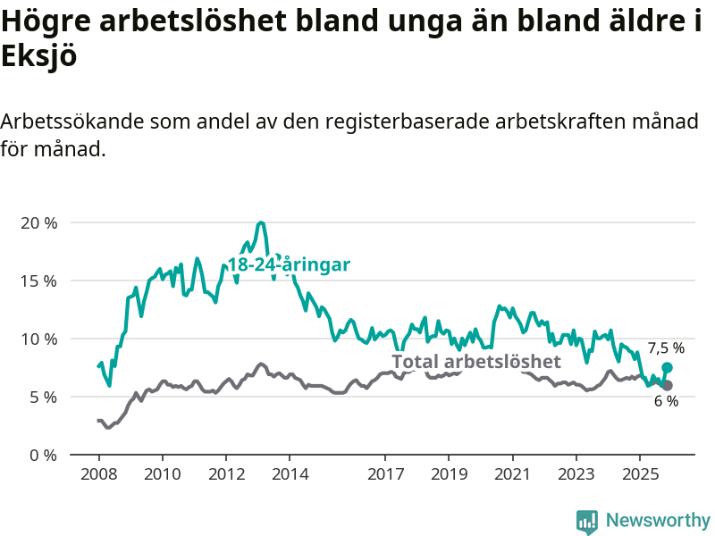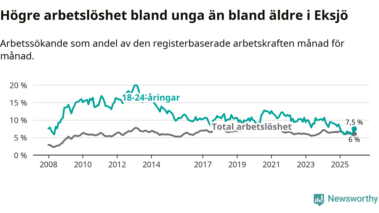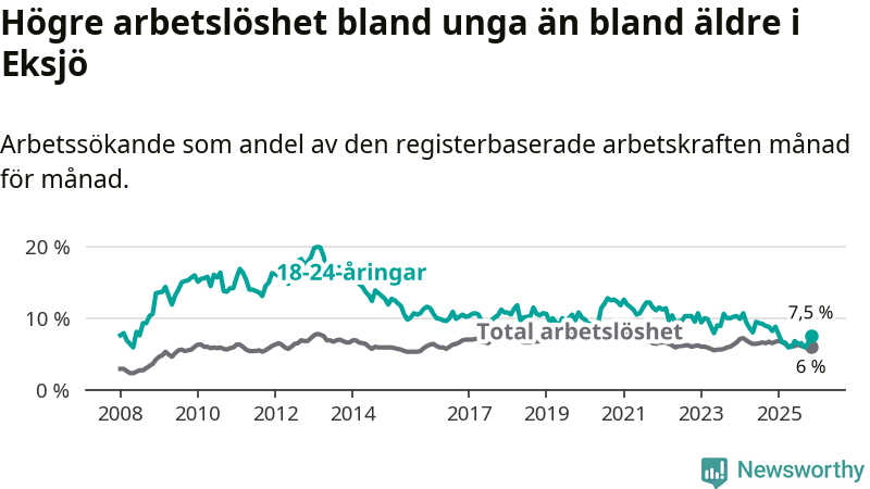 I och med den senaste månadens nedgång har de ungas arbetslöshet i Eksjö sjunkit 16 månader i följd (ner från 9,3 procent i juli 2024 till 7,5 procent nu).