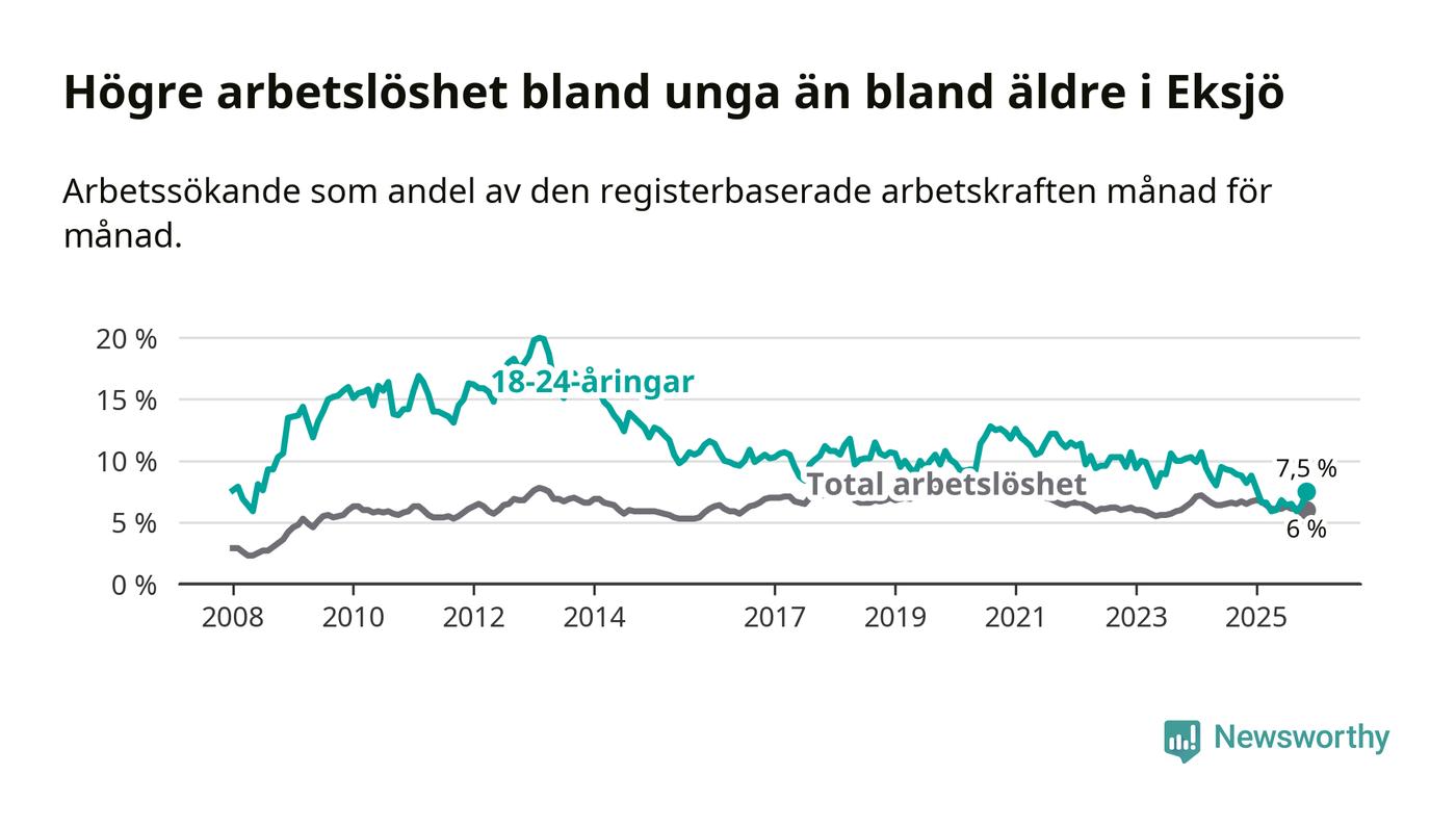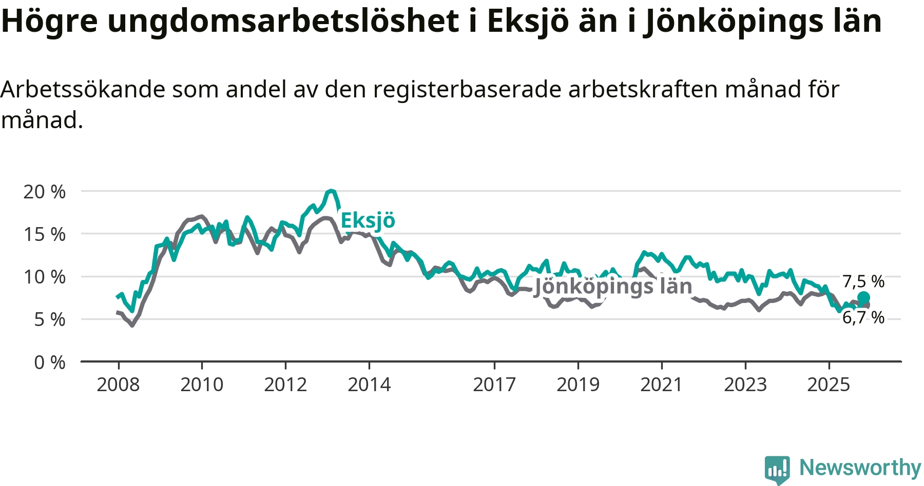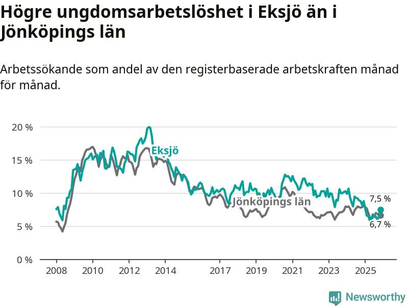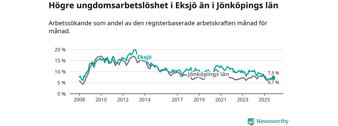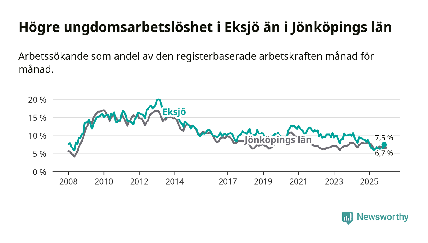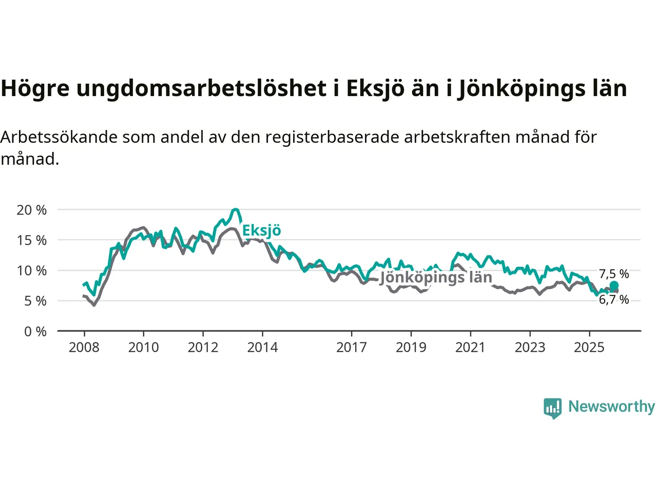 Precis som den totala arbetslösheten ligger ungdomsarbetslösheten i Eksjö högre än i Jönköpings län som helhet. Skillnaden mellan kommunen och länet är 0,8 procentenheter.