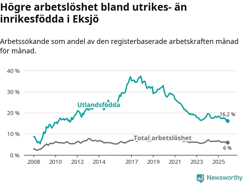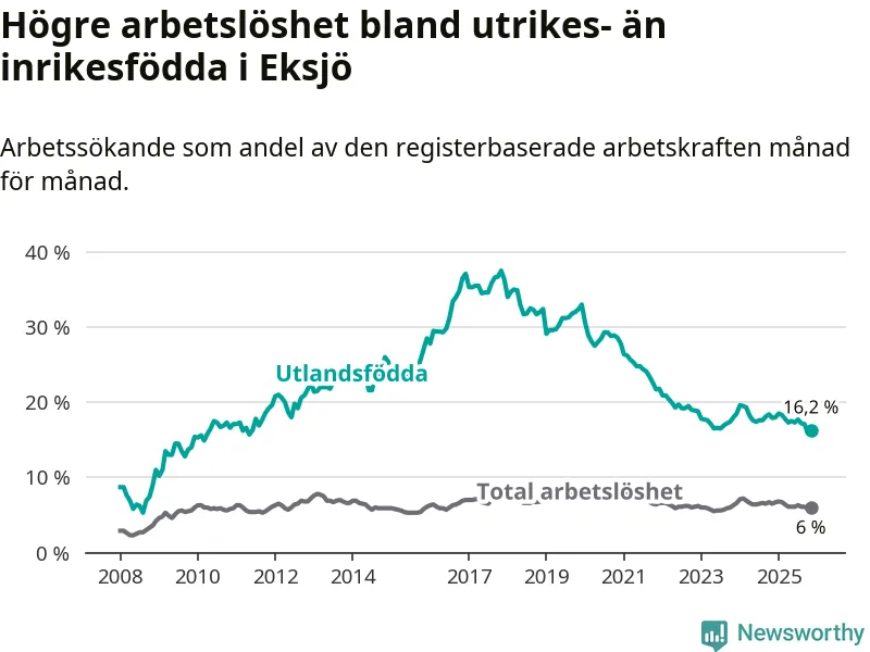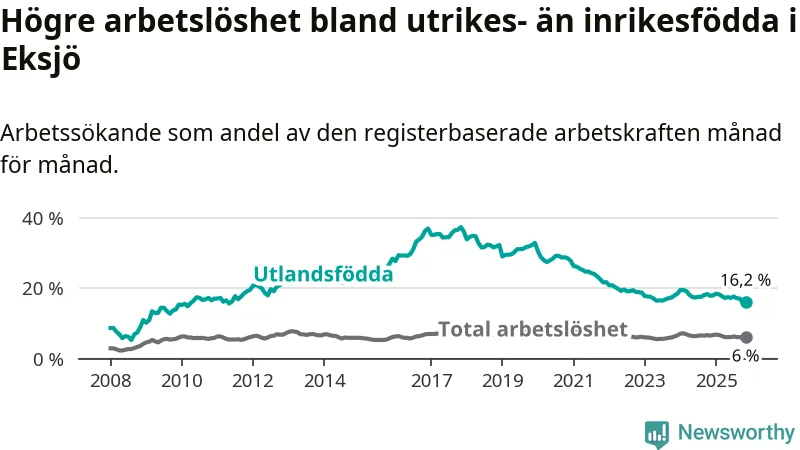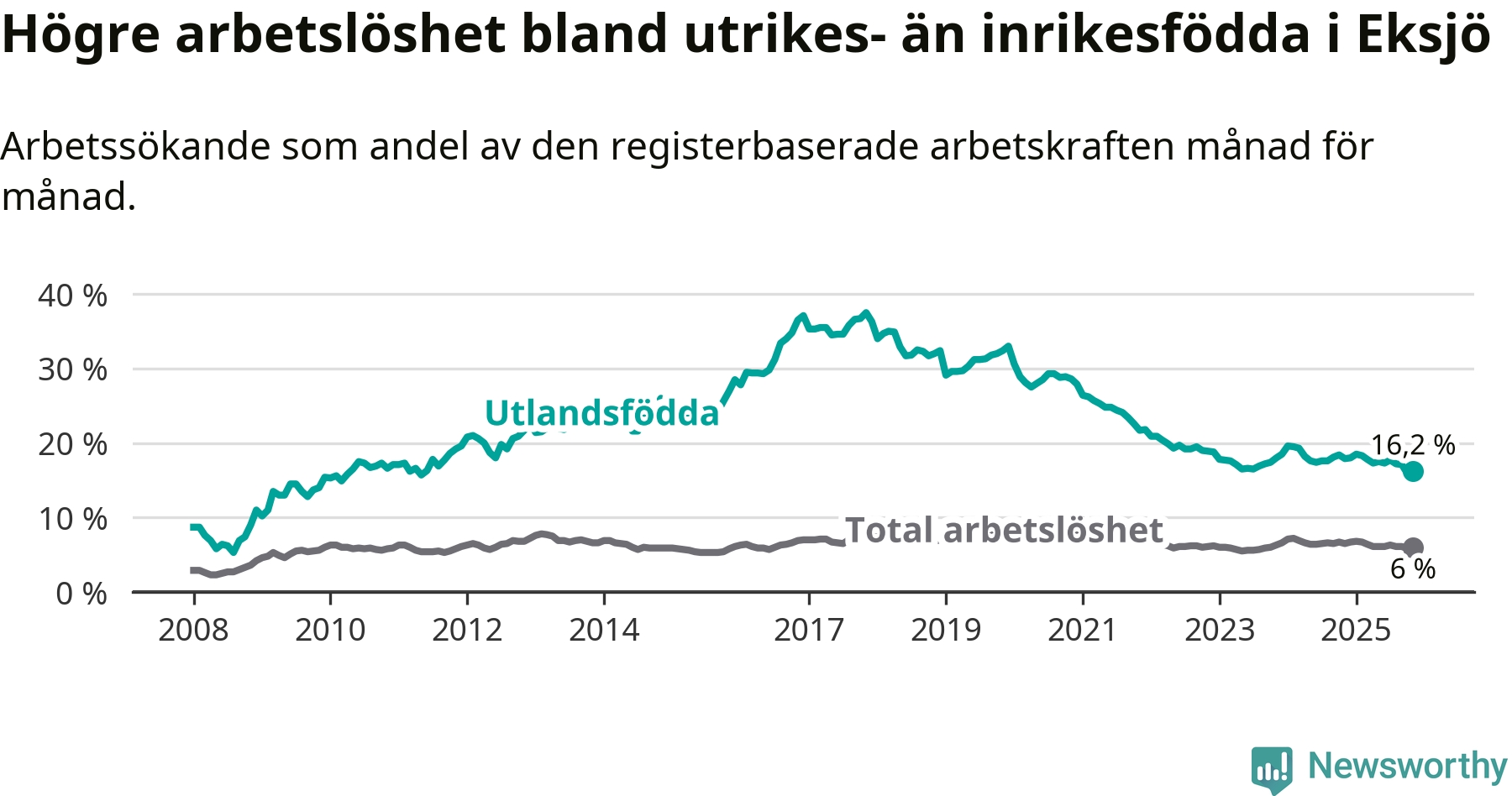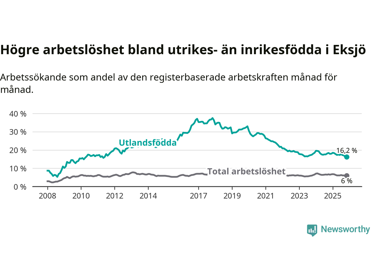 Arbetslösheten bland utlandsfödda var 16,2 procent i Eksjö under november månad, motsvarande 255 av 1 574 personer. Det är 1,7 procentenheter färre än vid samma tidpunkt i fjol (−26 om man räknar personer).