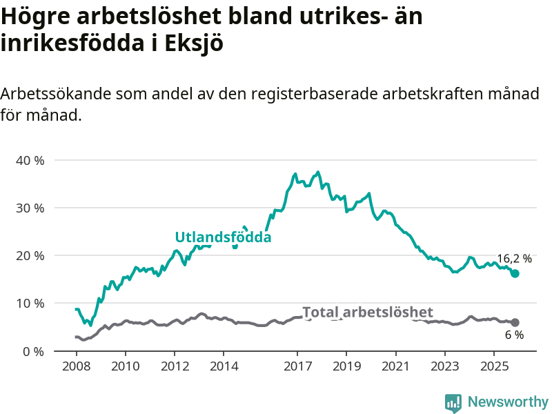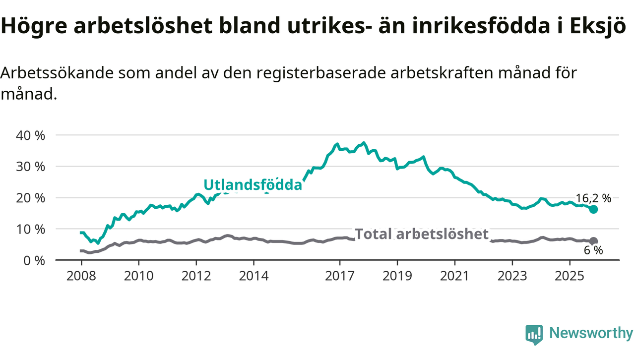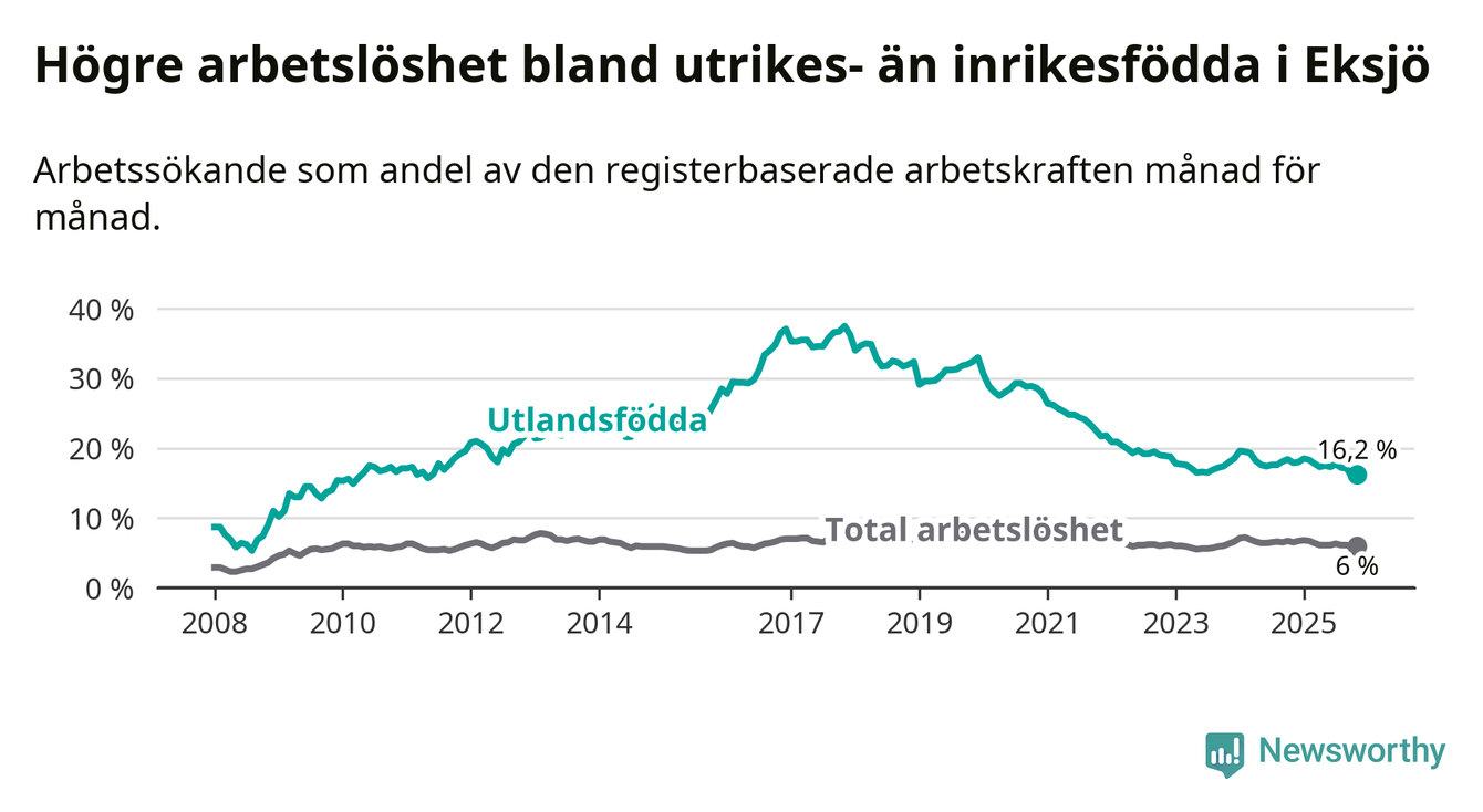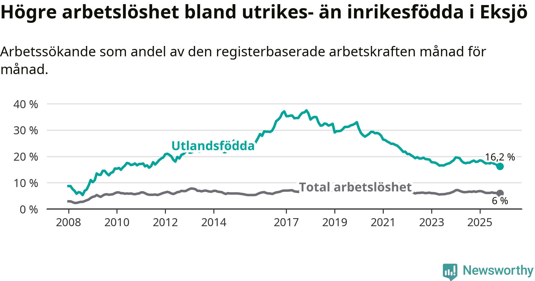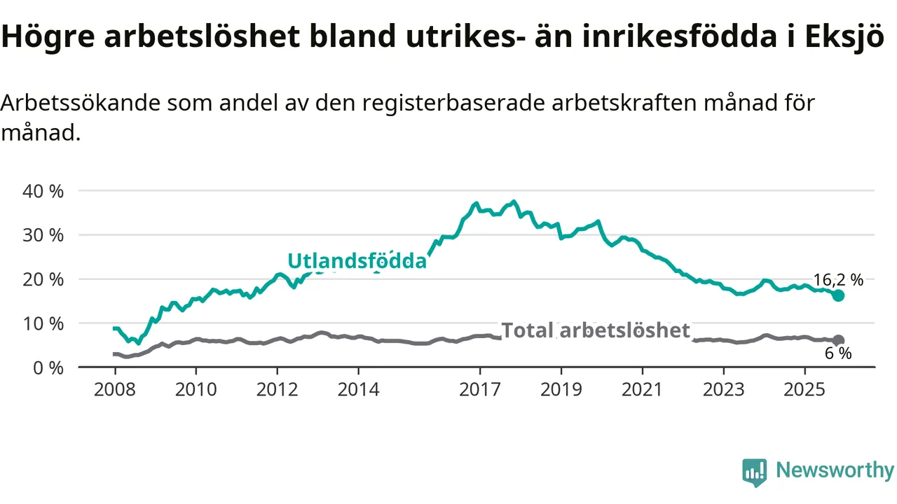 Skillnaden i arbetslöshet mellan utrikesfödda och hela befolkningen är 10,2 procentenheter i Eksjö. Det är en mindre skillnad än för ett år sedan (−1,2 procentenheter).