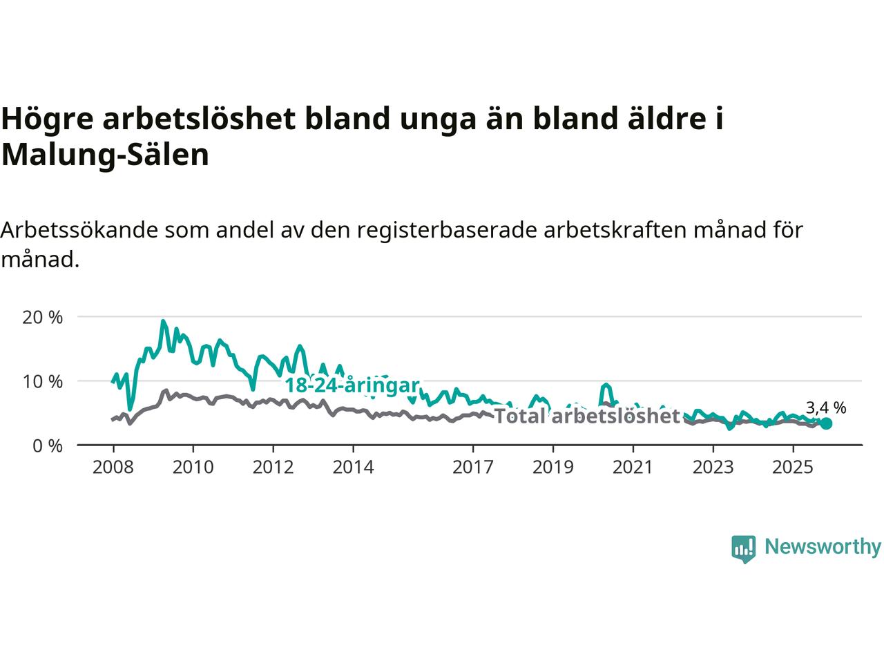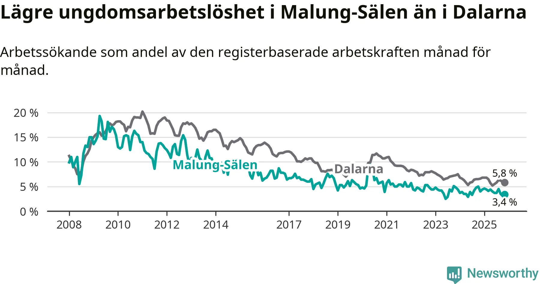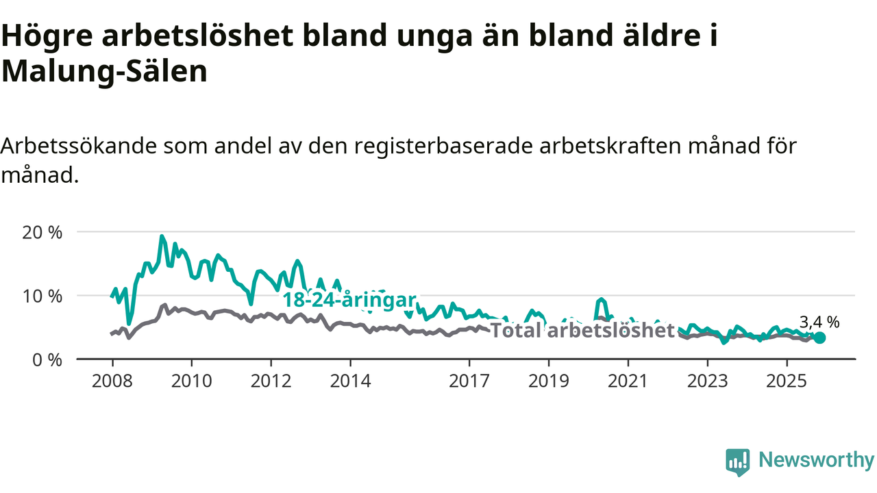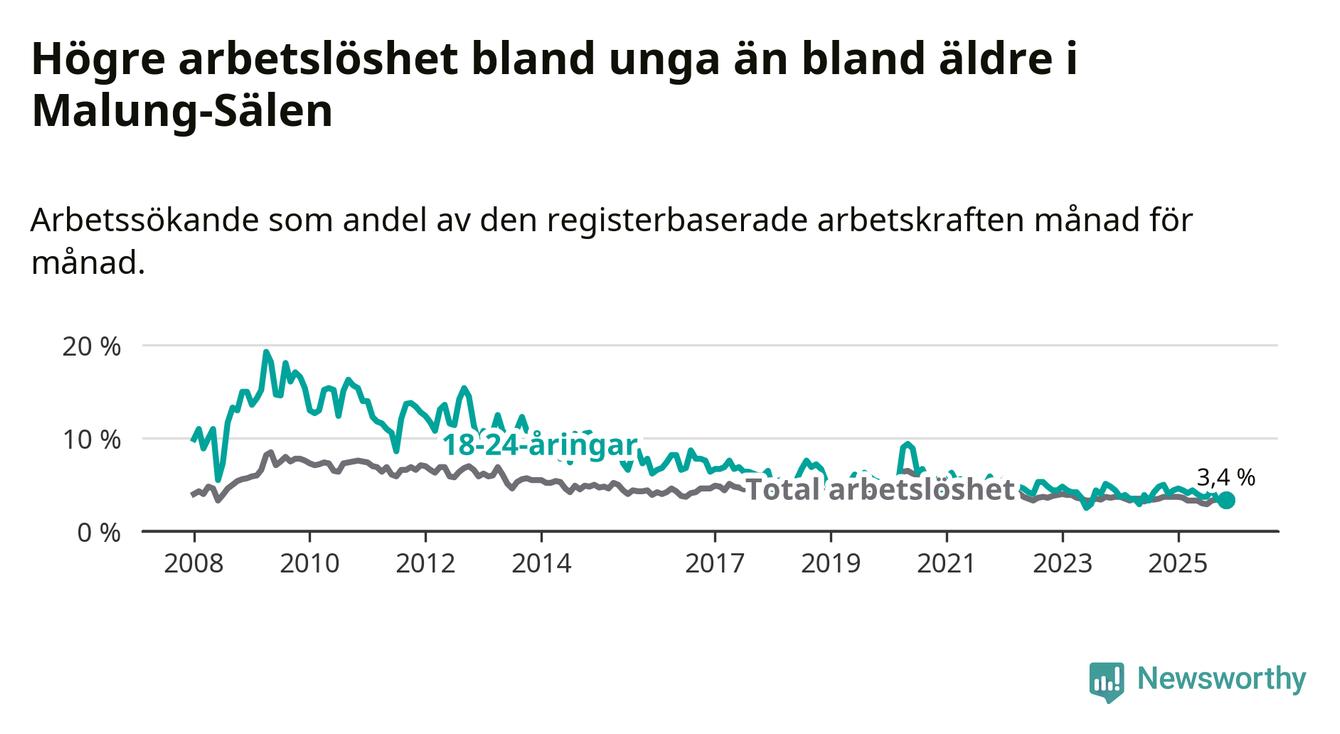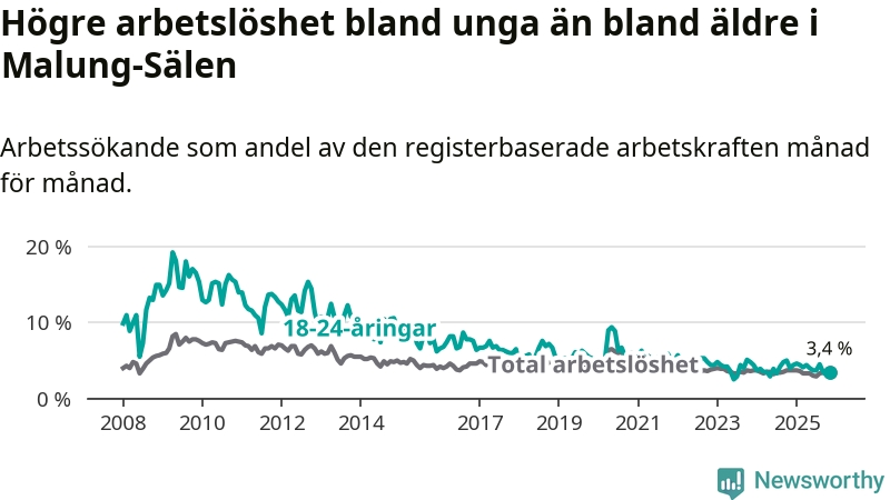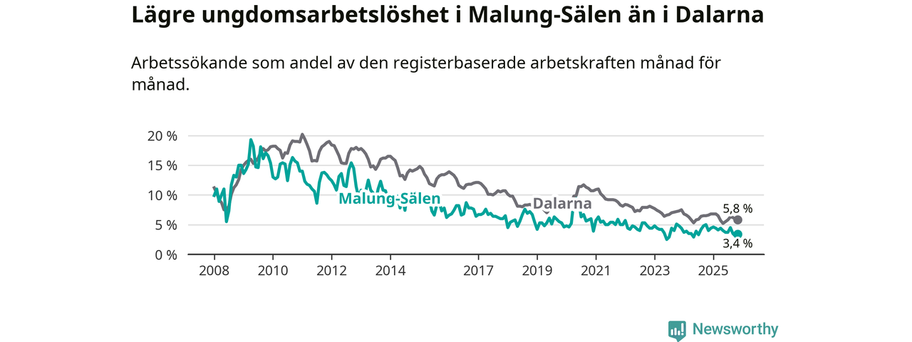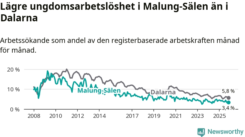 Precis som den totala arbetslösheten ligger ungdomsarbetslösheten i Malung-Sälen lägre än i Dalarna som helhet. Skillnaden mellan kommunen och länet är 2,4 procentenheter.