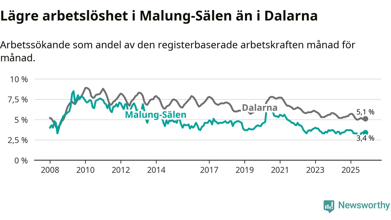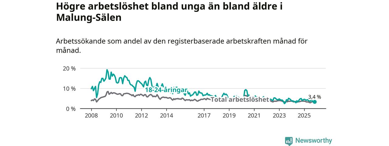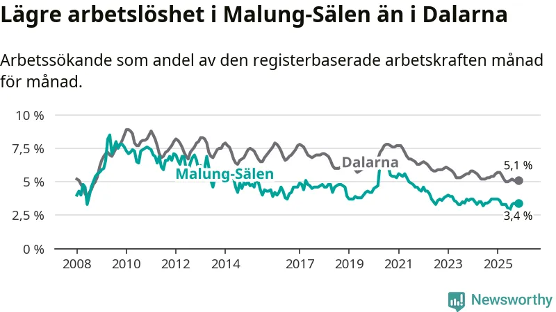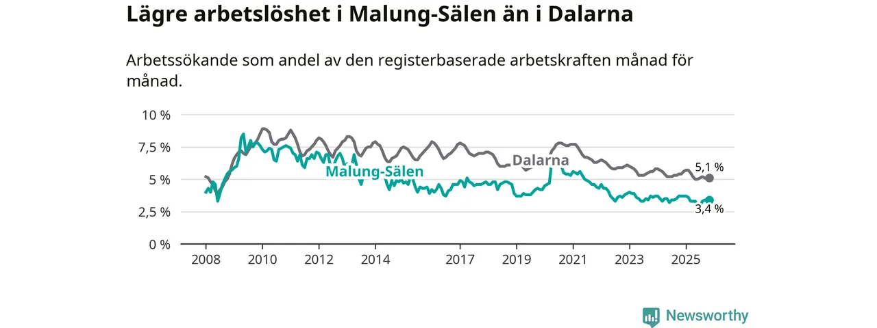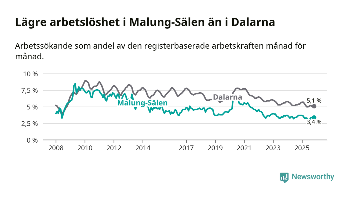 Under november månad rapporterade Malung-Sälens kommun en total arbetslöshet på 3,4 procent. Det är en minskning jämfört med samma tidpunkt i fjol (−0,3 procentenheter). Även i Dalarnas län sjunker arbetslösheten .