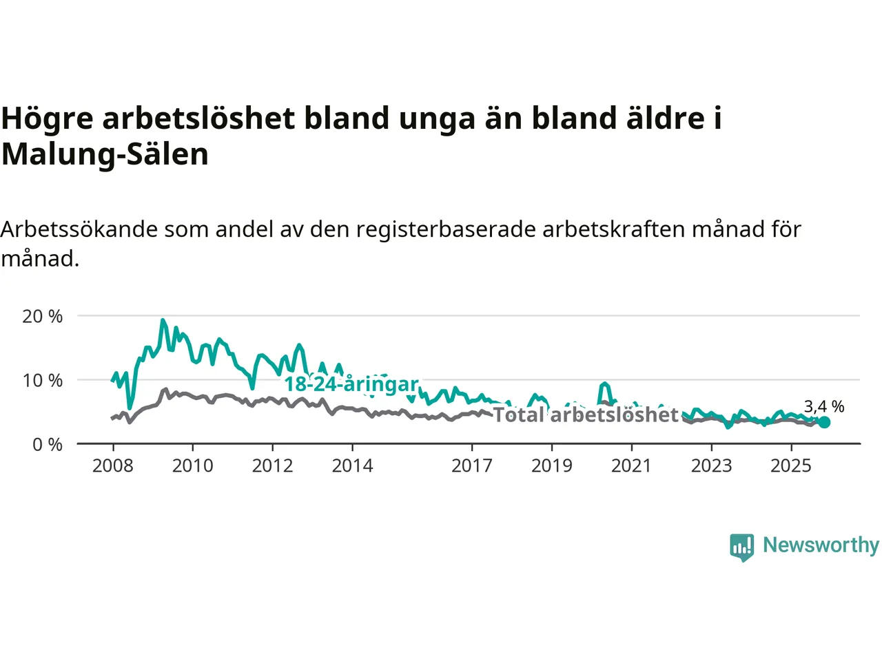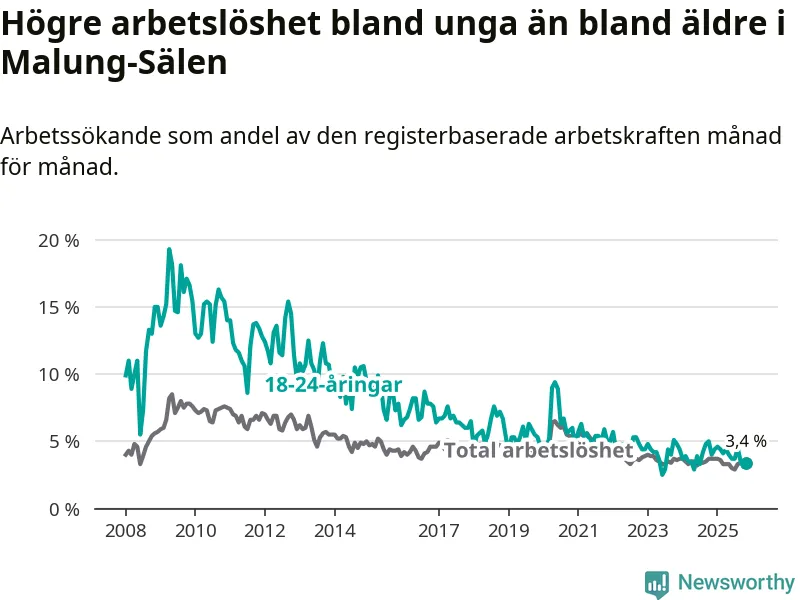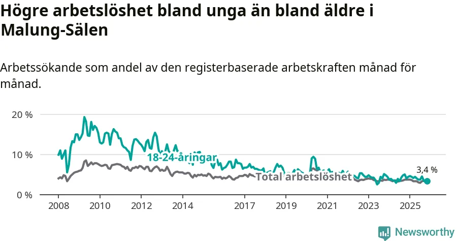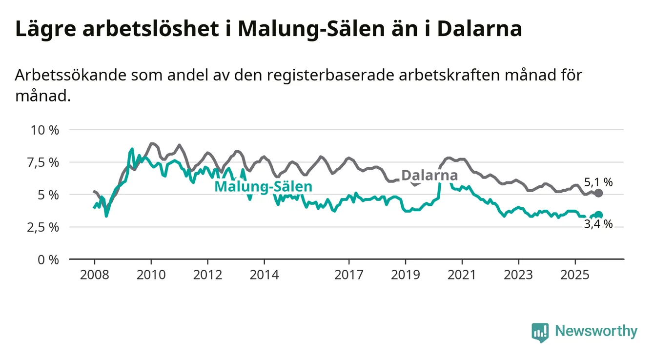 Under november månad rapporterade Malung-Sälens kommun en total arbetslöshet på 3,4 procent. Det är en minskning jämfört med samma tidpunkt i fjol (−0,3 procentenheter). Även i Dalarnas län sjunker arbetslösheten .