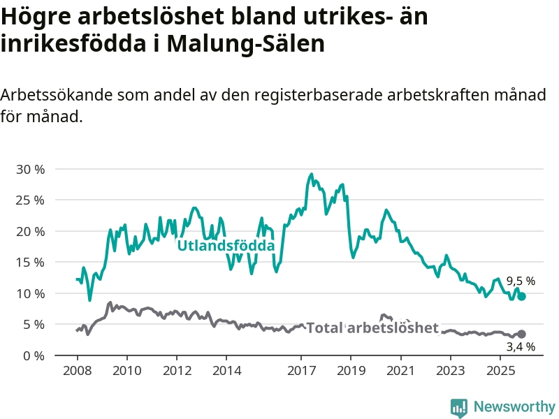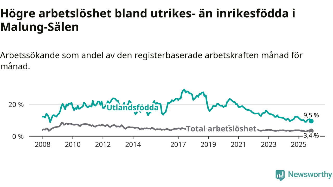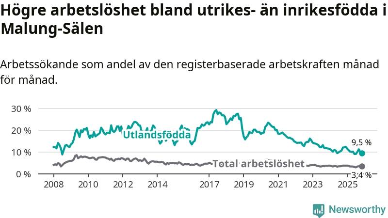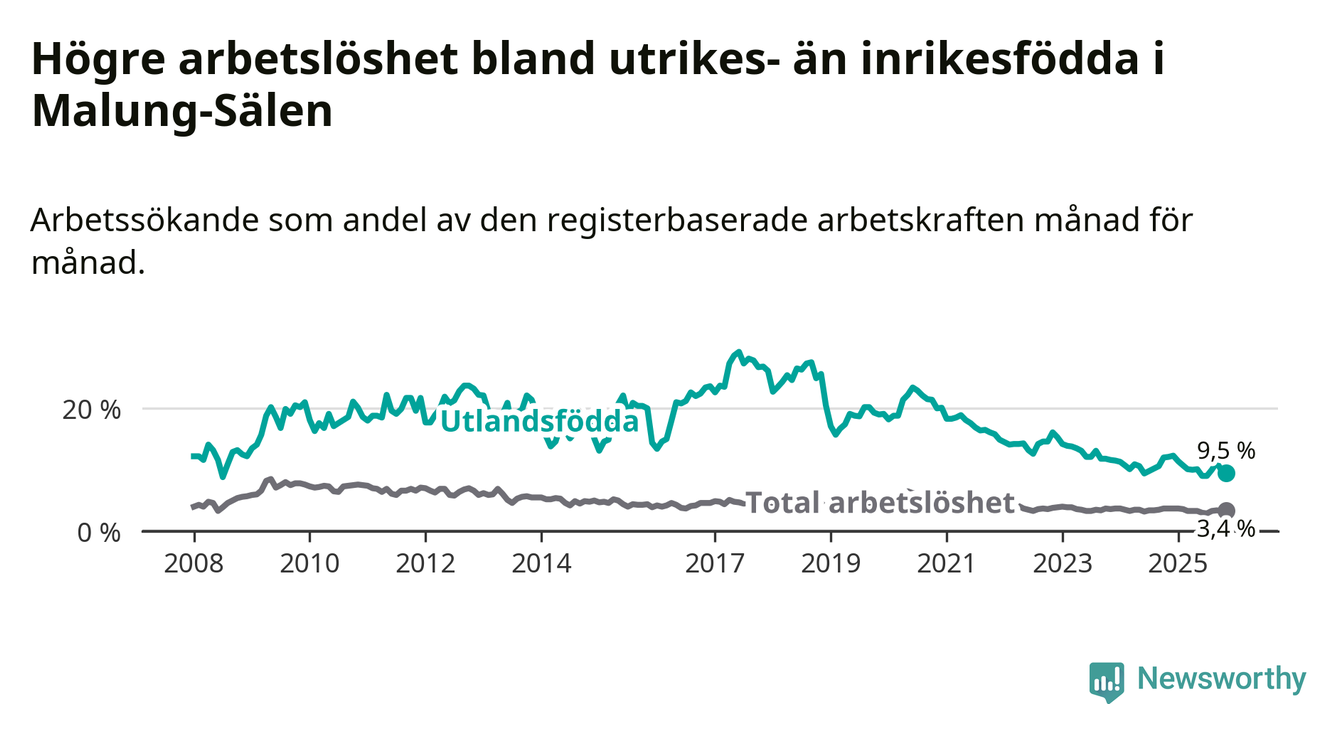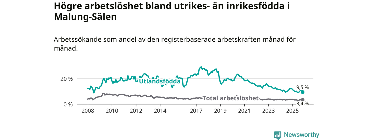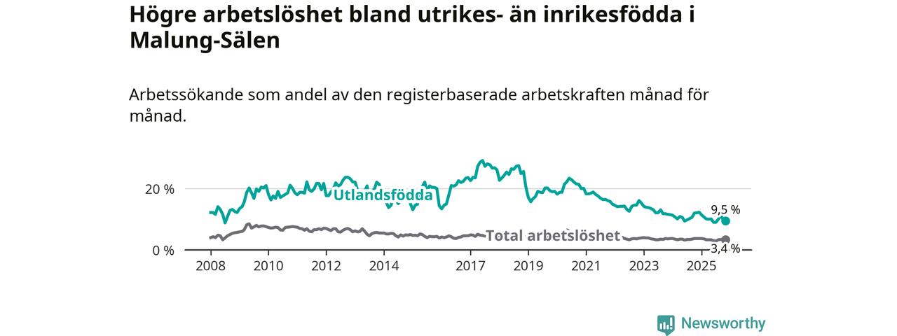 Skillnaden i arbetslöshet mellan utrikesfödda och hela befolkningen är 6,1 procentenheter i Malung-Sälen. Det är en betydligt mindre skillnad än för ett år sedan (−2,3 procentenheter).