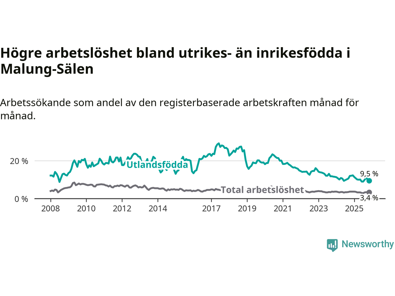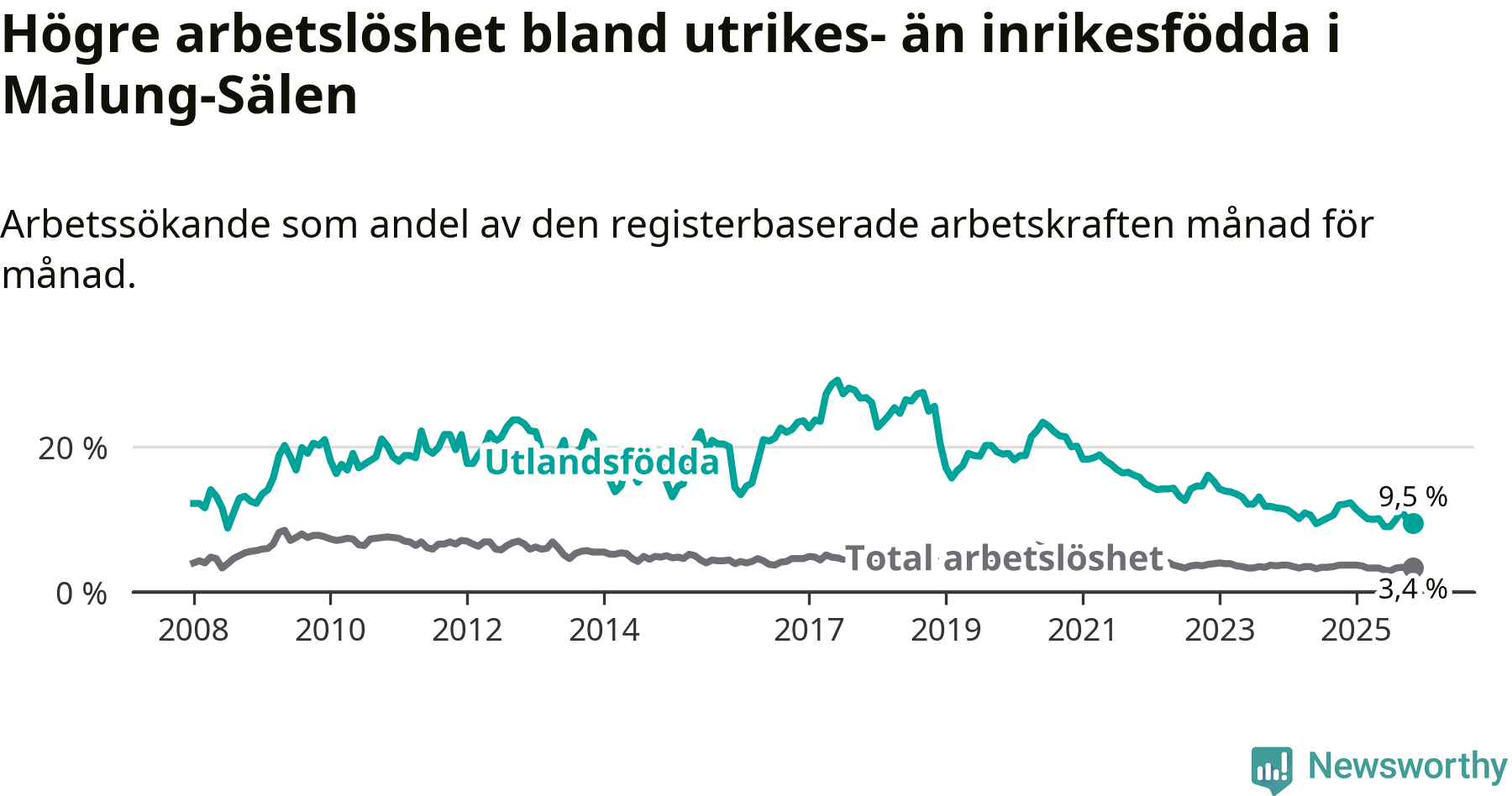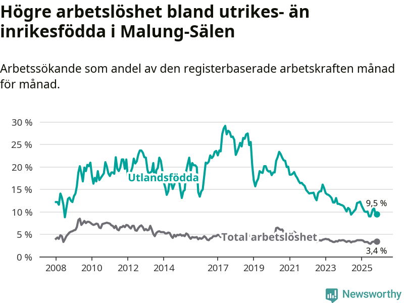 | Bland utlandsfödda | 9,5 % | −2,6 % ▼ | 14,0 % | −2,0 % ▼ | 14,3 % | −1,1 % ▼ |