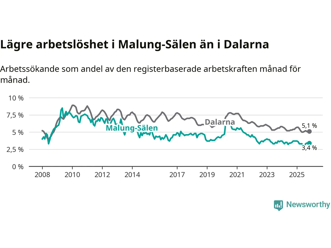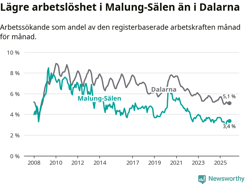Malung-Sälen hade redan tidigare lägre arbetslöshet än snittet i hela Dalarnas län och nu växer klyftan (3,4 procent i kommunen, jämfört med 5,1 procent i hela länet). Mora har den lägsta arbetslösheten i länet (3,2 procent), medan Avesta har den högsta (7,5 procent).