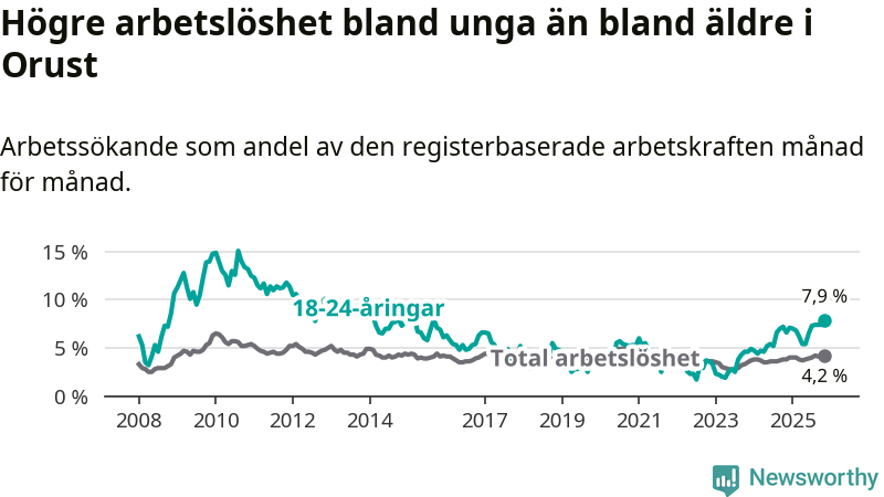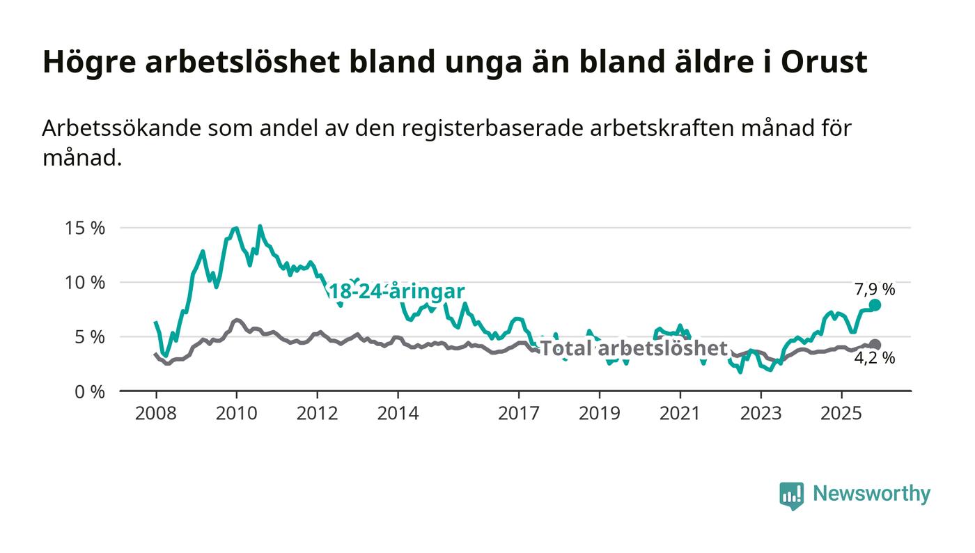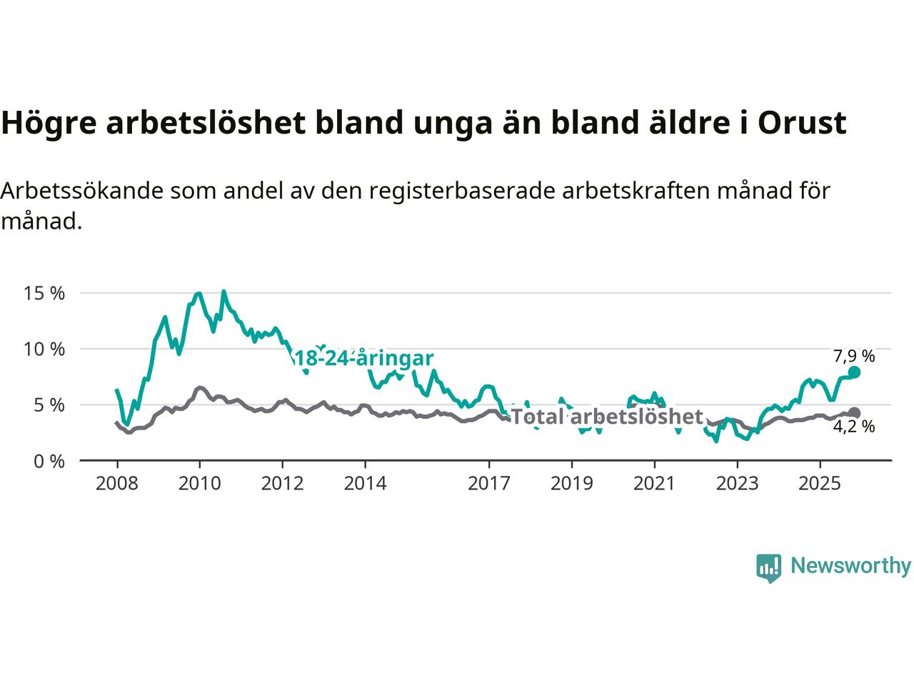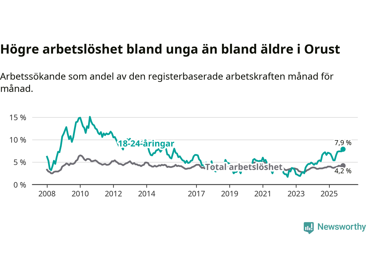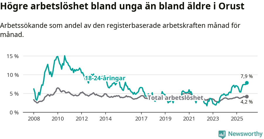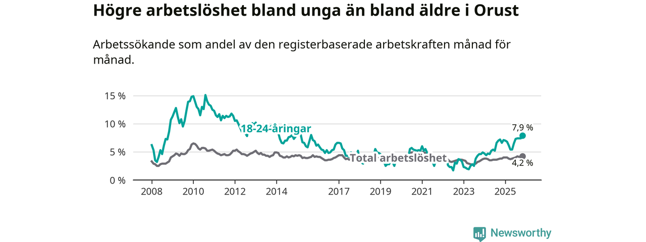 I och med den senaste månadens uppgång har de ungas arbetslöshet på Orust stigit över två år i sträck (upp från 1,9 procent i april 2023 till 7,9 procent nu). Den nuvarande arbetslöshetsnivån är den högsta sedan september 2015.