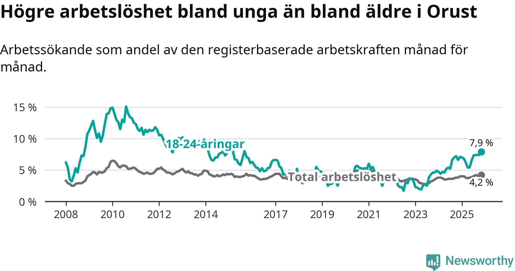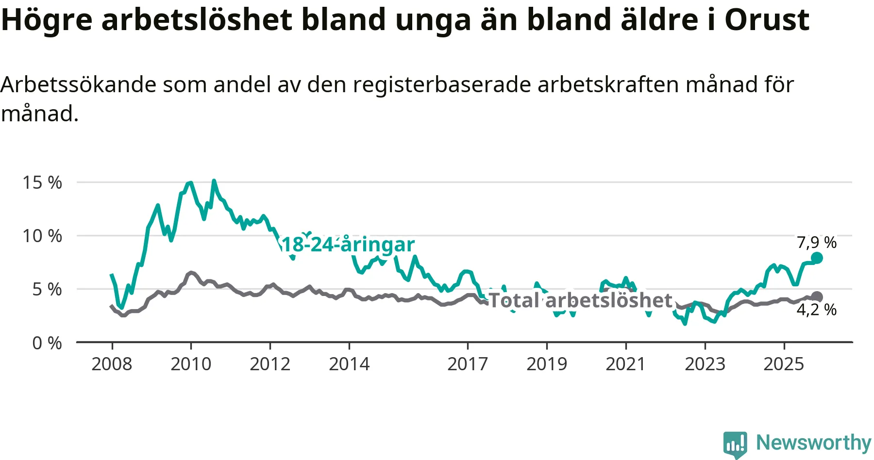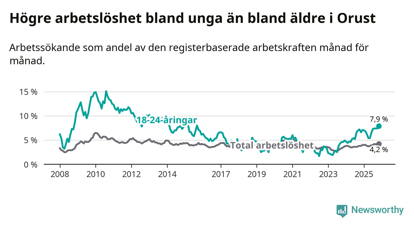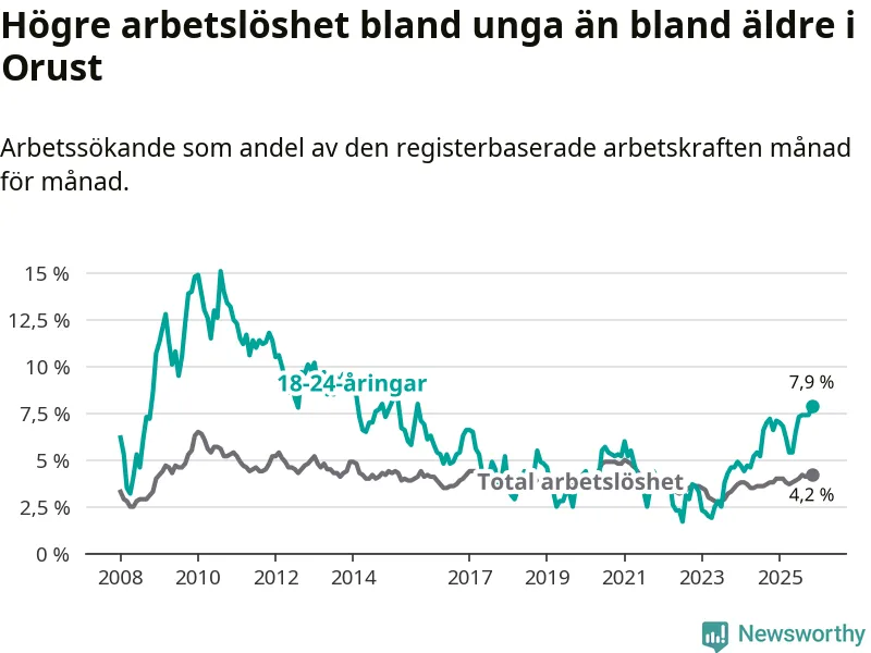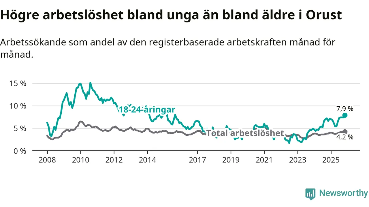 I och med den senaste månadens uppgång har de ungas arbetslöshet på Orust stigit över två år i sträck (upp från 1,9 procent i april 2023 till 7,9 procent nu). Den nuvarande arbetslöshetsnivån är den högsta sedan september 2015.