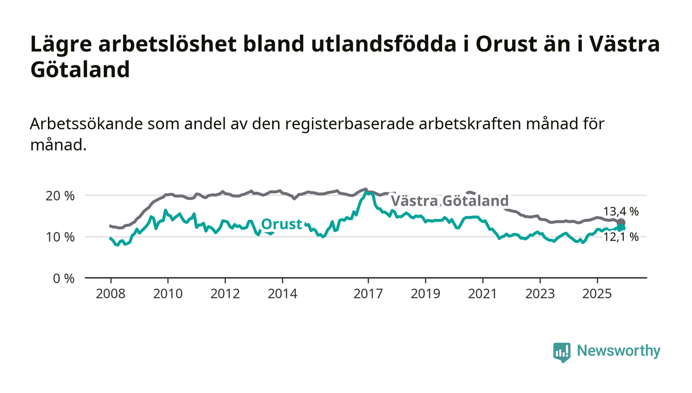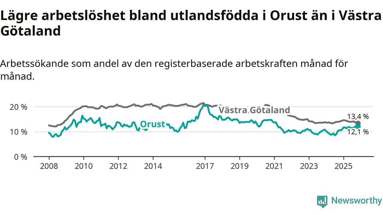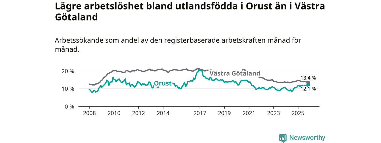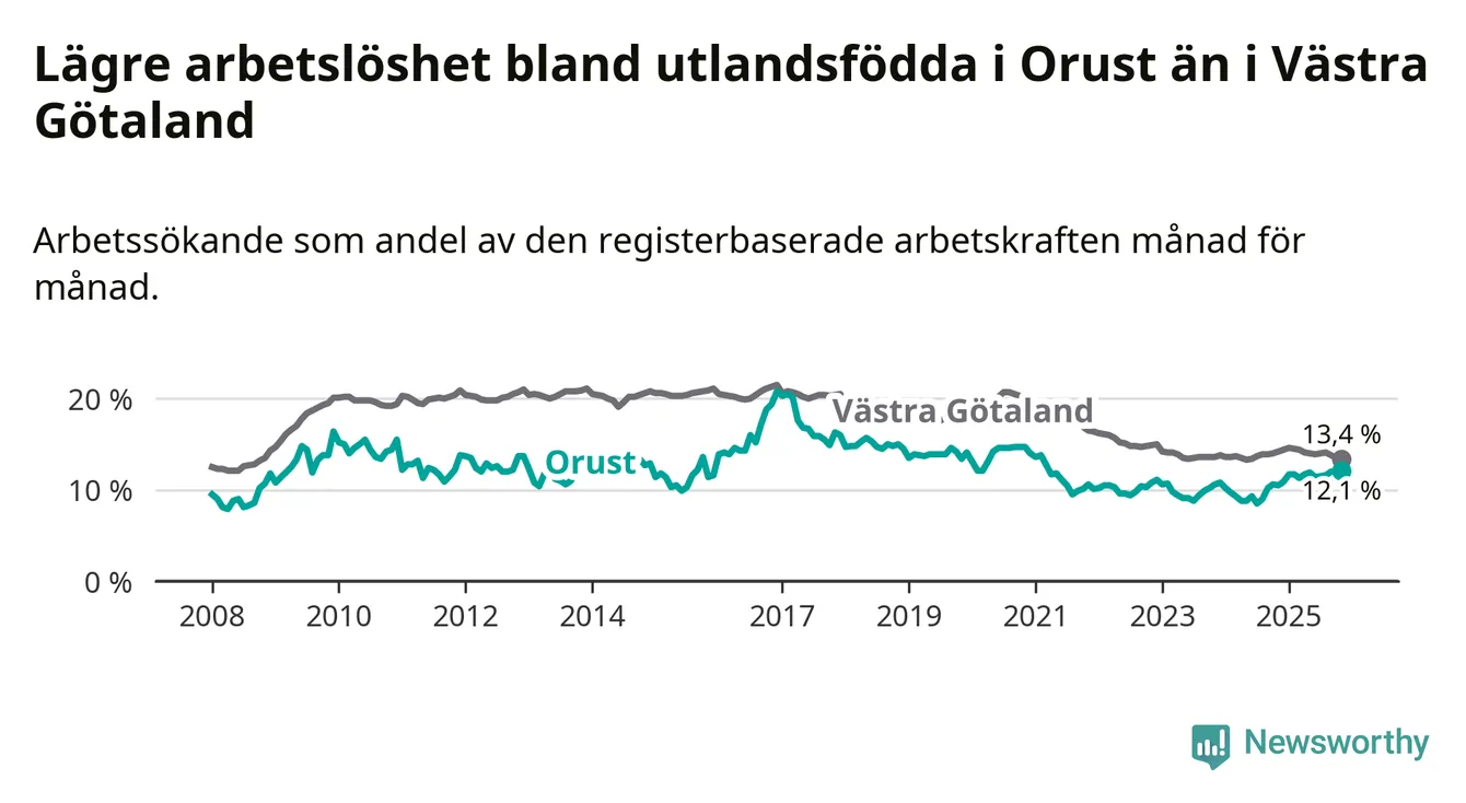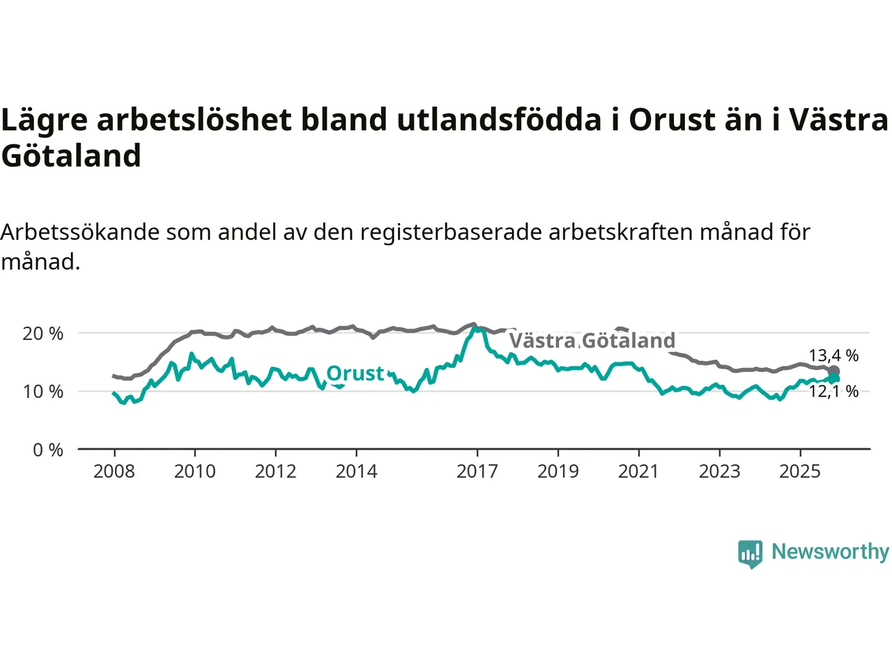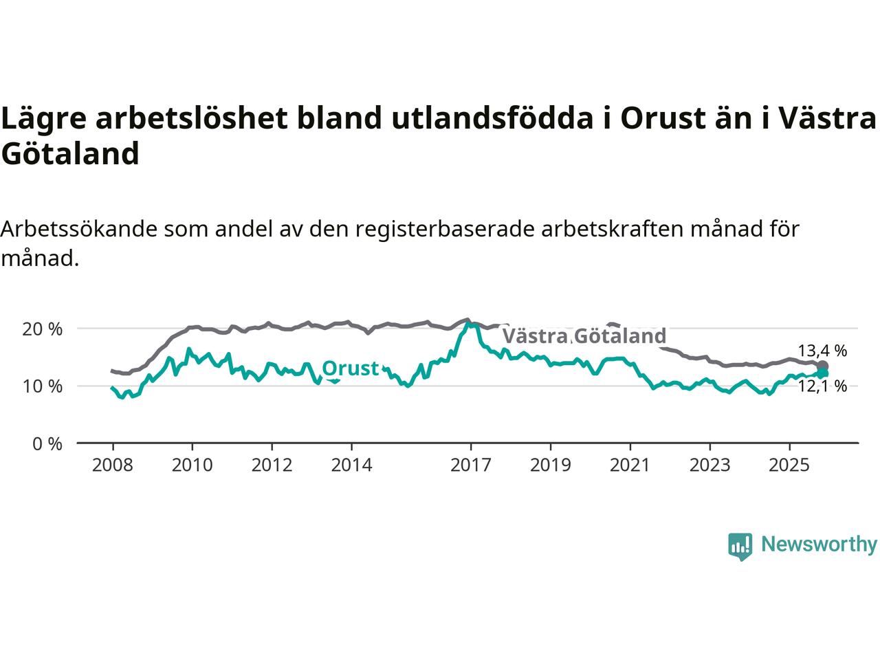 Medan arbetslösheten bland utlandsfödda alltså ökar på Orust så minskar den i Västra Götaland. Jämfört med november förra året har andelen arbetslösa utlandsfödda i länet minskat med 0,8 procentenheter (till 13,4 procent). Trots den senaste uppgången har Orust med andra ord fortfarande lägre arbetslöshet bland utlandsfödda än Västra Götaland.