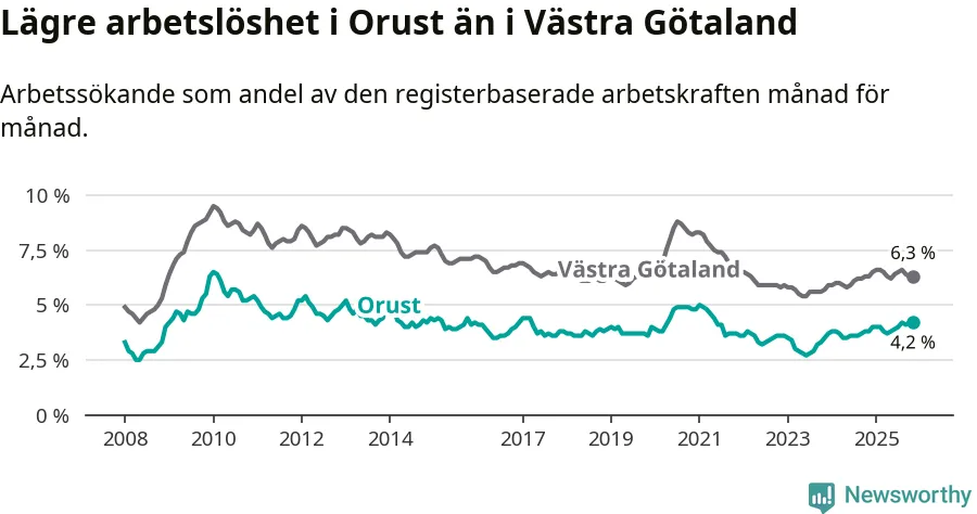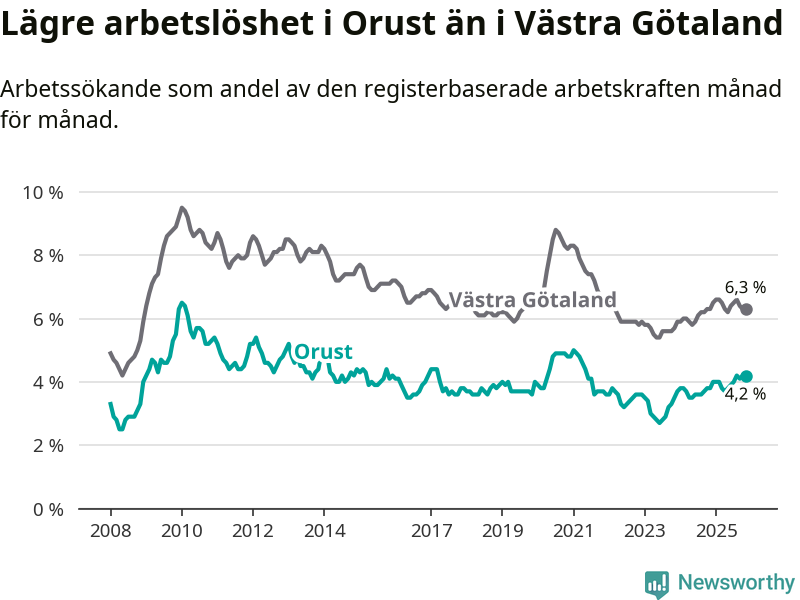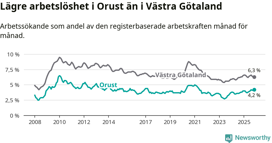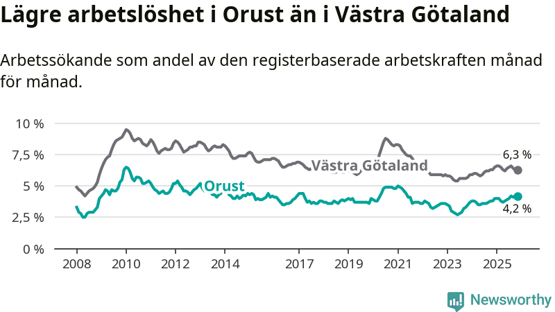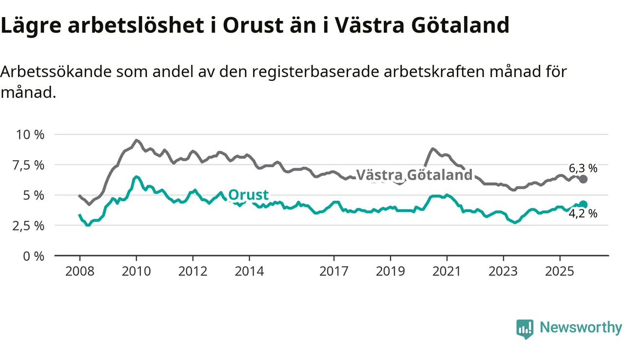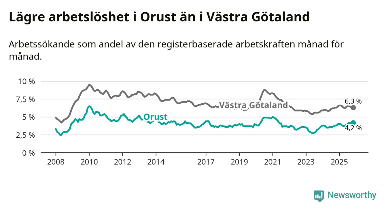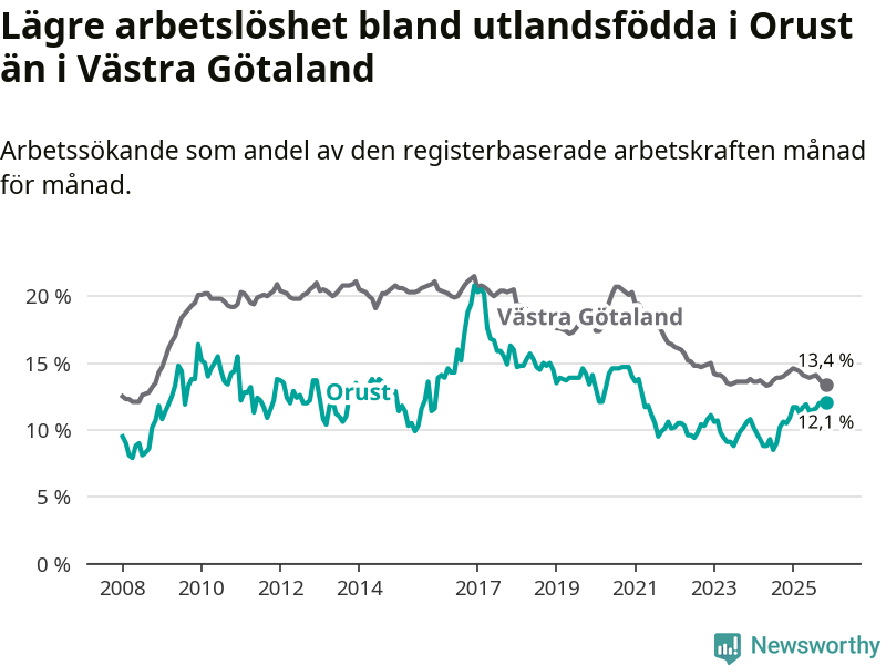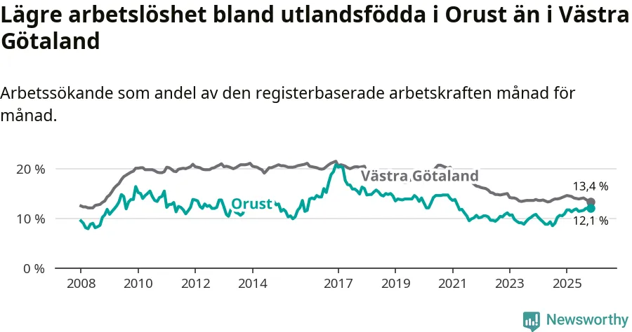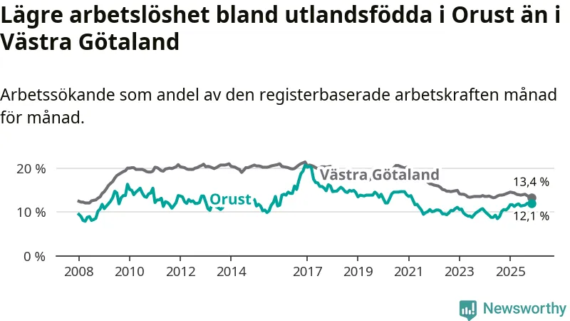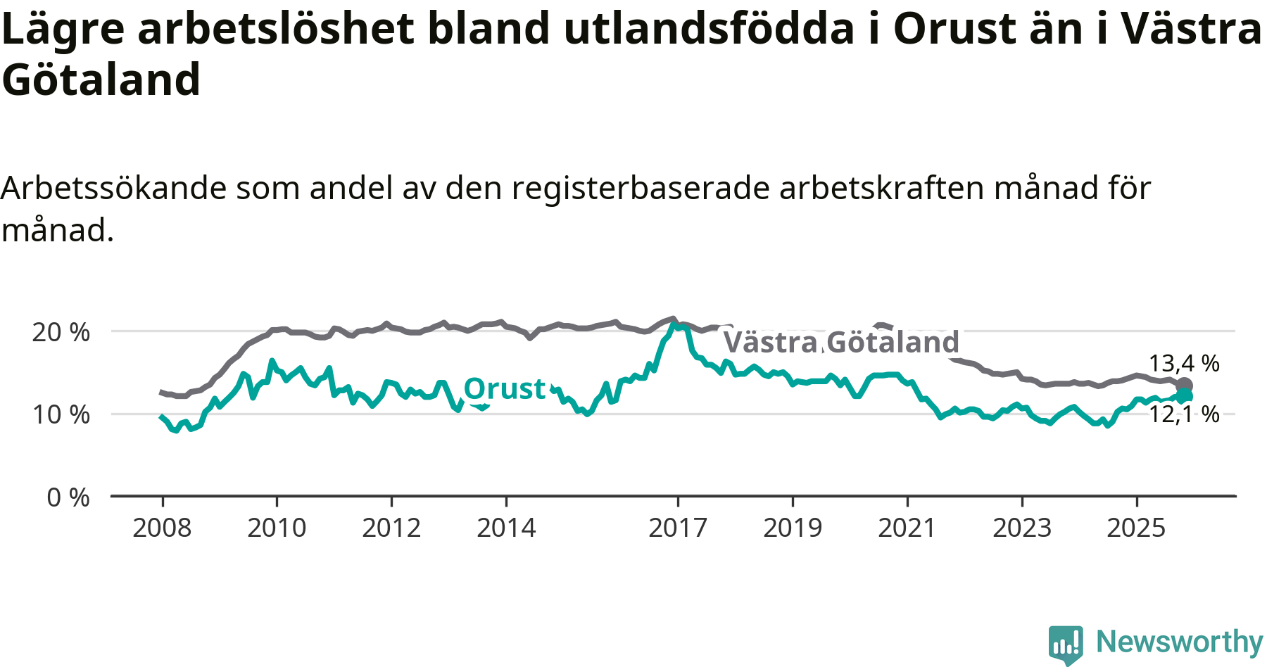 Medan arbetslösheten bland utlandsfödda alltså ökar på Orust så minskar den i Västra Götaland. Jämfört med november förra året har andelen arbetslösa utlandsfödda i länet minskat med 0,8 procentenheter (till 13,4 procent). Trots den senaste uppgången har Orust med andra ord fortfarande lägre arbetslöshet bland utlandsfödda än Västra Götaland.