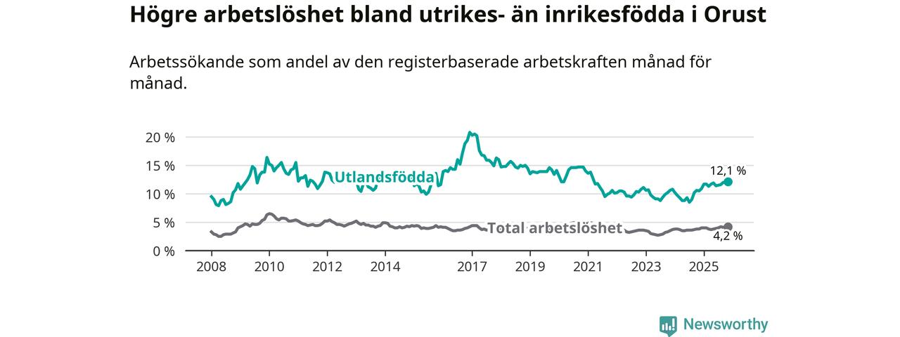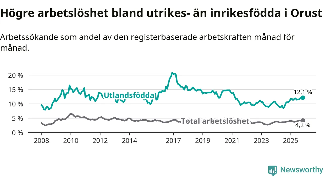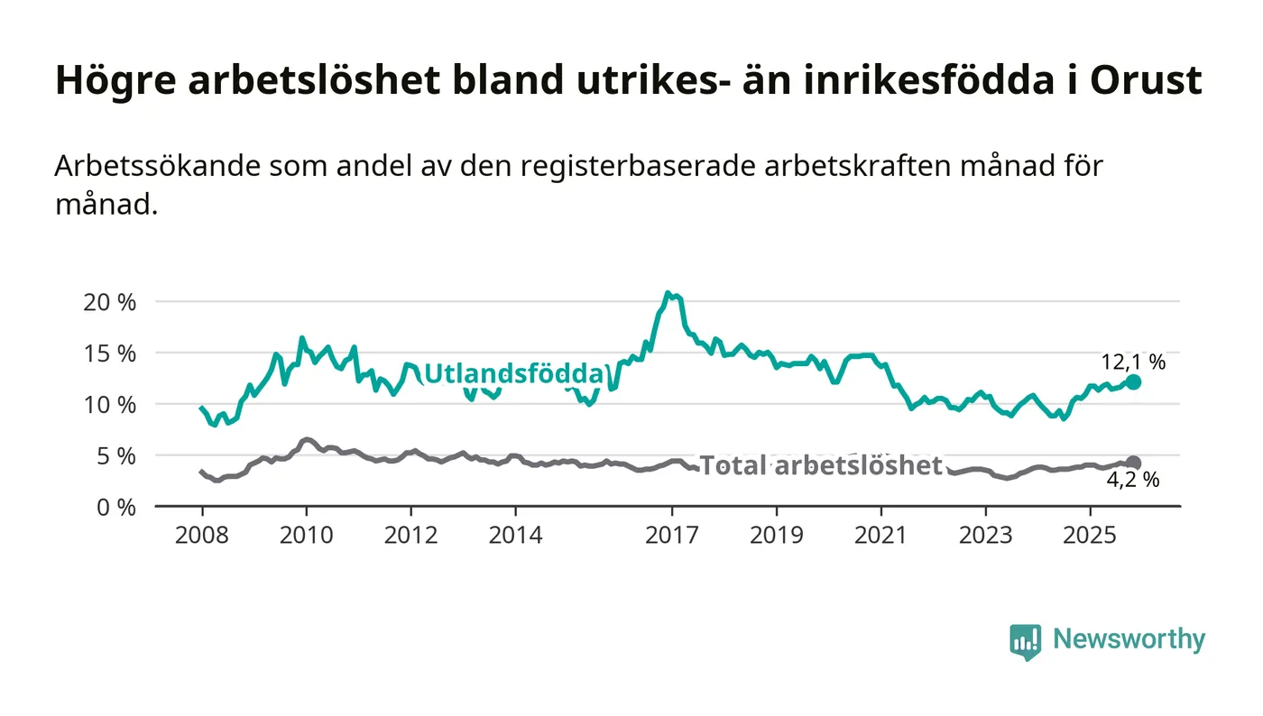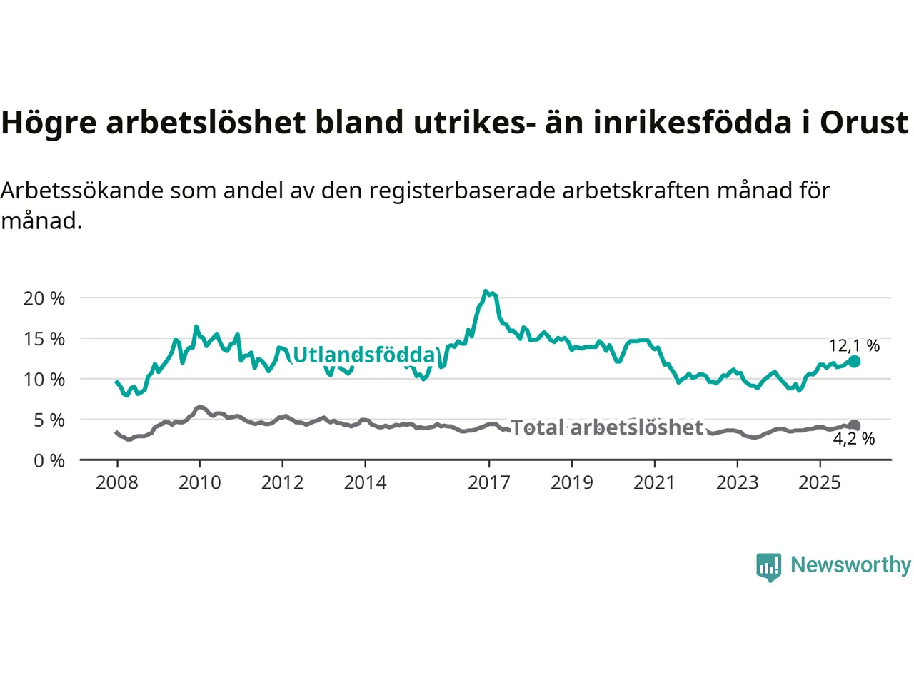 Arbetslösheten bland utlandsfödda var 12,1 procent på Orust under november månad, motsvarande 92 av 760 personer. Det är 1,6 procentenheter fler än vid samma tidpunkt i fjol (+13 om man räknar personer). Därmed är de utlandsföddas arbetslöshet högre än vid samma tidpunkt i fjol för tolfte månaden i följd. Sedan november 2024 har arbetslösheten bland utlandsfödda ökat från 10,5 till 12,1 procent. Den nuvarande arbetslöshetsnivån är den högsta sedan mars 2021.