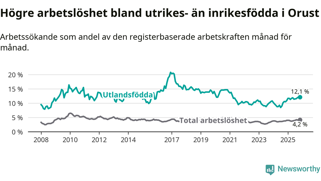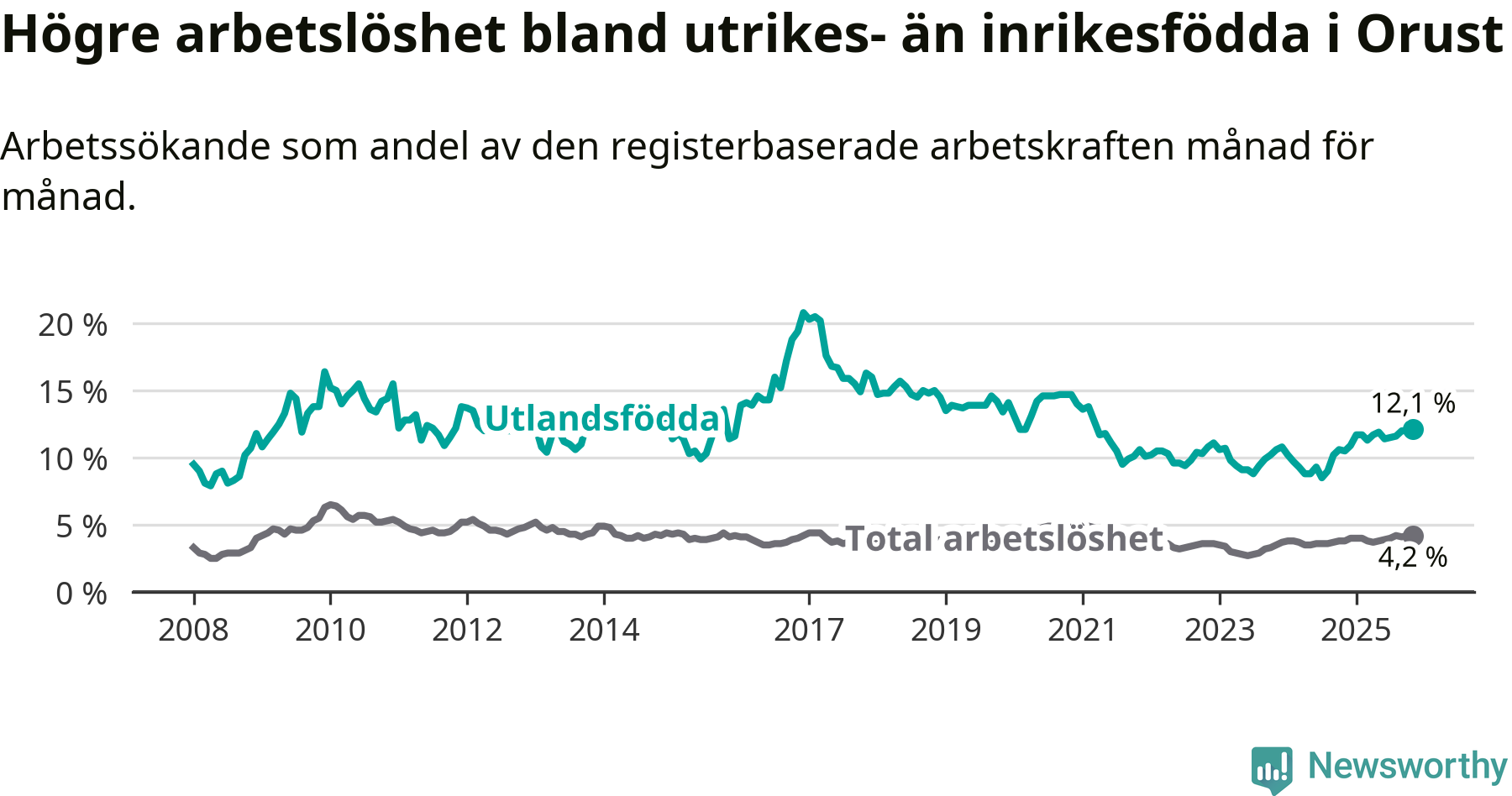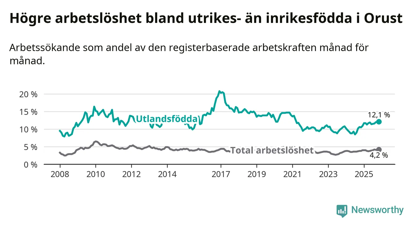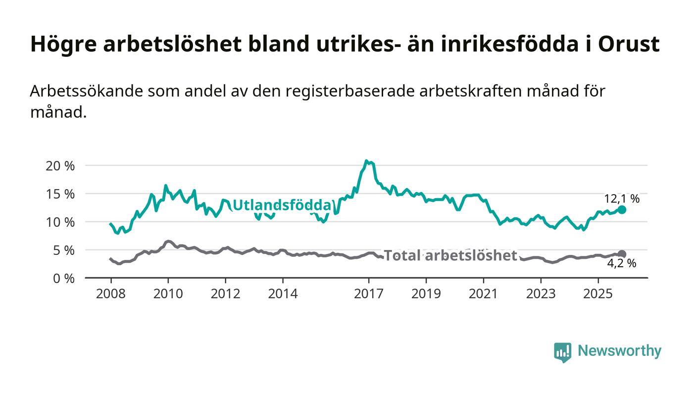 Arbetslösheten bland utlandsfödda var 12,1 procent på Orust under november månad, motsvarande 92 av 760 personer. Det är 1,6 procentenheter fler än vid samma tidpunkt i fjol (+13 om man räknar personer). Därmed är de utlandsföddas arbetslöshet högre än vid samma tidpunkt i fjol för tolfte månaden i följd. Sedan november 2024 har arbetslösheten bland utlandsfödda ökat från 10,5 till 12,1 procent. Den nuvarande arbetslöshetsnivån är den högsta sedan mars 2021.