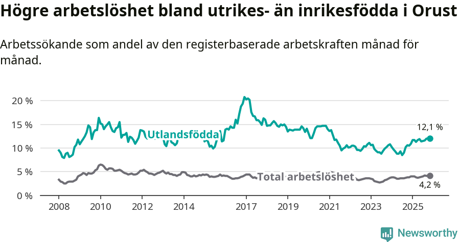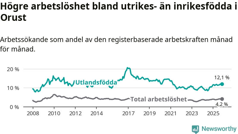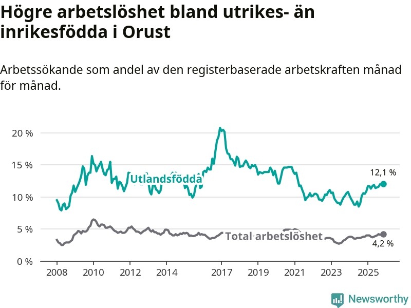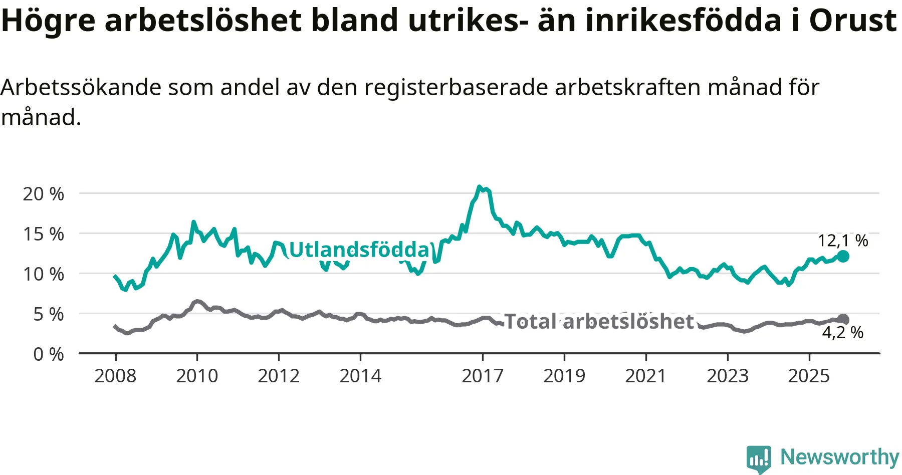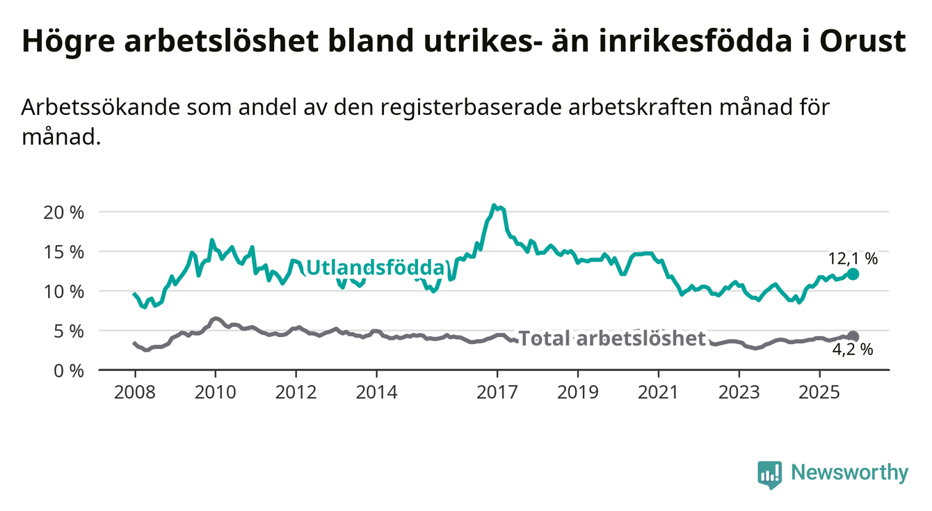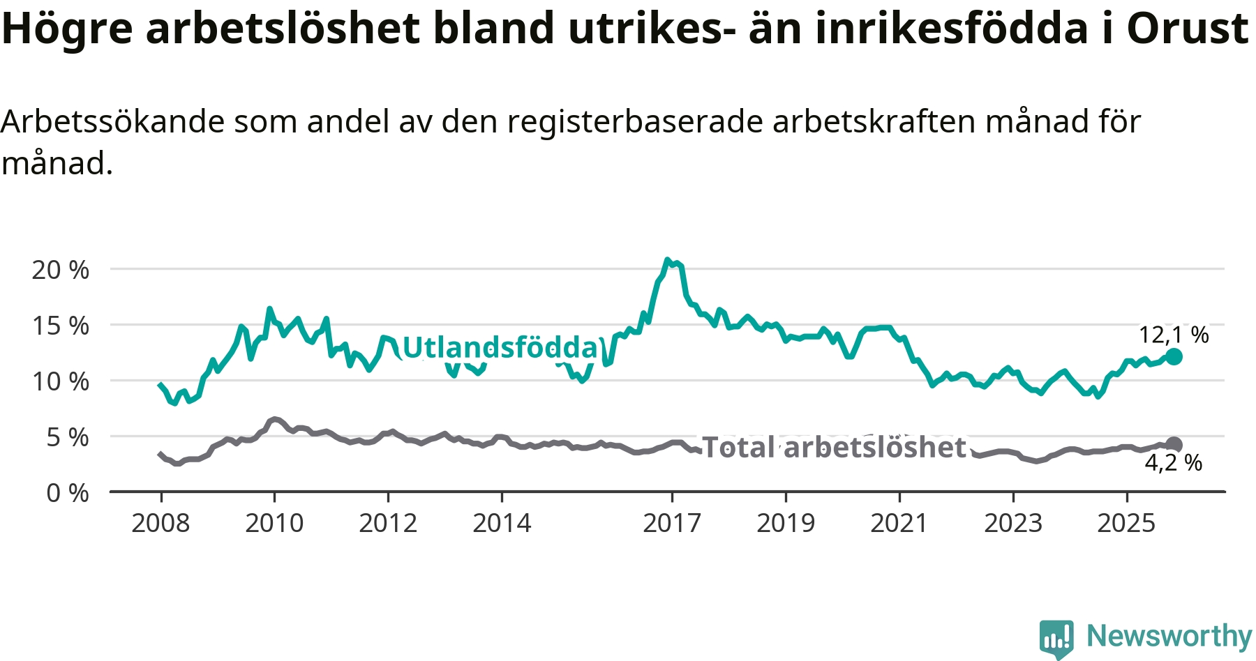 Arbetslösheten bland utlandsfödda var 12,1 procent på Orust under november månad, motsvarande 92 av 760 personer. Det är 1,6 procentenheter fler än vid samma tidpunkt i fjol (+13 om man räknar personer). Därmed är de utlandsföddas arbetslöshet högre än vid samma tidpunkt i fjol för tolfte månaden i följd. Sedan november 2024 har arbetslösheten bland utlandsfödda ökat från 10,5 till 12,1 procent. Den nuvarande arbetslöshetsnivån är den högsta sedan mars 2021.