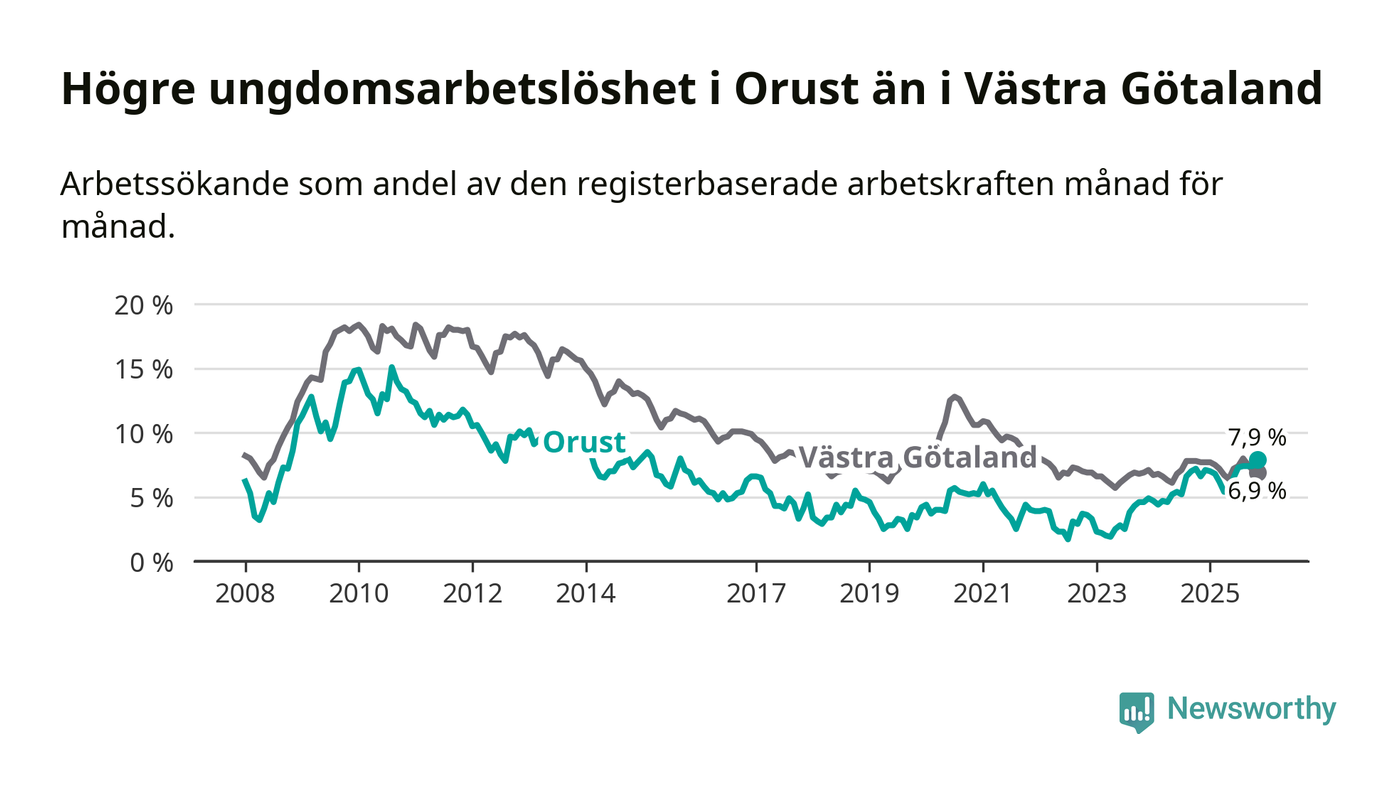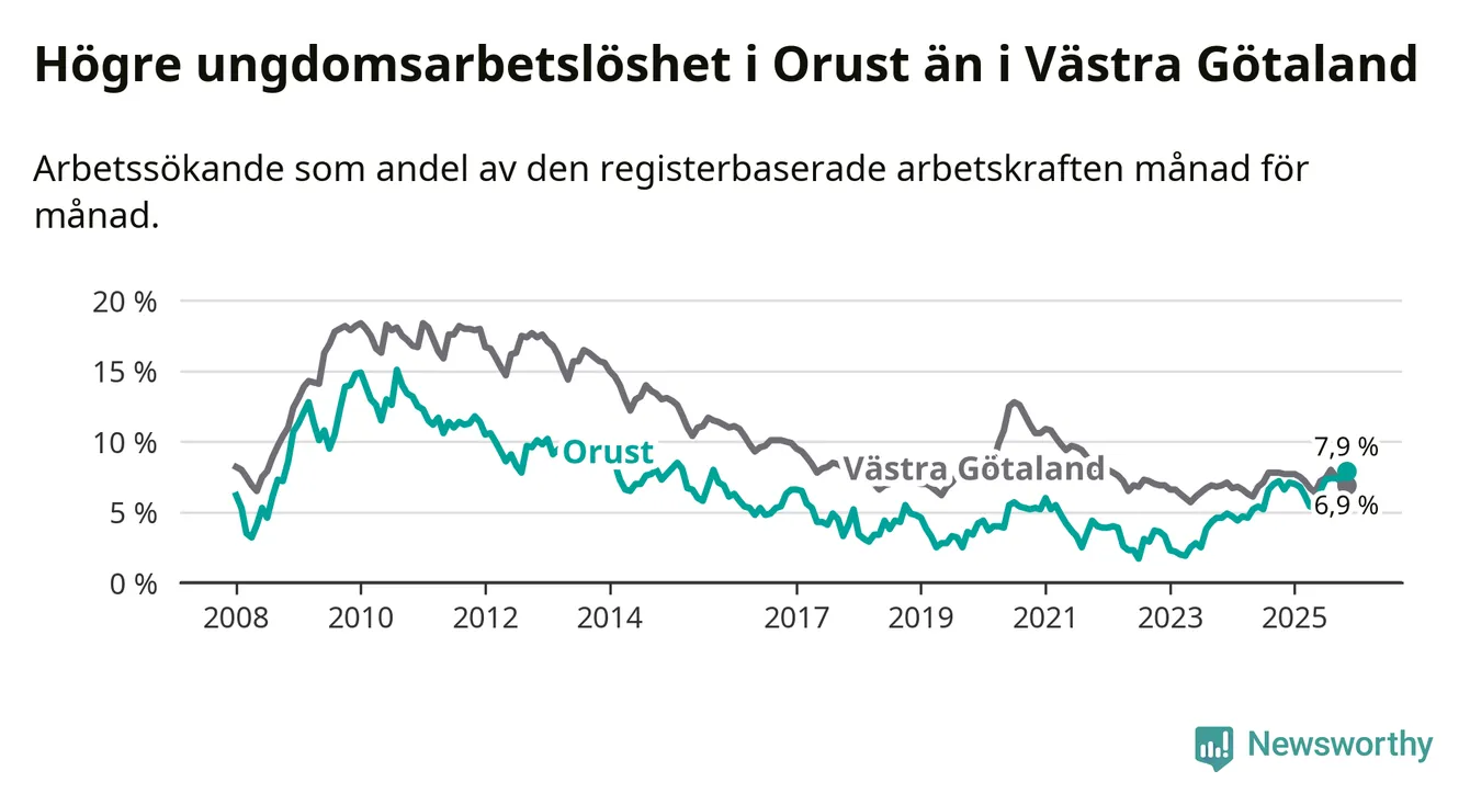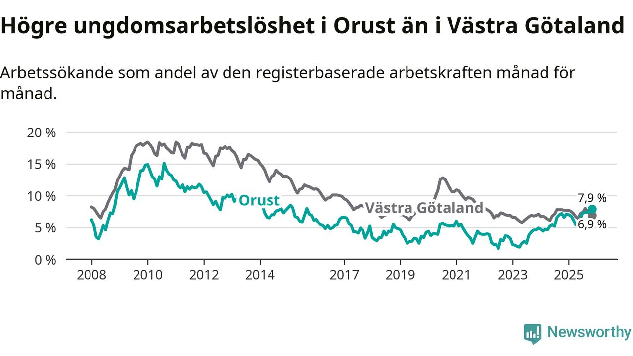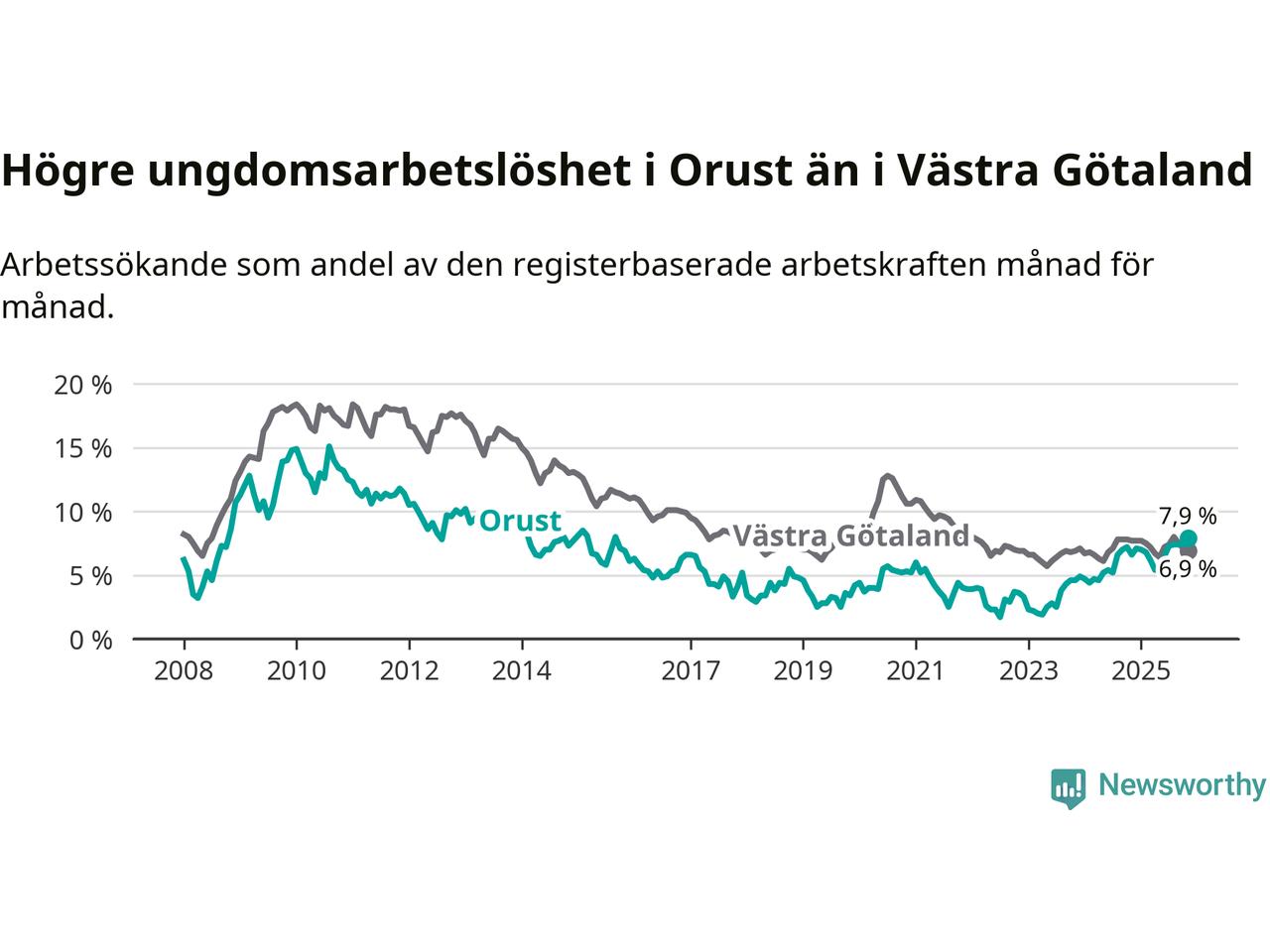Graf: Arbetslöshet bland unga i Orusts kommun och Västra Götalands län