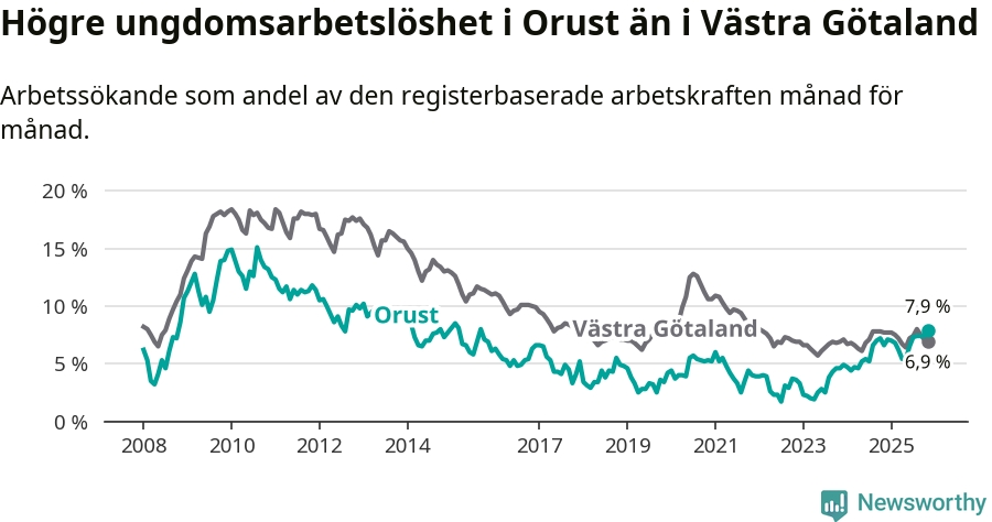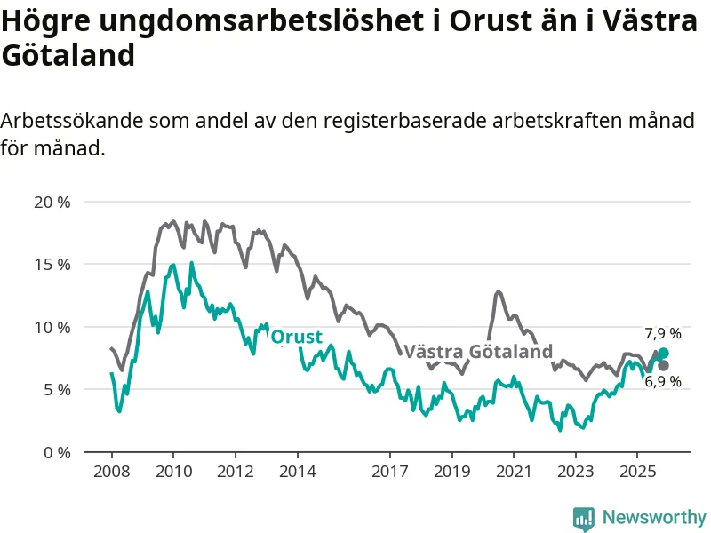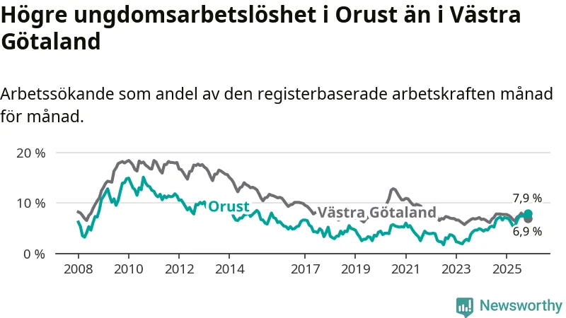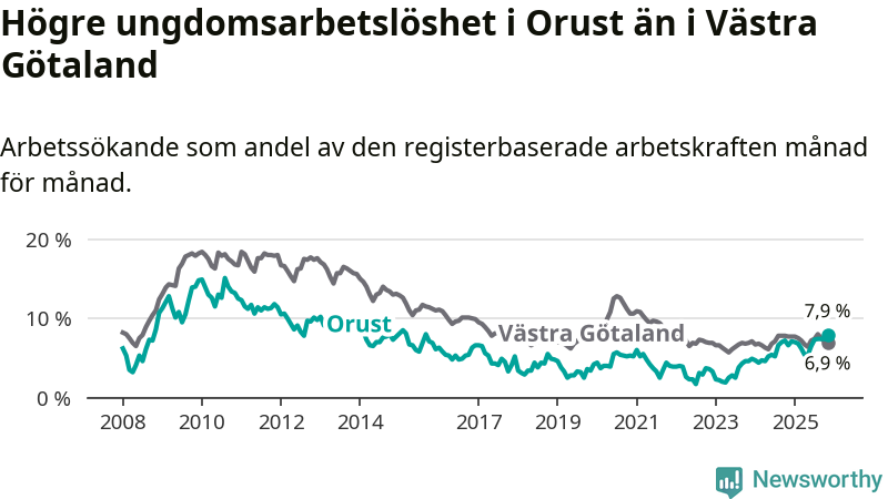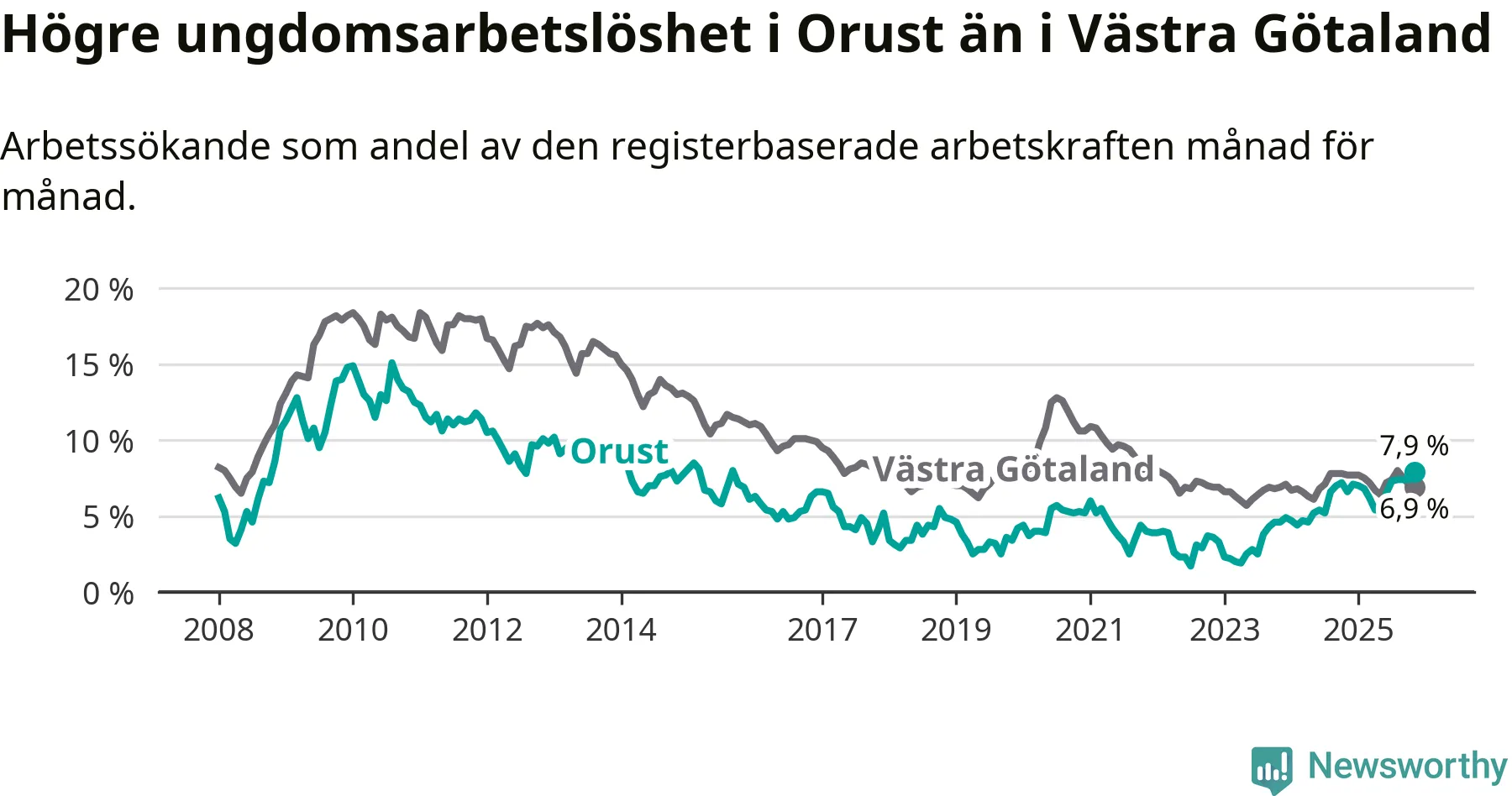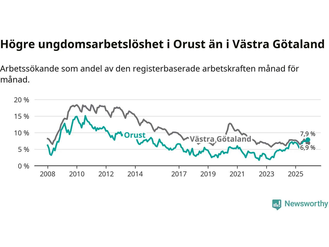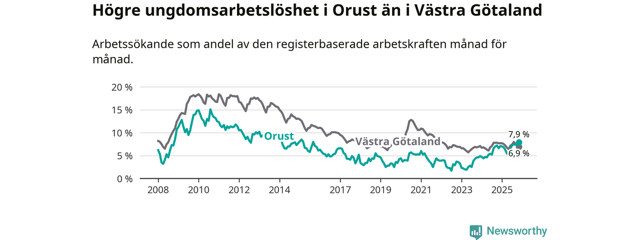 Graf: Arbetslöshet bland unga i Orusts kommun och Västra Götalands län