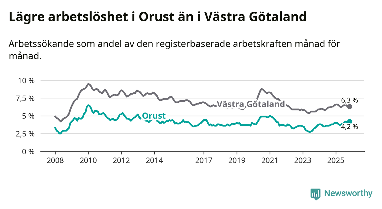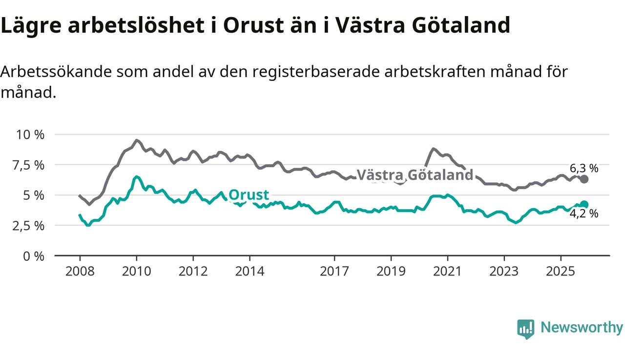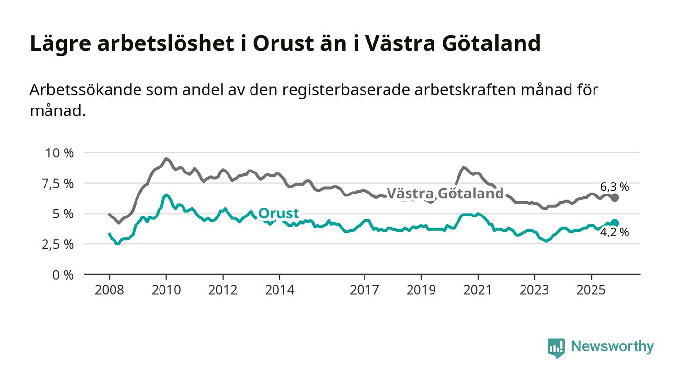 Graf: Arbetslöshet i Orusts kommun och Västra Götalands län