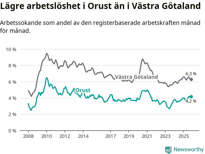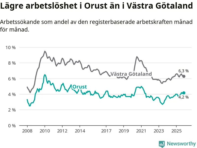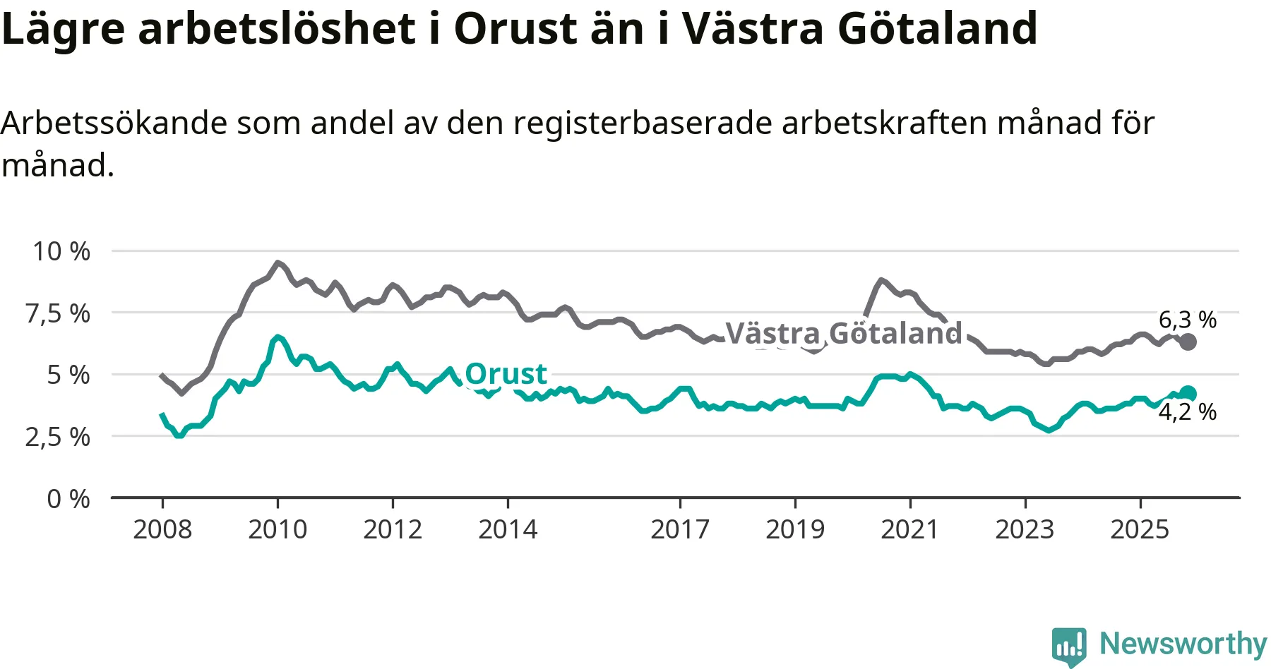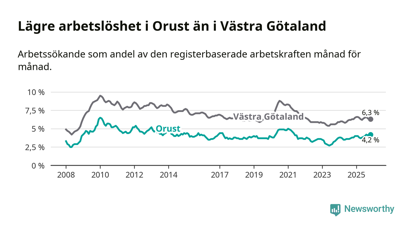 Graf: Arbetslöshet i Orusts kommun och Västra Götalands län