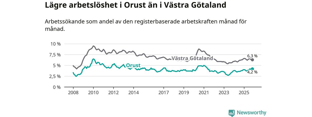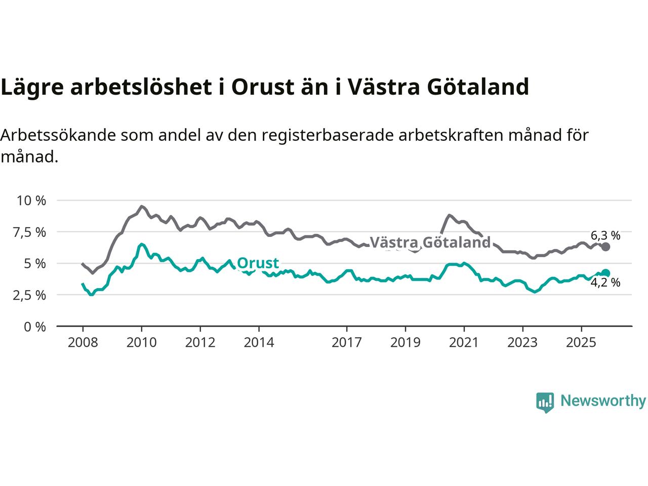 Under november månad rapporterade Orusts kommun en total arbetslöshet på 4,2 procent. Det är en ökning jämfört med samma tidpunkt i fjol (+0,4 procentenheter). I Västra Götalands län däremot står arbetslösheten stilla.