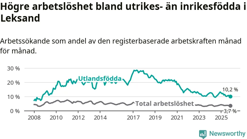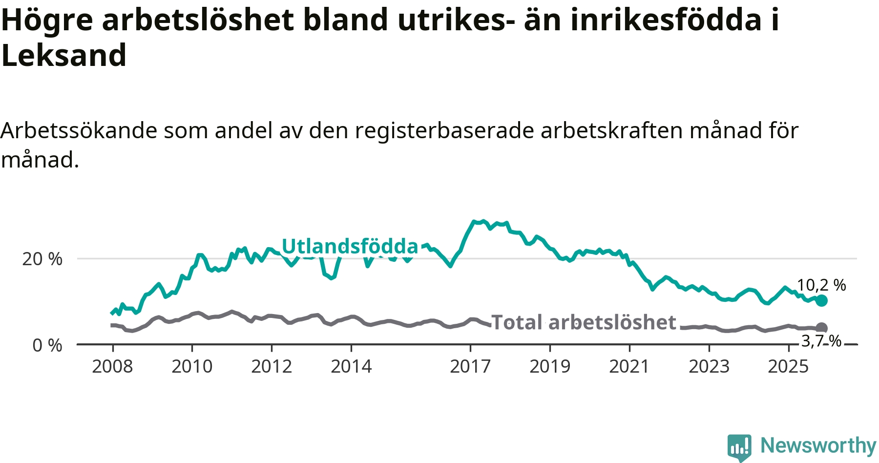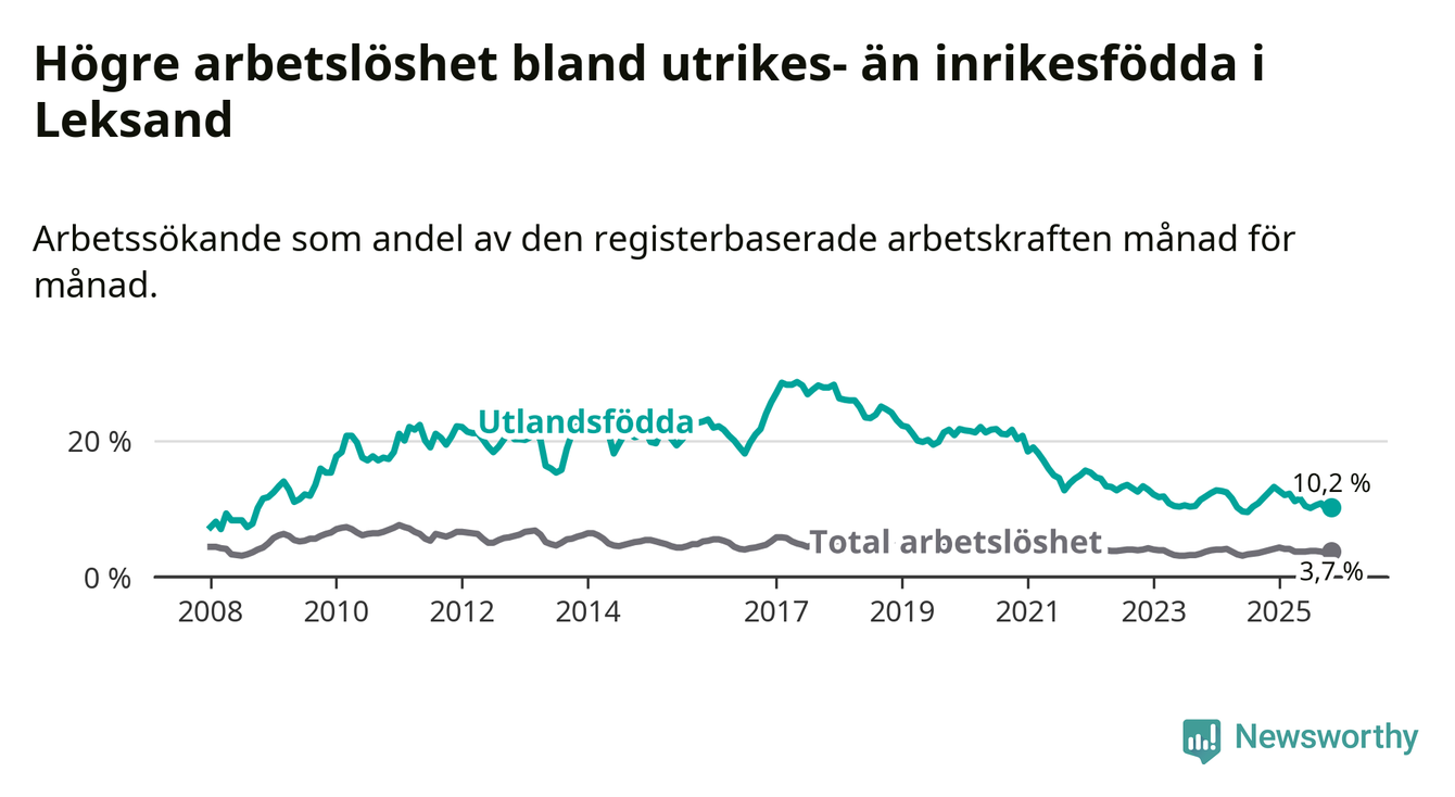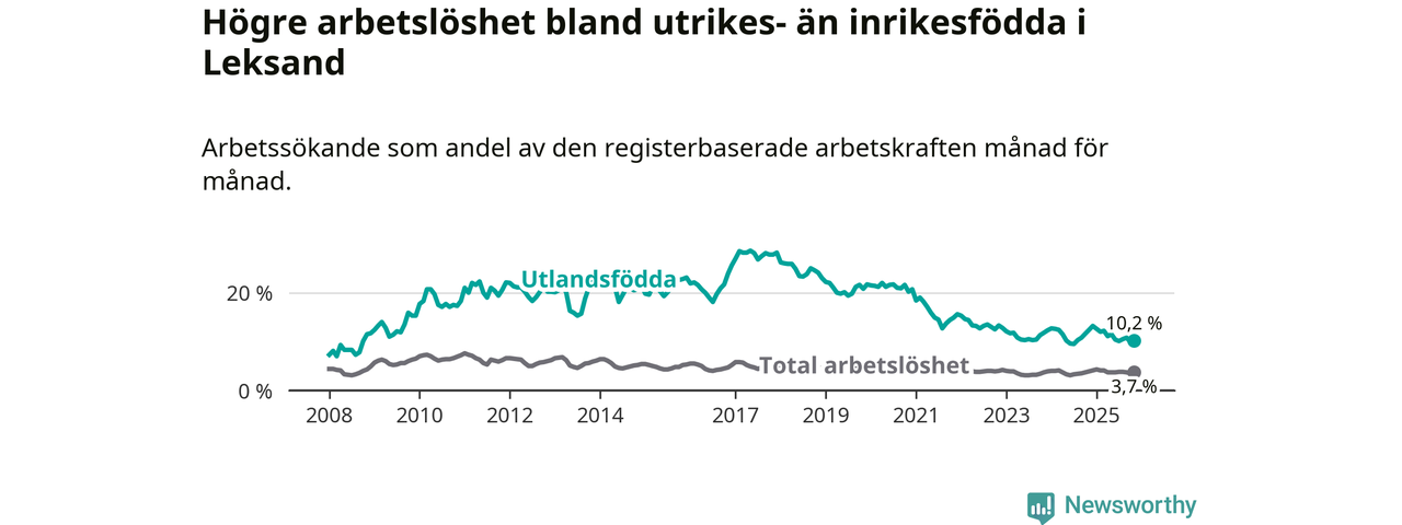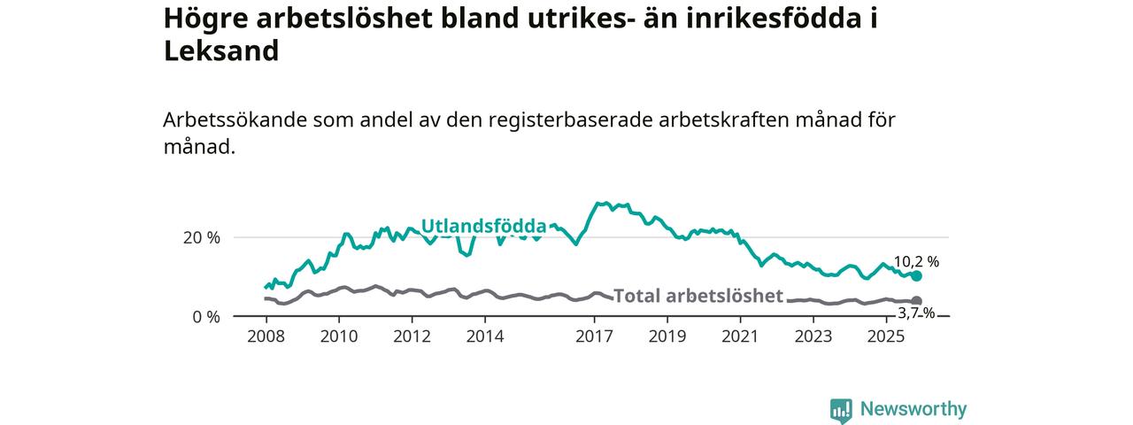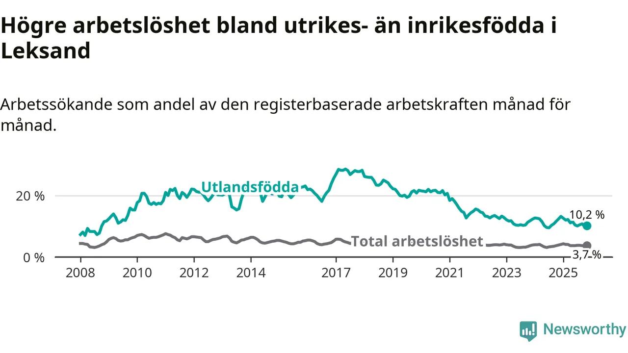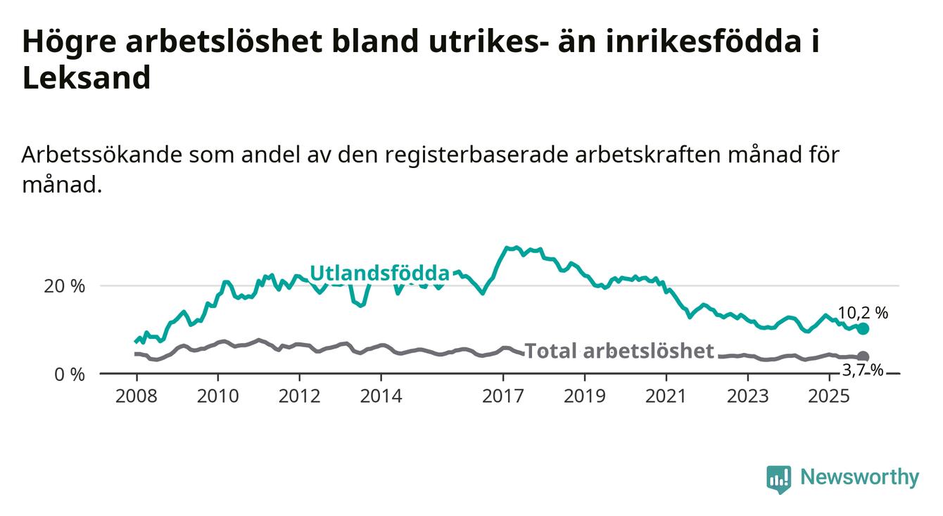 Skillnaden i arbetslöshet mellan utrikesfödda och hela befolkningen är 6,5 procentenheter i Leksand. Det är en betydligt mindre skillnad än för ett år sedan (−2,0 procentenheter).