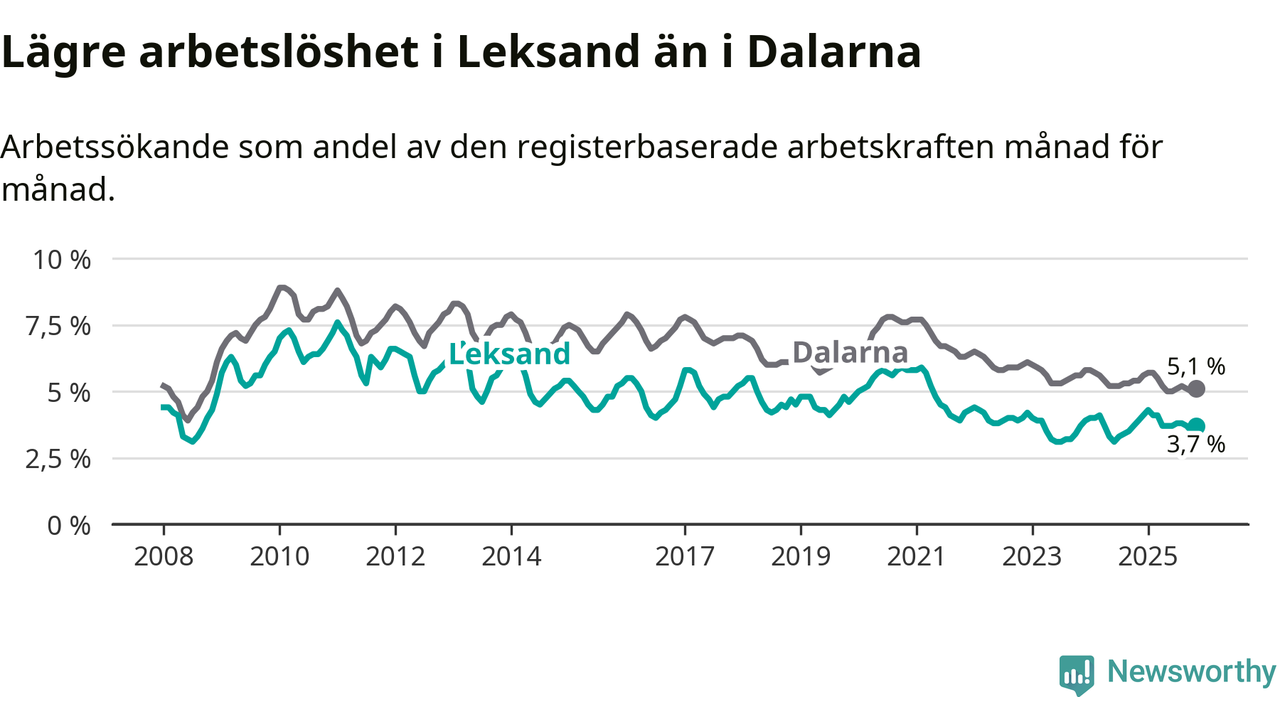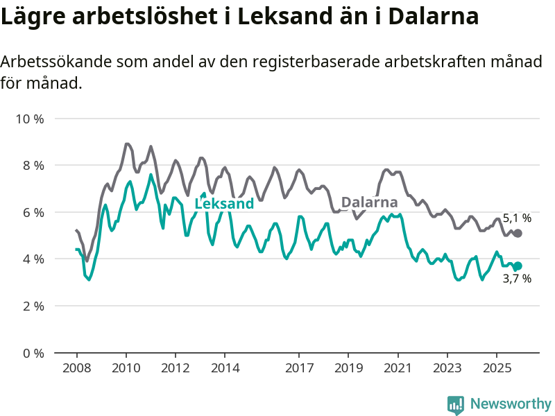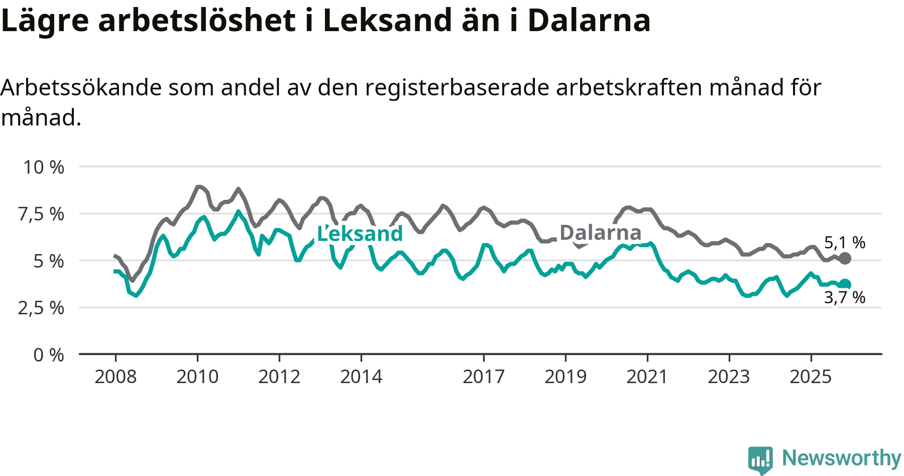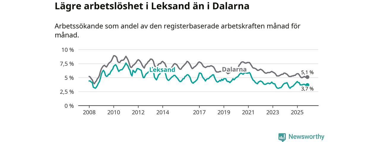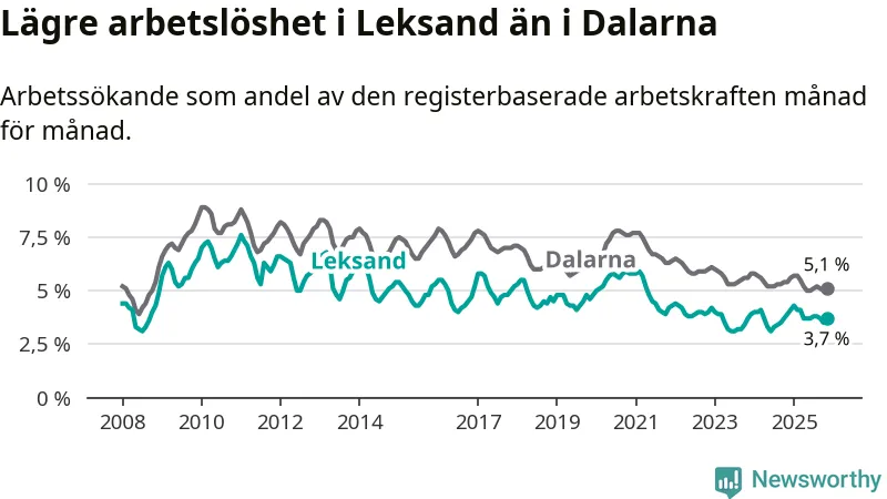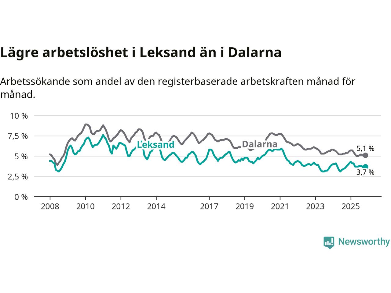Leksand hade redan tidigare lägre arbetslöshet än snittet i hela Dalarnas län och nu växer klyftan (3,7 procent i kommunen, jämfört med 5,1 procent i hela länet). Mora har den lägsta arbetslösheten i länet (3,2 procent), medan Avesta har den högsta (7,5 procent). För att Leksand skulle komma ner i samma arbetslöshetsnivå som Mora skulle 36 personer behöva sysselsättas.