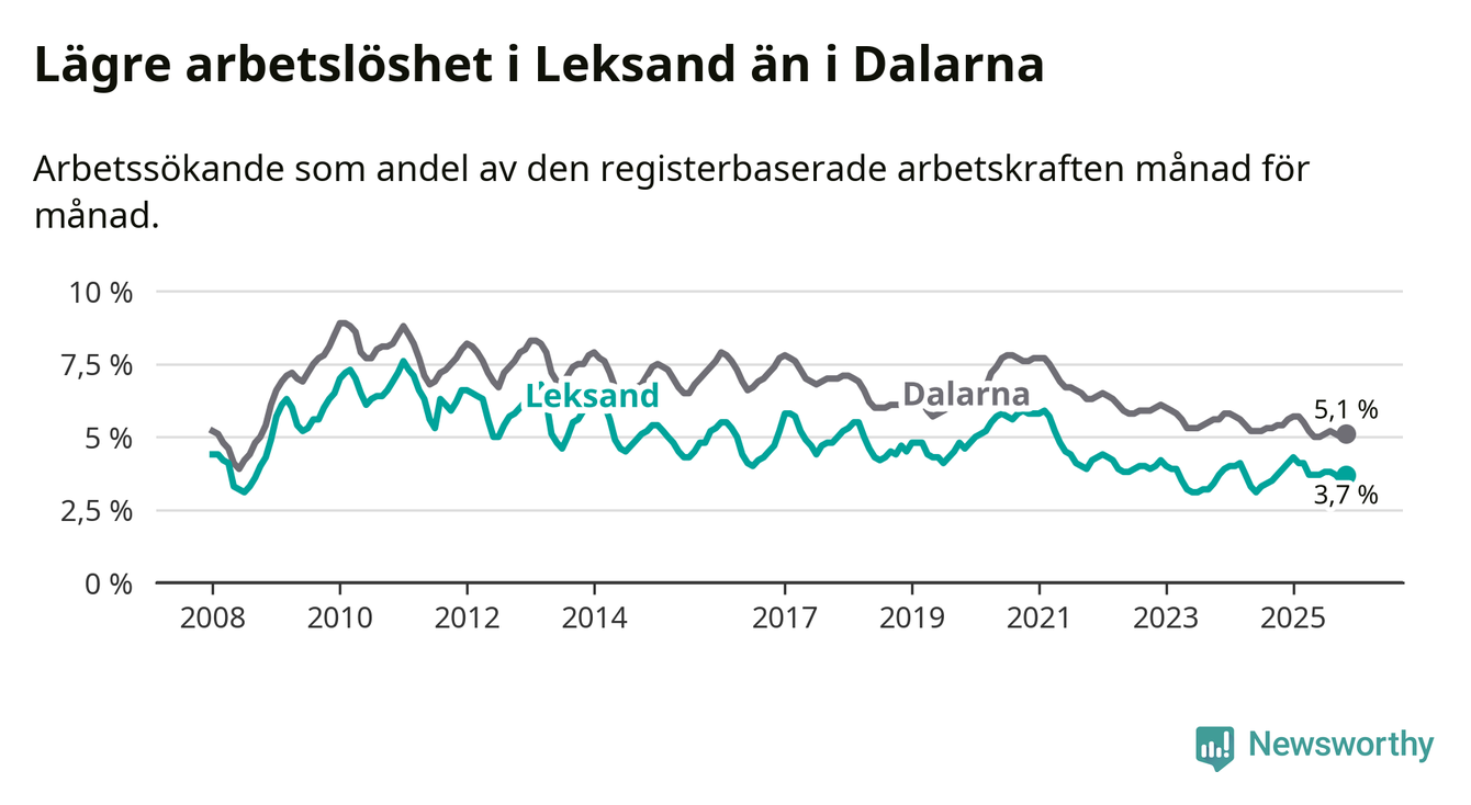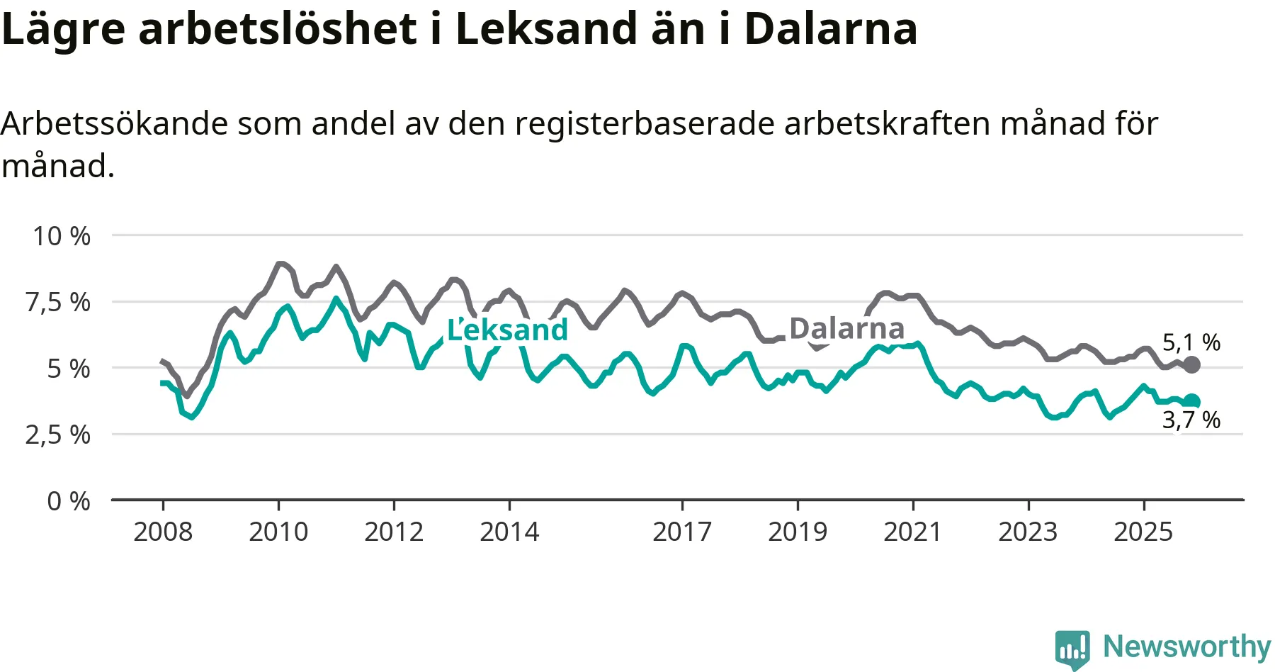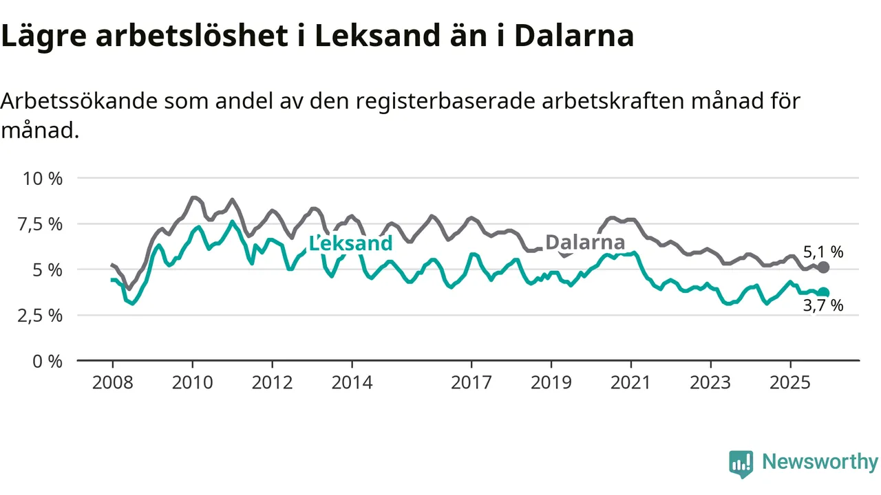 Under november månad rapporterade Leksands kommun en total arbetslöshet på 3,7 procent. Det är en minskning jämfört med samma tidpunkt i fjol (−0,2 procentenheter). Även i Dalarnas län sjunker arbetslösheten .