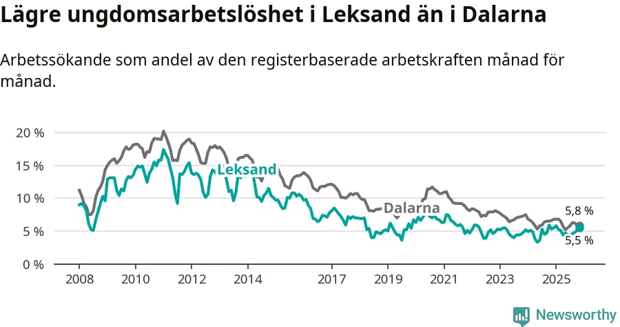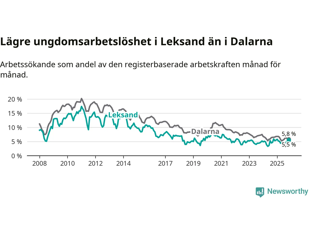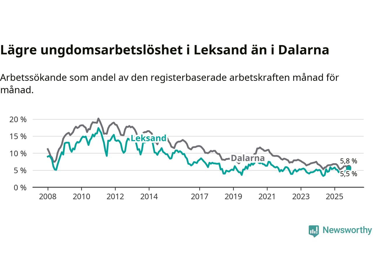 Precis som den totala arbetslösheten ligger ungdomsarbetslösheten i Leksand lägre än i Dalarna som helhet. Skillnaden mellan kommunen och länet är 0,3 procentenheter.