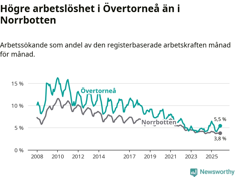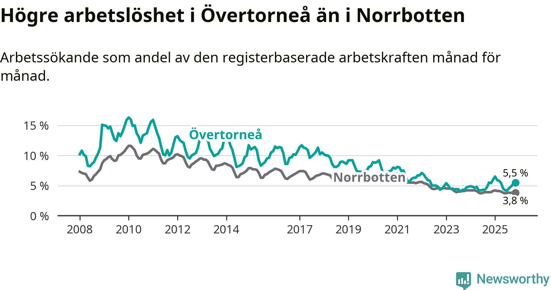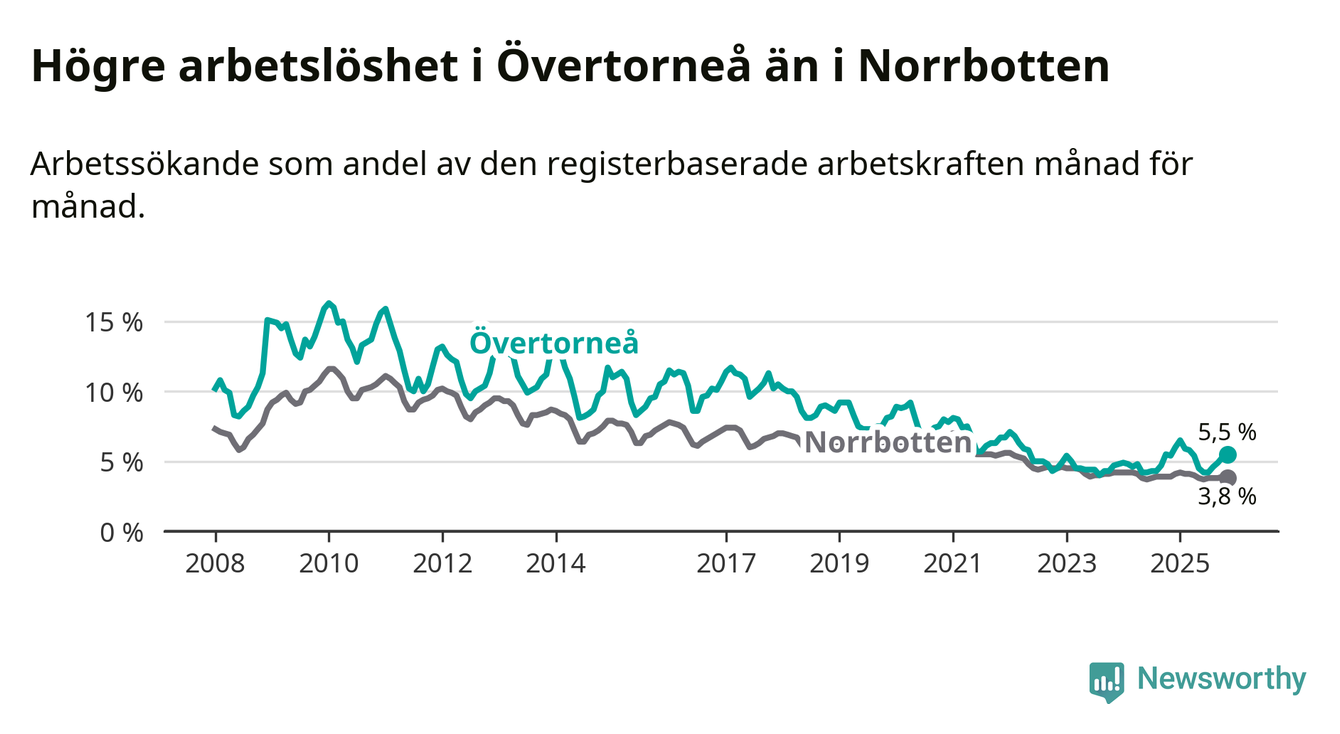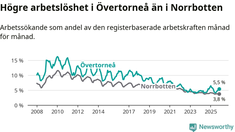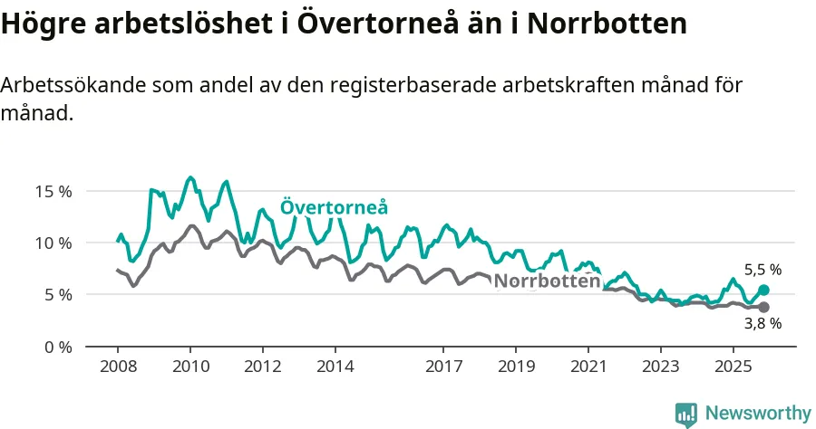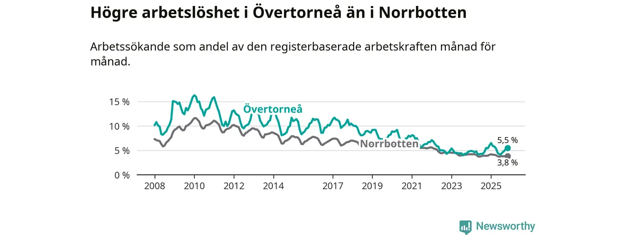 Under november månad rapporterade Övertorneå kommun en total arbetslöshet på 5,5 procent. Det är en ökning jämfört med samma tidpunkt i fjol (+0,1 procentenheter). I Norrbottens län däremot sjunker arbetslösheten något.