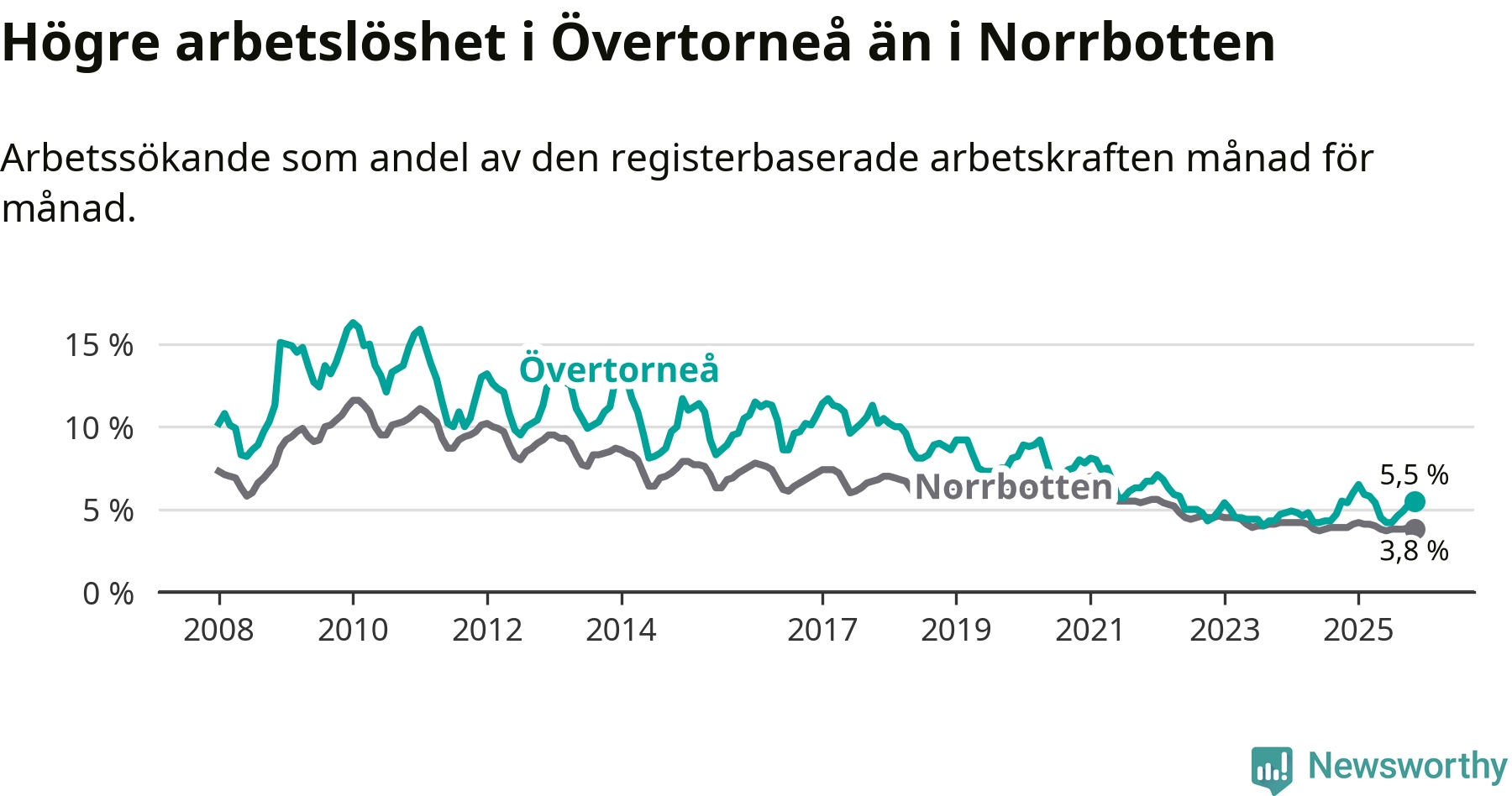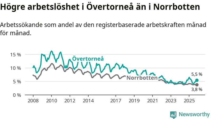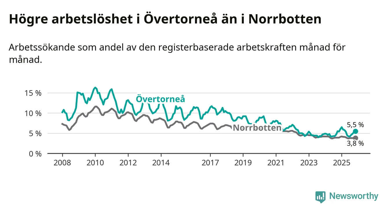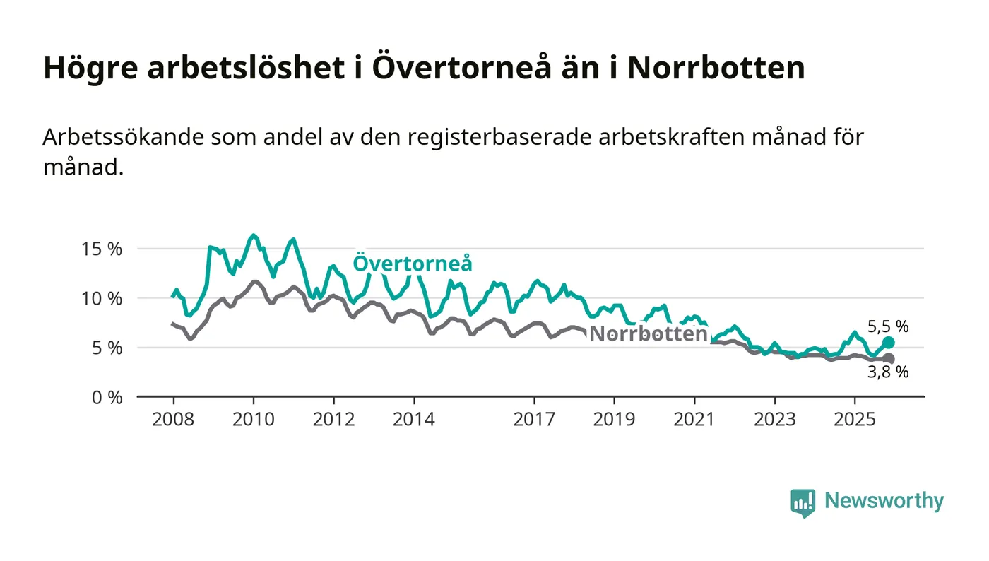 Övertorneå hade redan tidigare högre arbetslöshet än snittet i hela Norrbottens län och nu växer klyftan (5,5 procent i kommunen, jämfört med 3,8 procent i hela länet). Kiruna har den lägsta arbetslösheten i länet (2,5 procent), medan Haparanda har den högsta (7,0 procent). För att Övertorneå skulle komma ner i samma arbetslöshetsnivå som Kiruna skulle 48 personer behöva sysselsättas.