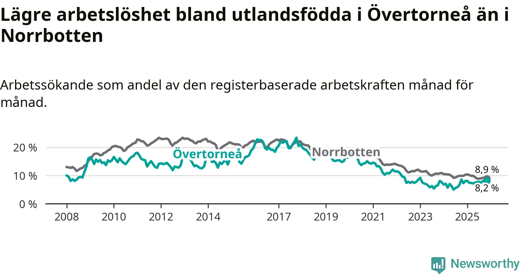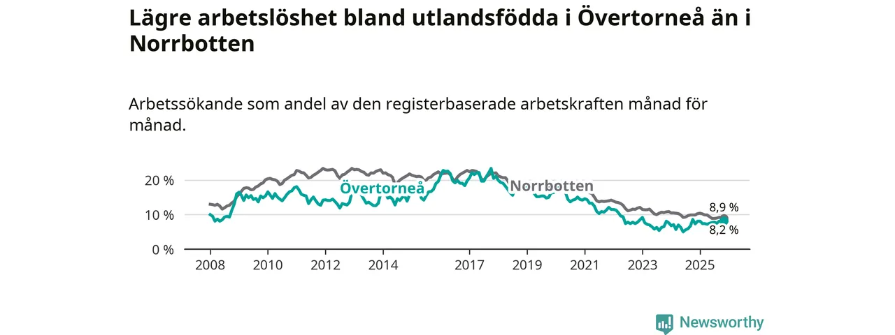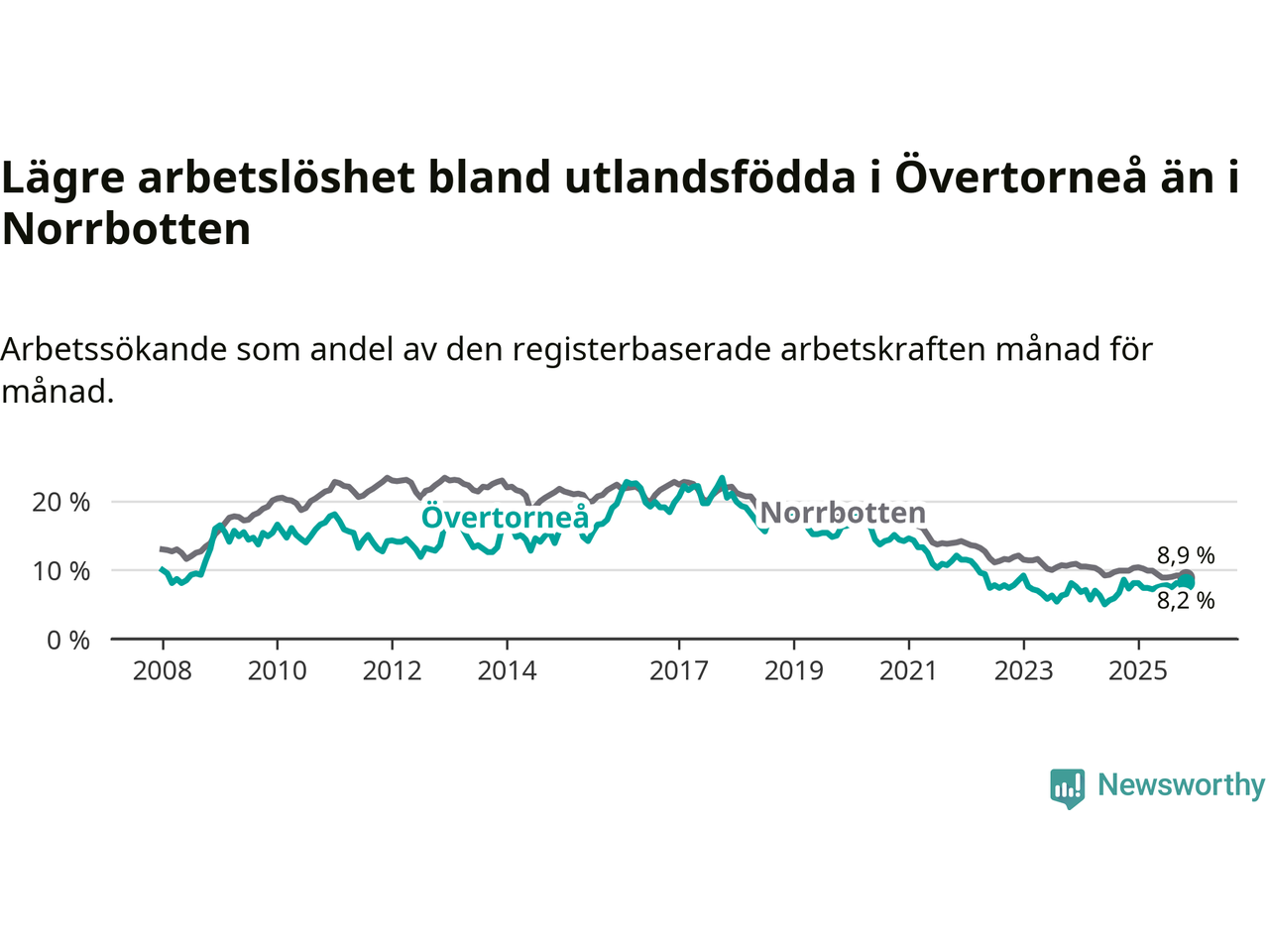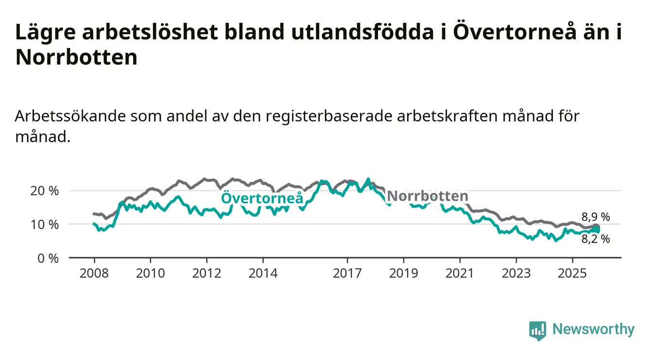 Medan arbetslösheten bland utlandsfödda alltså ökar i Övertorneå så minskar den i Norrbotten. Jämfört med november förra året har andelen arbetslösa utlandsfödda i länet minskat med 1,0 procentenheter (till 8,9 procent). Trots den senaste uppgången har Övertorneå med andra ord fortfarande lägre arbetslöshet bland utlandsfödda än Norrbotten.