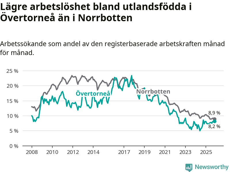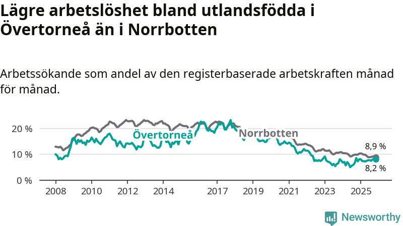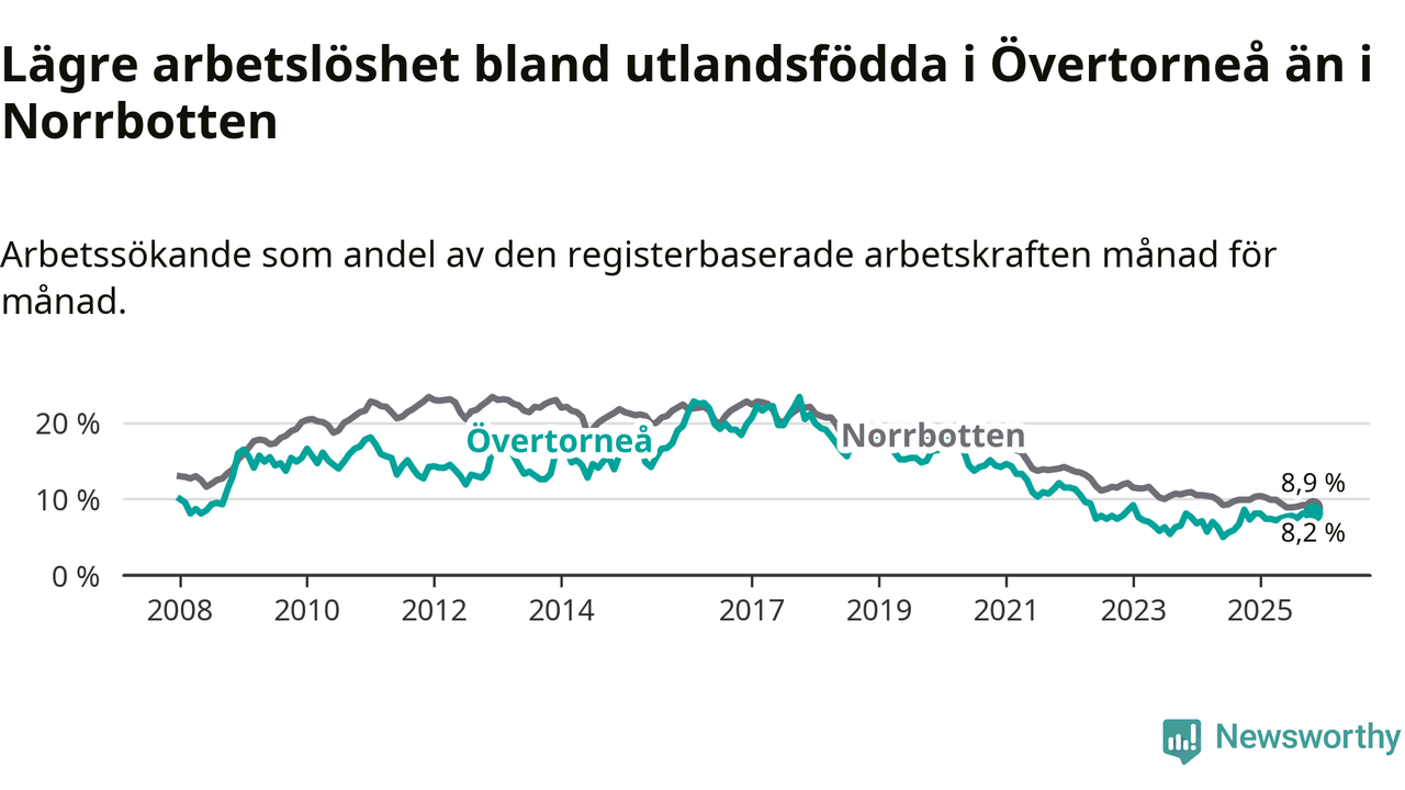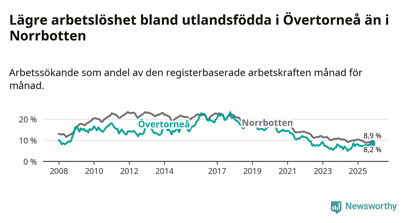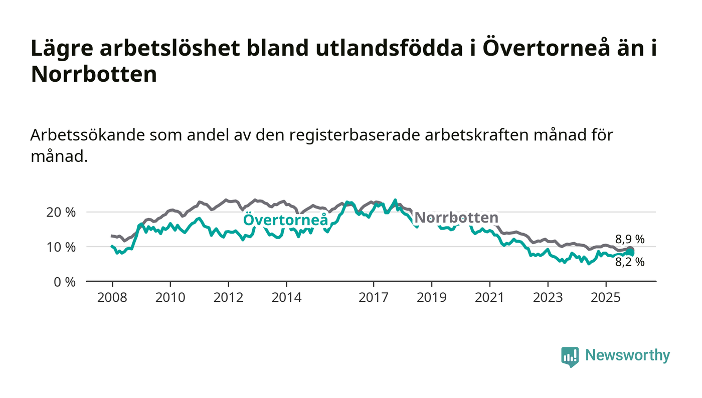 Medan arbetslösheten bland utlandsfödda alltså ökar i Övertorneå så minskar den i Norrbotten. Jämfört med november förra året har andelen arbetslösa utlandsfödda i länet minskat med 1,0 procentenheter (till 8,9 procent). Trots den senaste uppgången har Övertorneå med andra ord fortfarande lägre arbetslöshet bland utlandsfödda än Norrbotten.