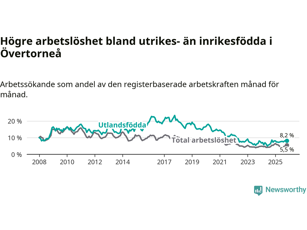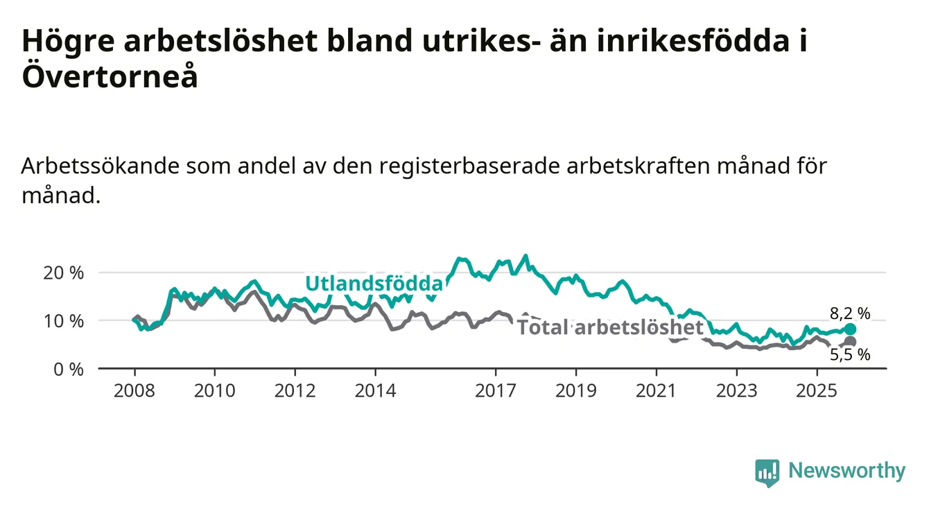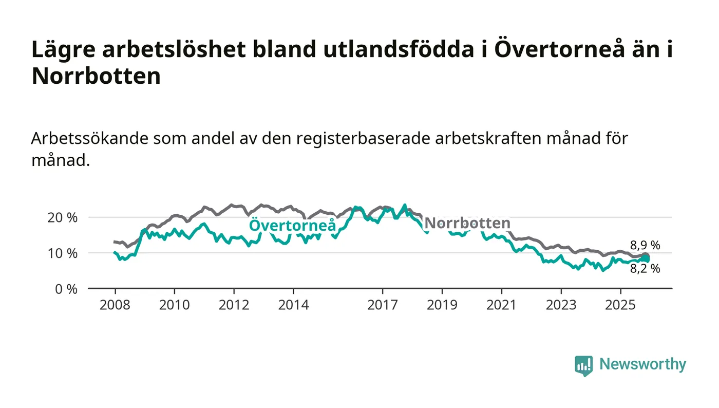 Arbetslösheten bland utlandsfödda var 8,2 procent i Övertorneå under november månad, motsvarande 30 av 366 personer. Det är 0,9 procentenheter fler än vid samma tidpunkt i fjol (+2 om man räknar personer). Den senaste månadens uppgång innebär ett trendbrott. Under de ett föregående månaderna hade arbetslösheten bland utlandsfödda varit lägre än motsvarande tidpunkt året innan.