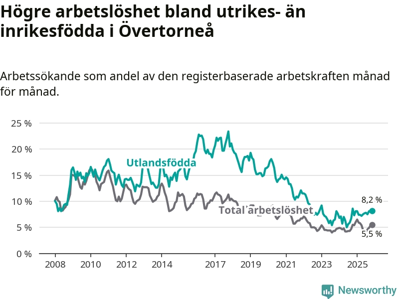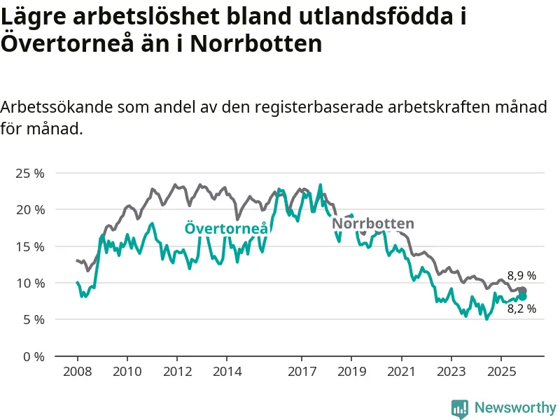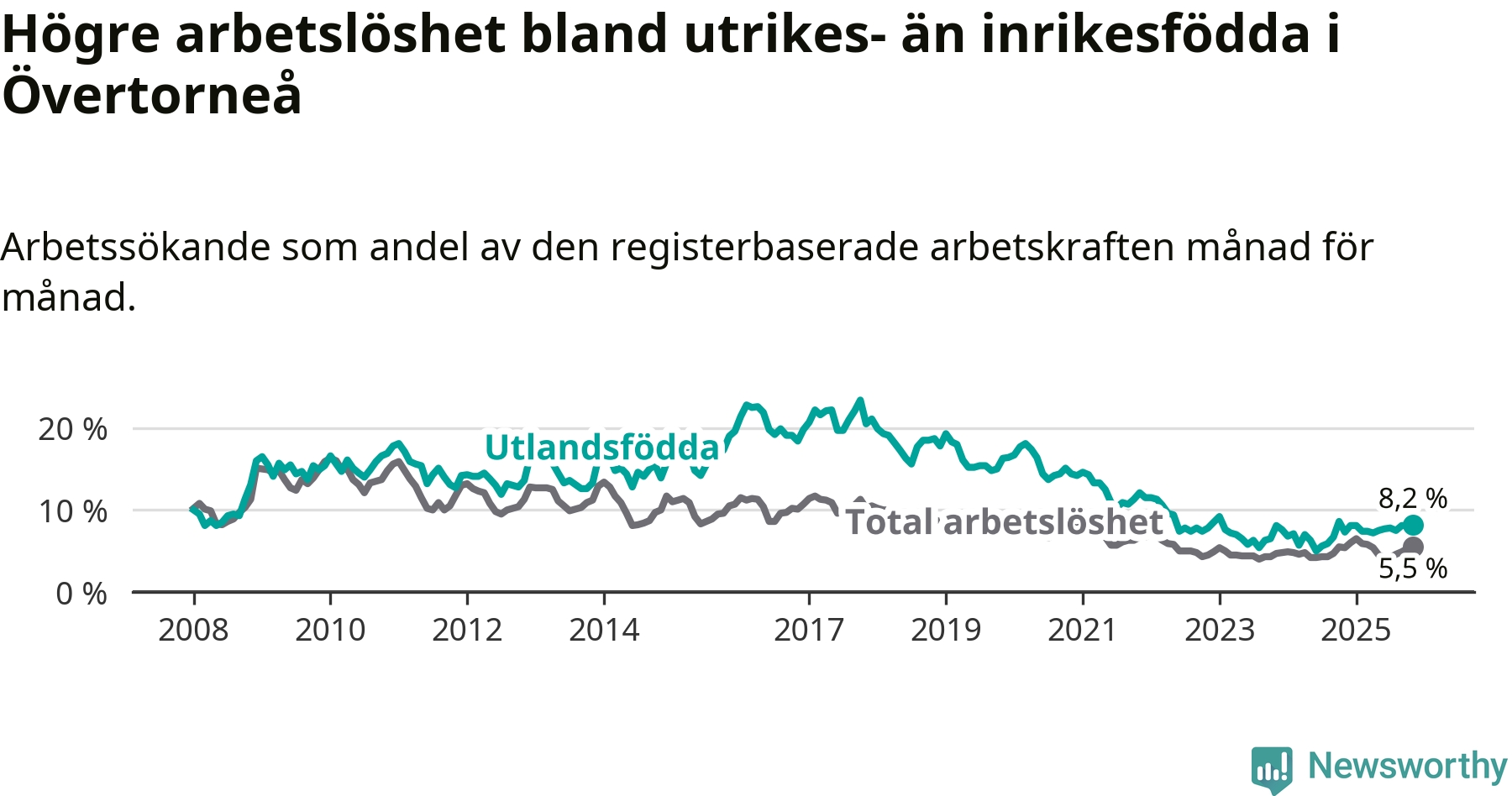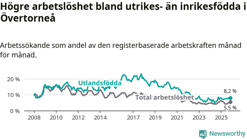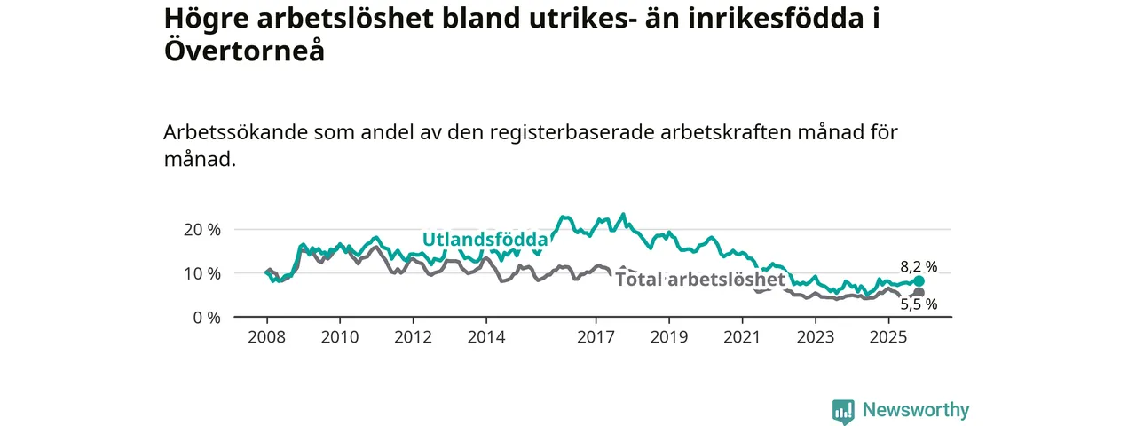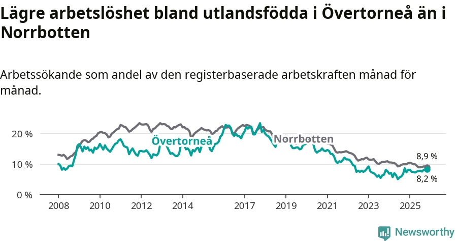 Arbetslösheten bland utlandsfödda var 8,2 procent i Övertorneå under november månad, motsvarande 30 av 366 personer. Det är 0,9 procentenheter fler än vid samma tidpunkt i fjol (+2 om man räknar personer). Den senaste månadens uppgång innebär ett trendbrott. Under de ett föregående månaderna hade arbetslösheten bland utlandsfödda varit lägre än motsvarande tidpunkt året innan.