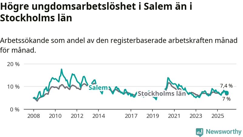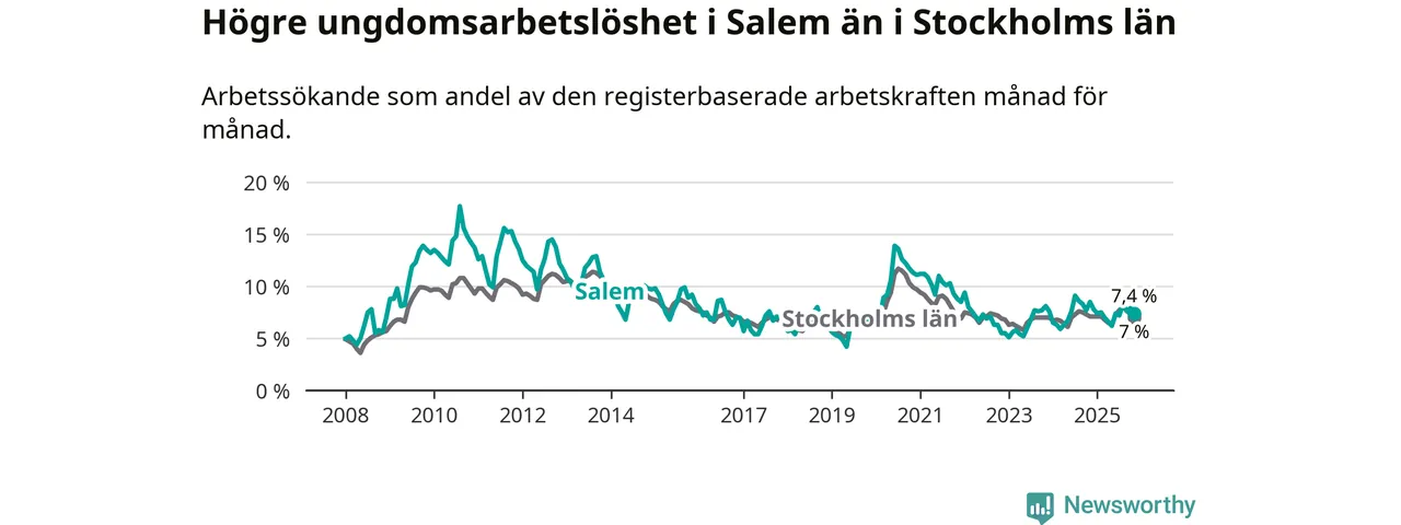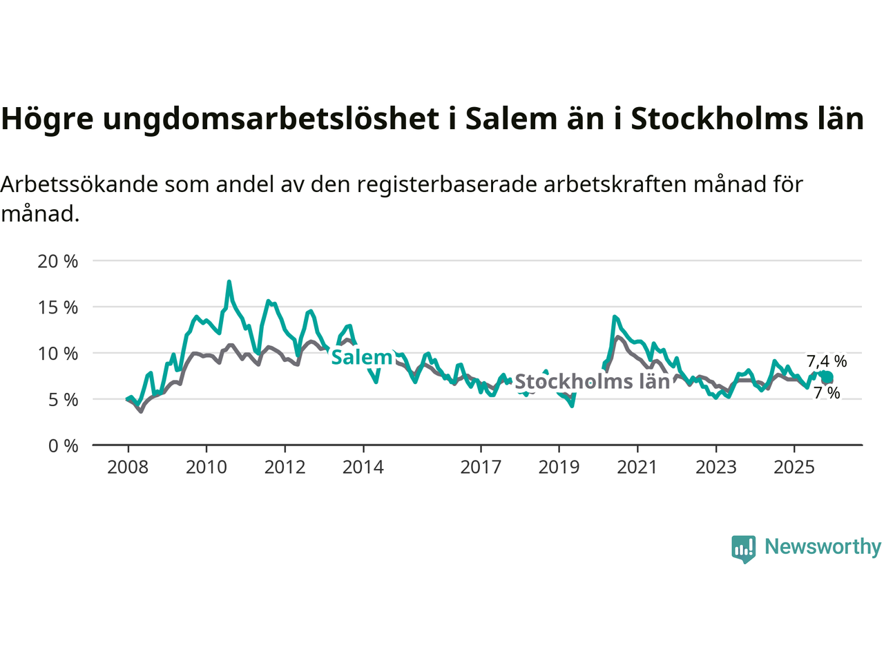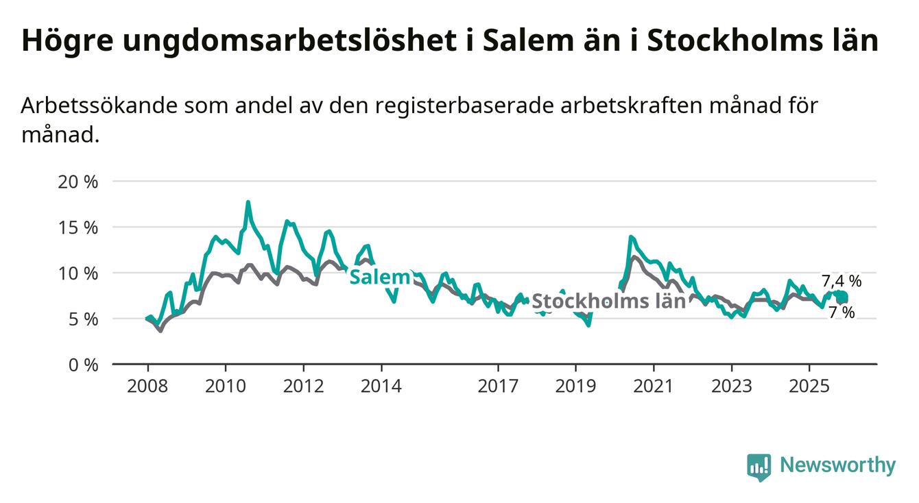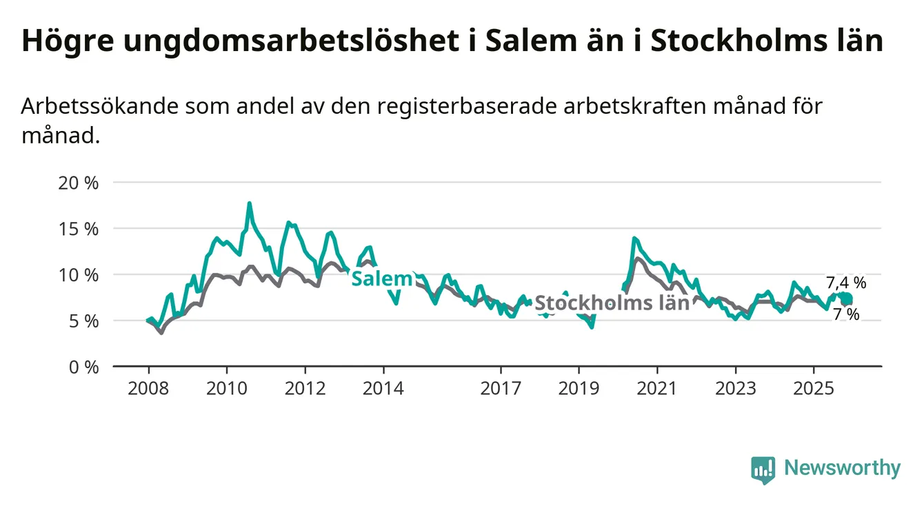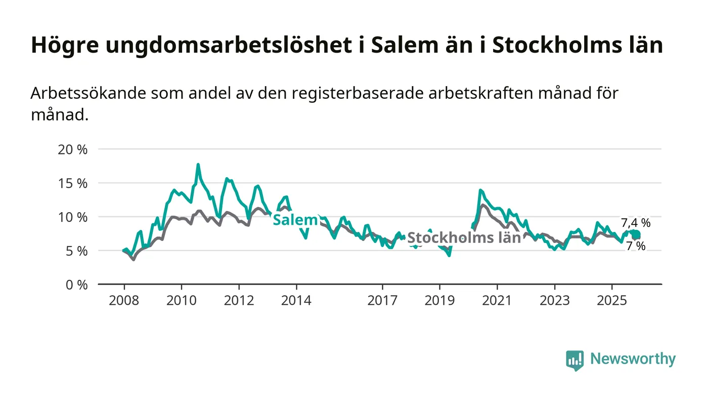 Medan Salem har lägre total arbetslöshet än Stockholms län, ligger ungdomsarbetslösheten 0,4 procentenheter högre i Salem.