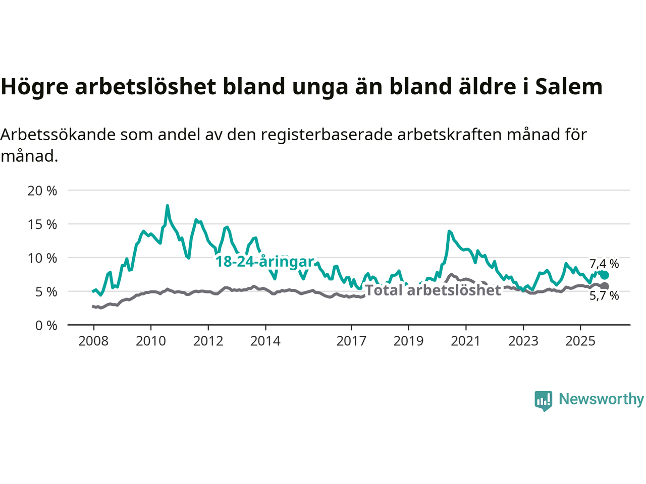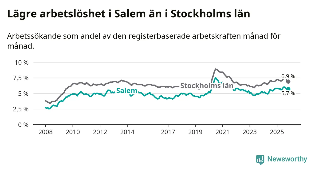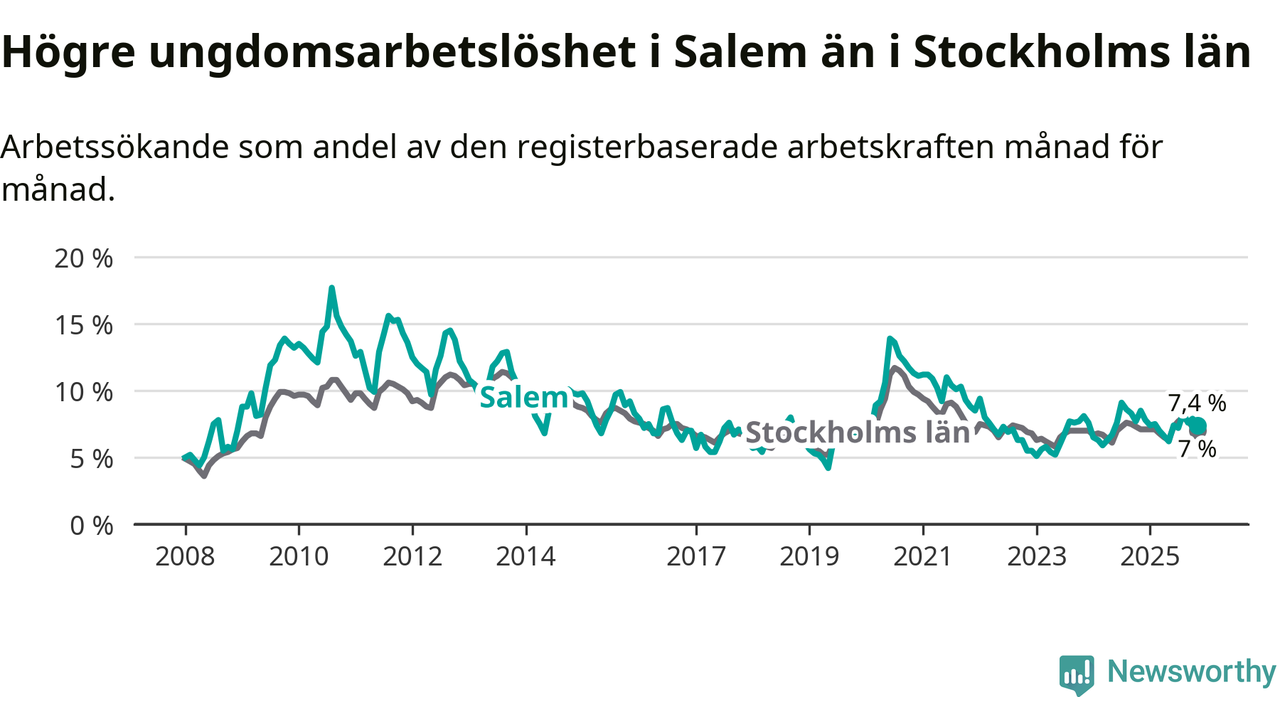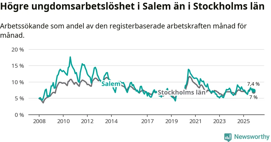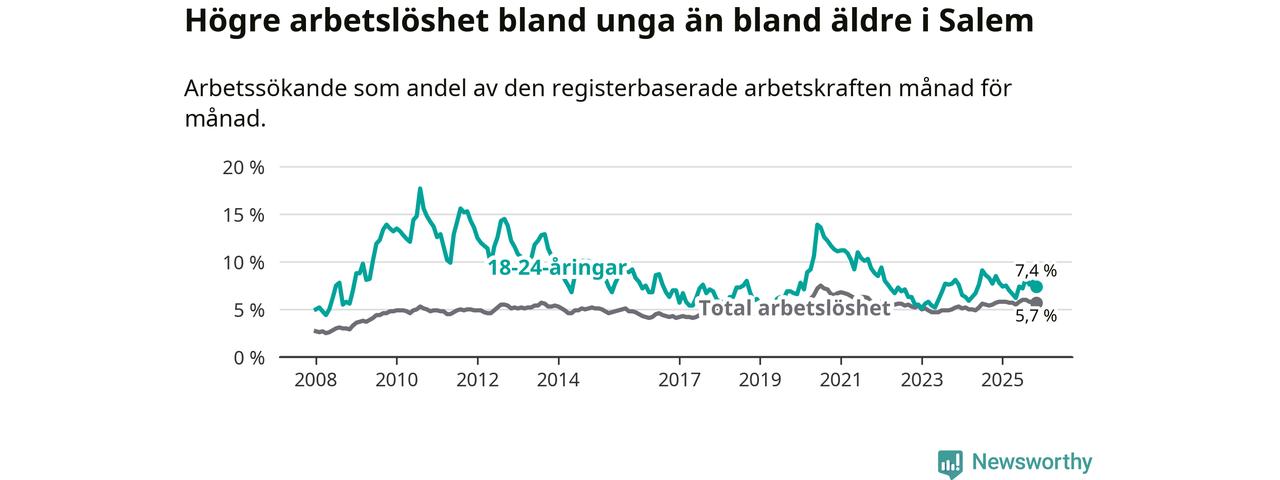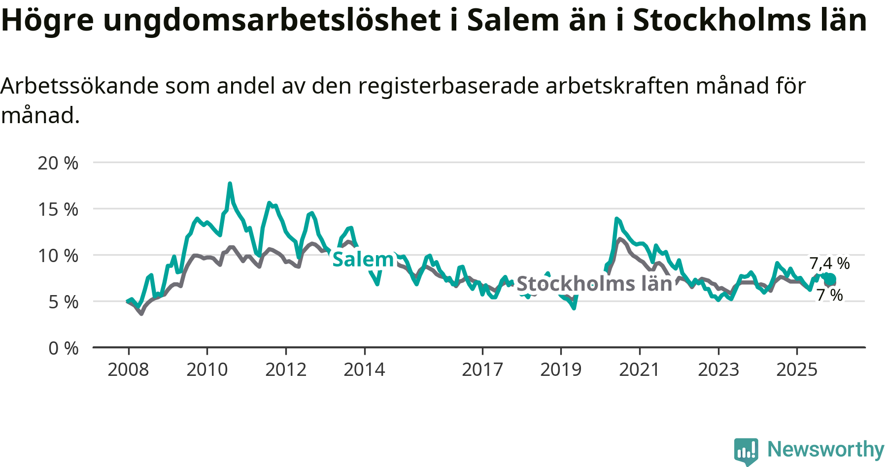 Medan Salem har lägre total arbetslöshet än Stockholms län, ligger ungdomsarbetslösheten 0,4 procentenheter högre i Salem.