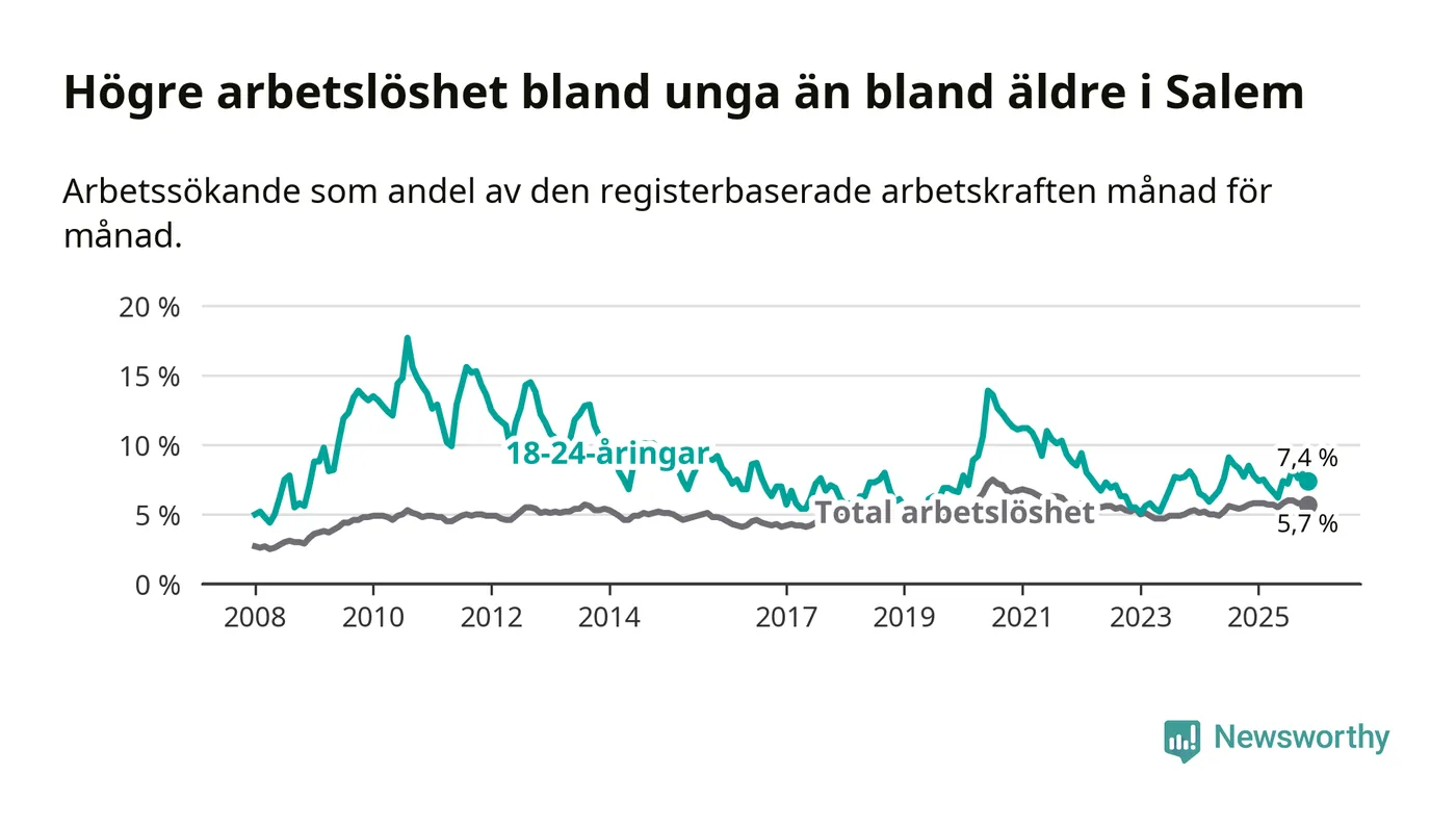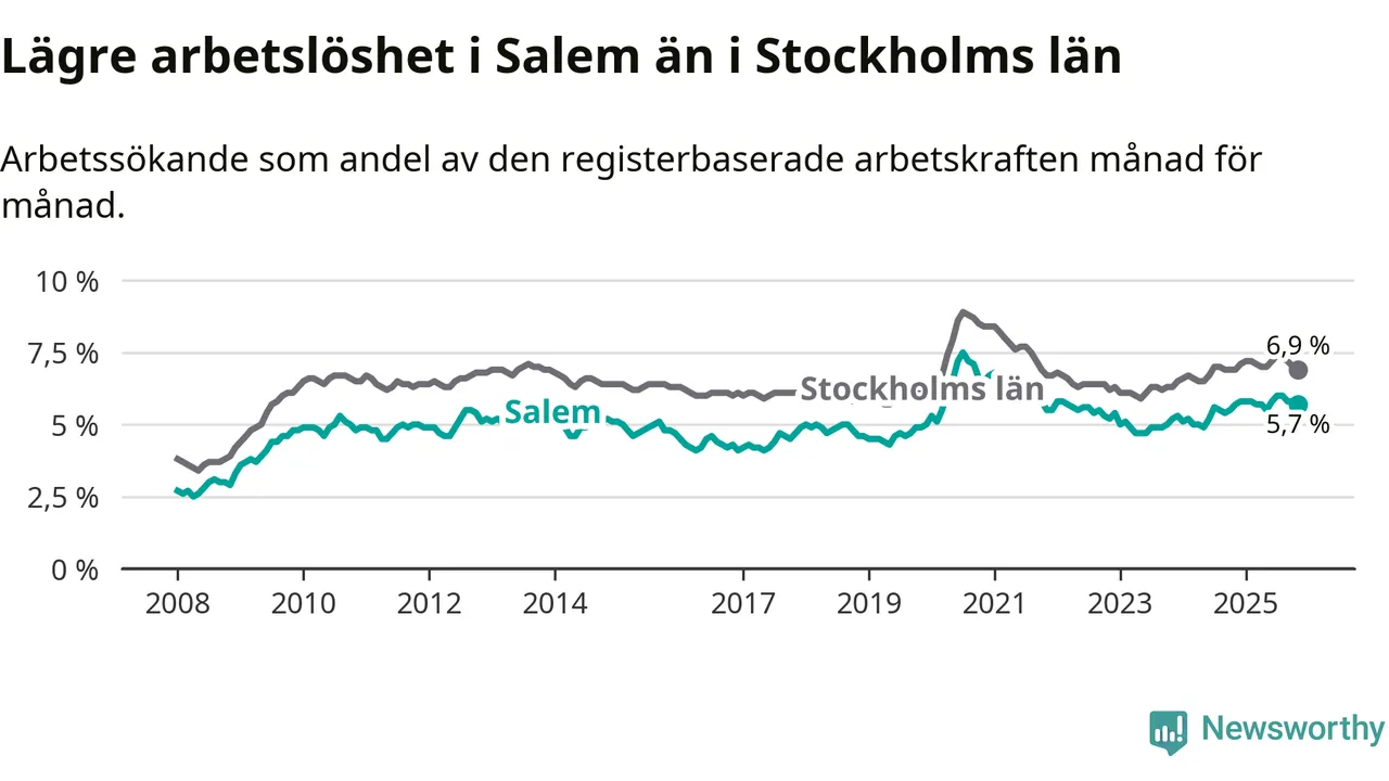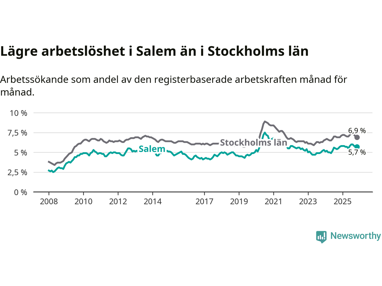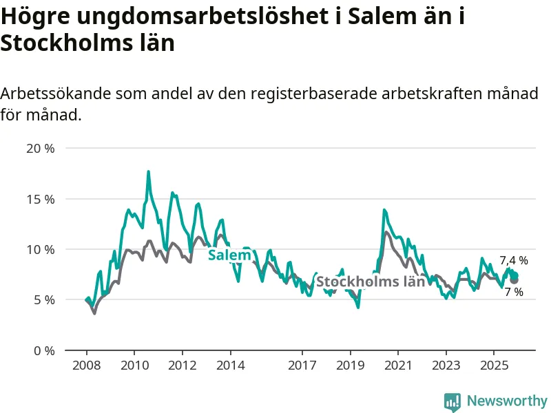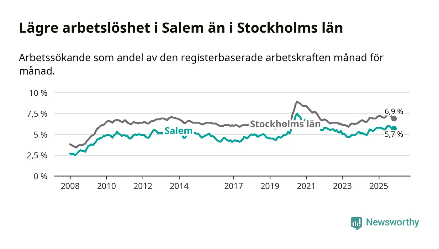 Medan Salem har lägre total arbetslöshet än Stockholms län, ligger ungdomsarbetslösheten 0,4 procentenheter högre i Salem.