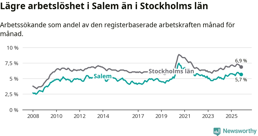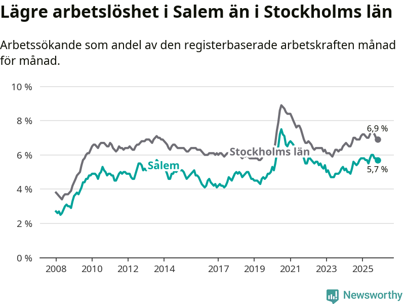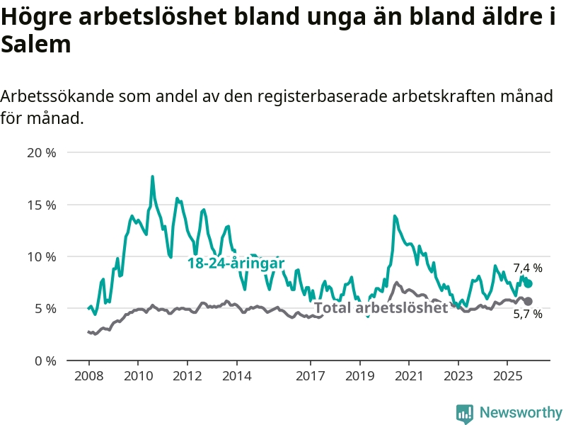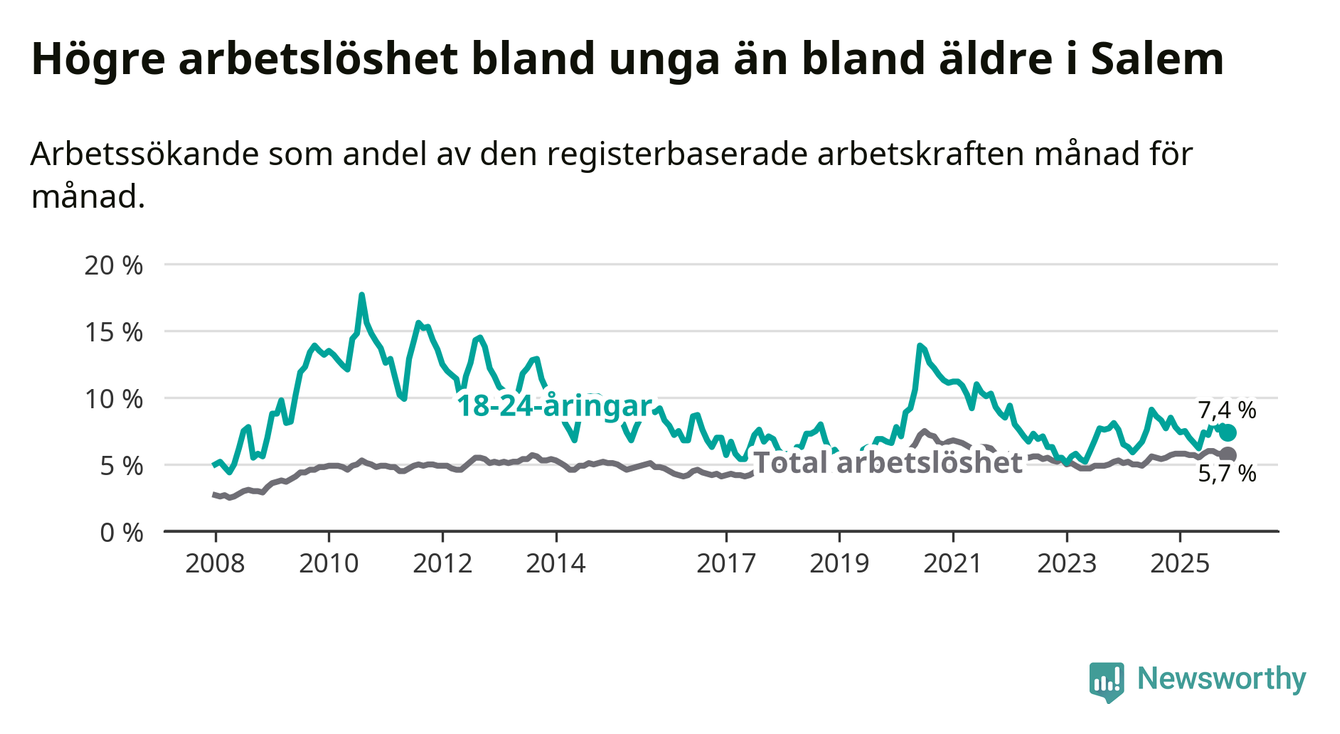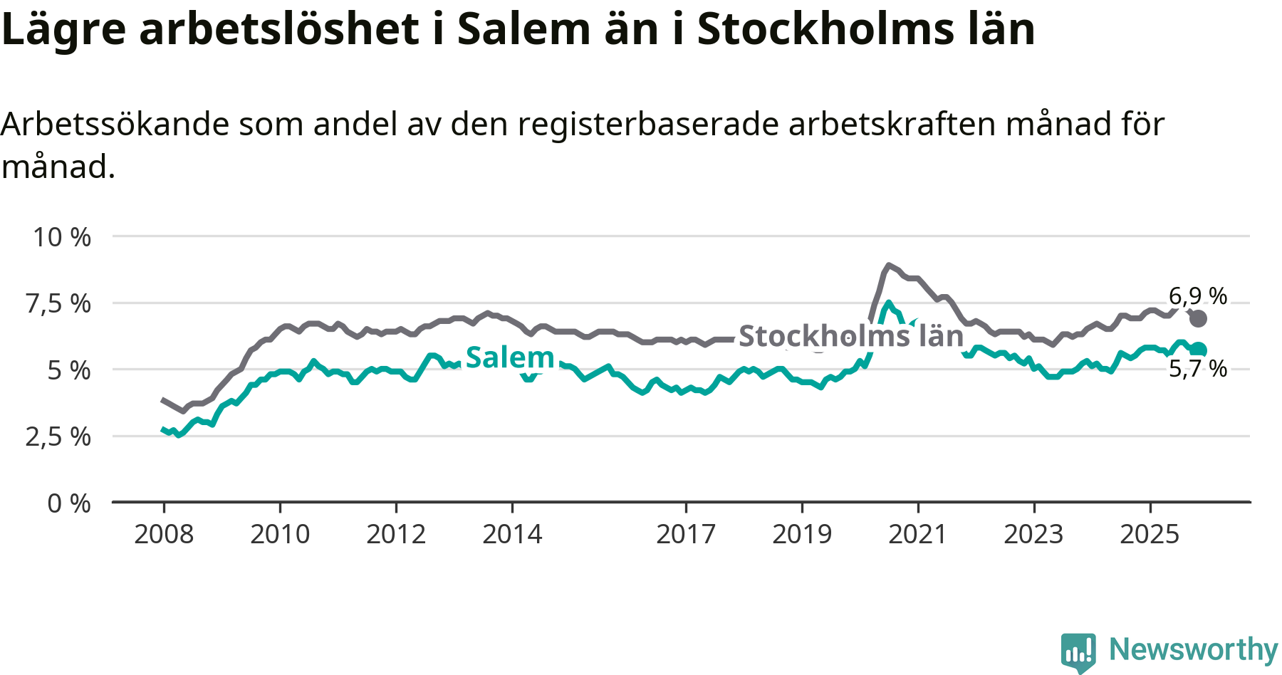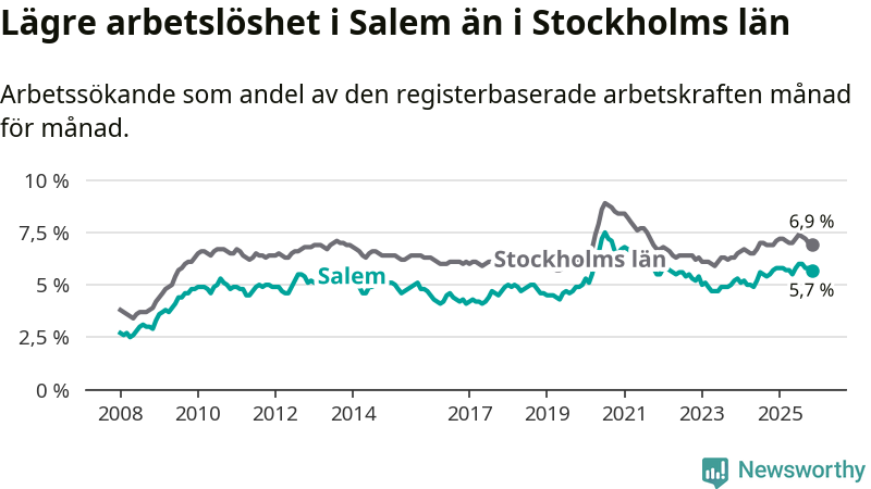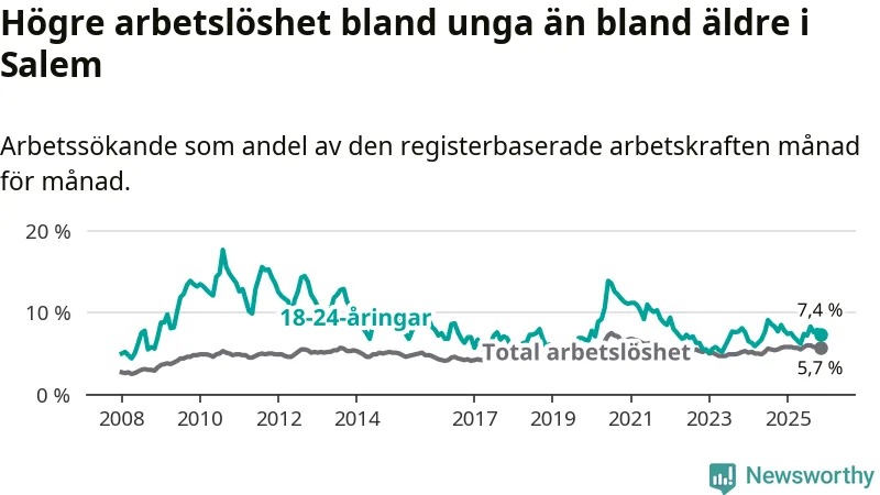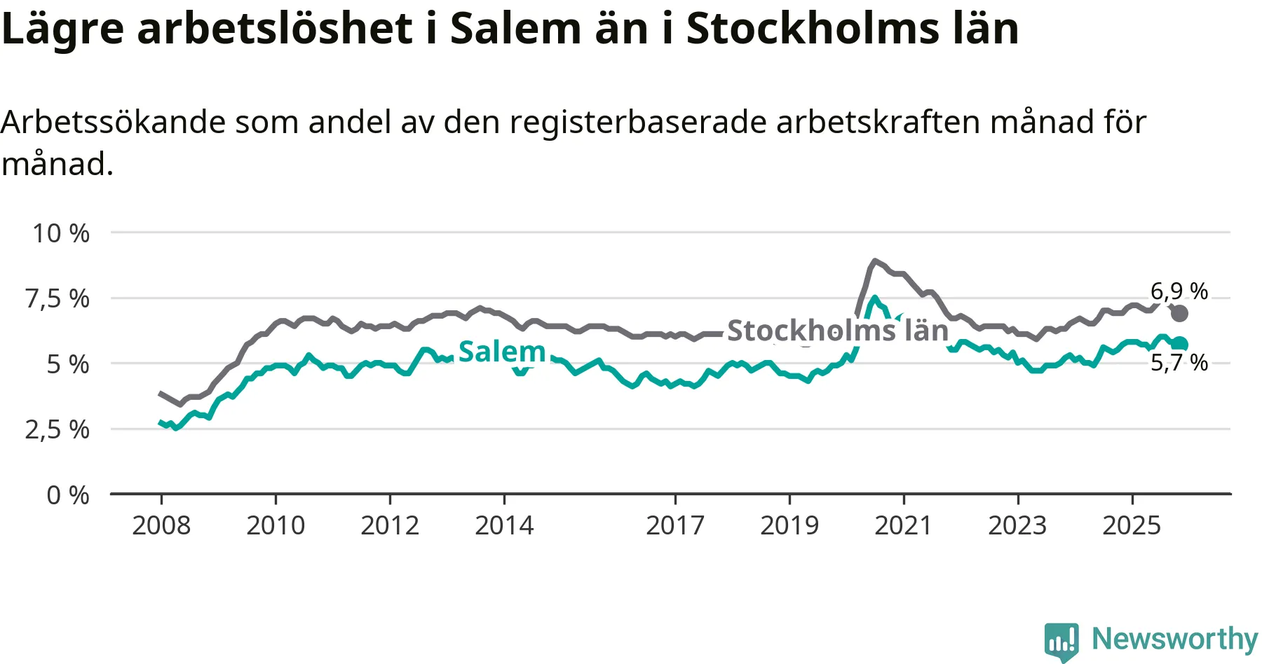 Medan Salem har lägre total arbetslöshet än Stockholms län, ligger ungdomsarbetslösheten 0,4 procentenheter högre i Salem.