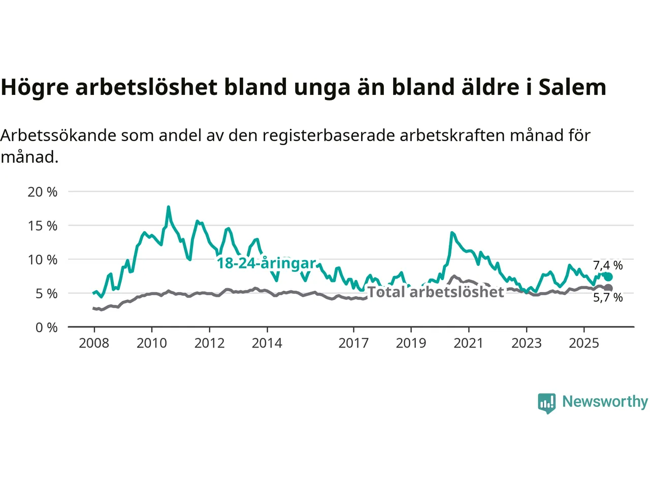 Den senaste månadsstatistiken från Arbetsförmedlingen visar på en nedgång i ungdomsarbetslöshet i Salems kommun med 1,1 procentenheter. Arbetslösheten bland personer i åldern 18–24 år låg i november på 7,4 procent.