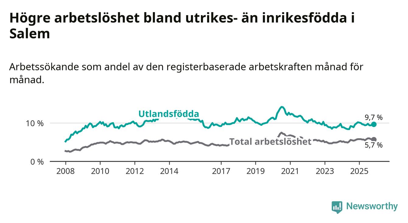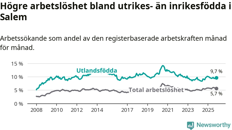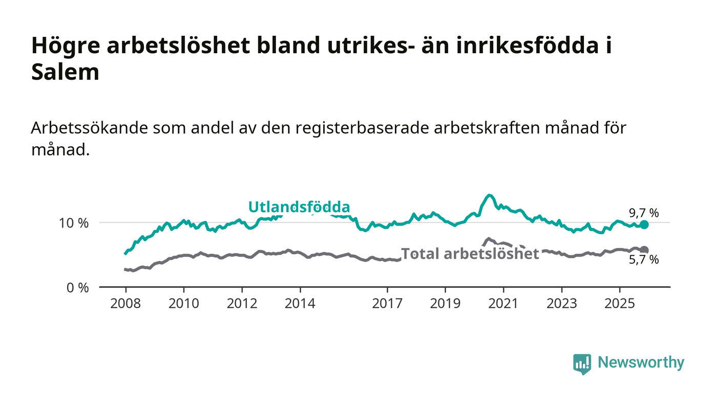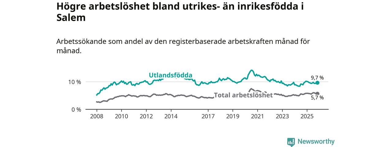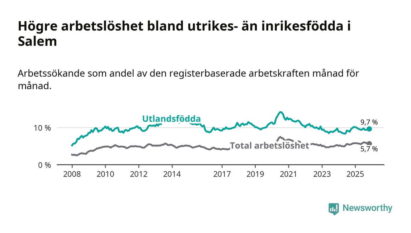 Arbetslösheten bland utlandsfödda var 9,7 procent i Salem under november månad, motsvarande 259 av 2 670 personer. Det är 0,2 procentenheter färre än vid samma tidpunkt i fjol (±0 om man räknar personer). Den senaste månadens nedgång innebär ett trendbrott. Under de ett föregående månaderna hade arbetslösheten bland utlandsfödda varit högre än motsvarande tidpunkt året innan.