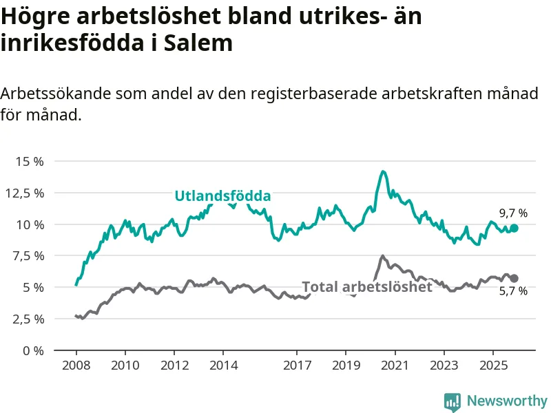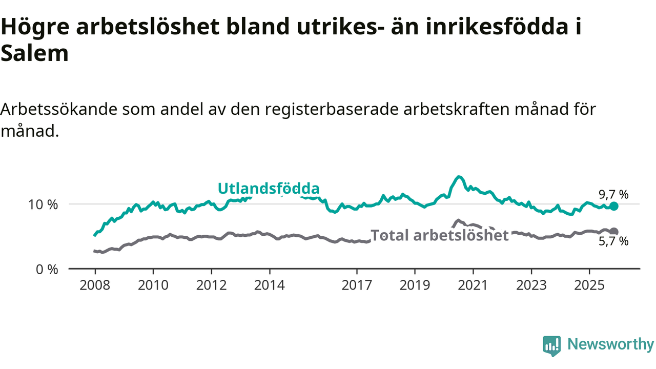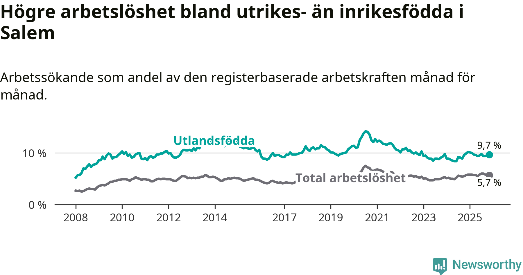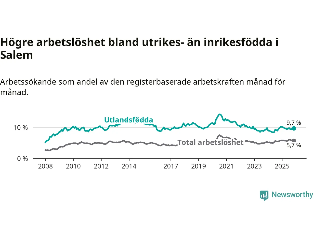 Arbetslösheten bland utlandsfödda var 9,7 procent i Salem under november månad, motsvarande 259 av 2 670 personer. Det är 0,2 procentenheter färre än vid samma tidpunkt i fjol (±0 om man räknar personer). Den senaste månadens nedgång innebär ett trendbrott. Under de ett föregående månaderna hade arbetslösheten bland utlandsfödda varit högre än motsvarande tidpunkt året innan.