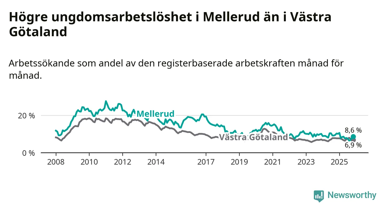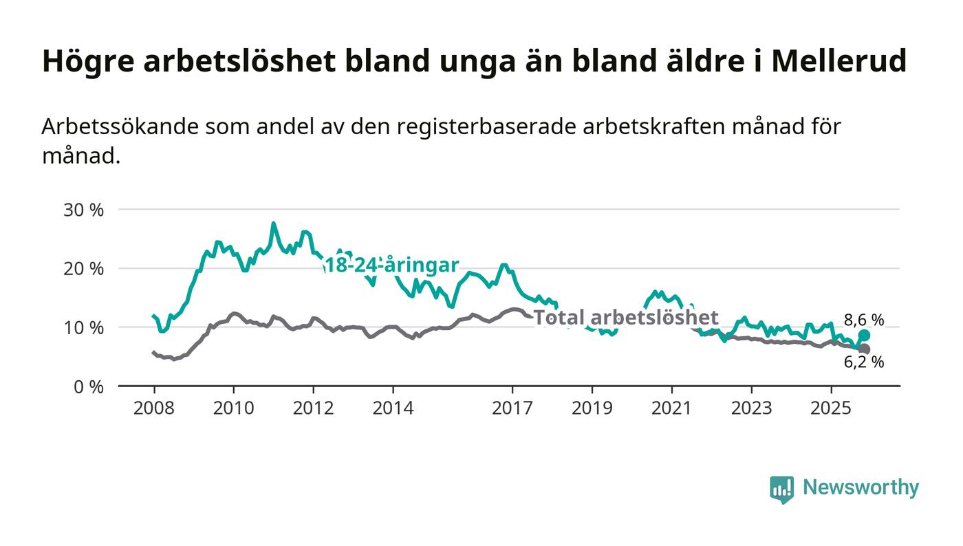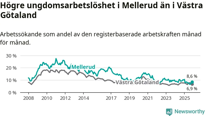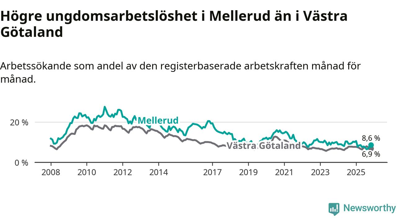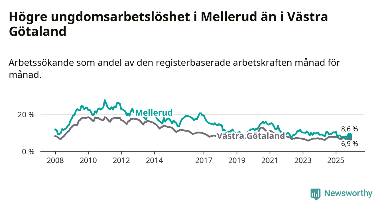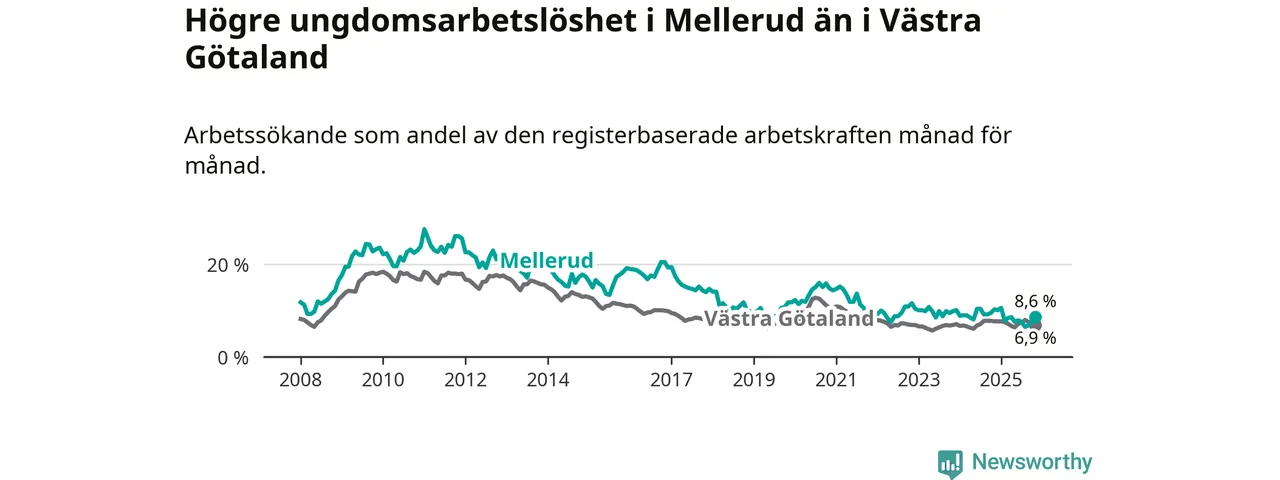 Medan Mellerud har ungefär samma total arbetslöshet som Västra Götaland, ligger ungdomsarbetslösheten 1,7 procentenheter högre i Mellerud.